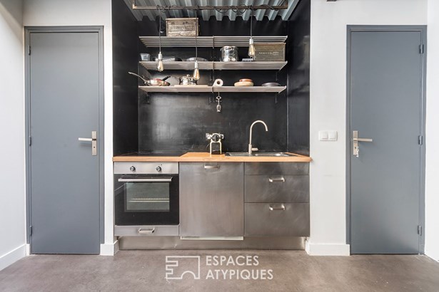 Hidden away from prying eyes, set back from the street, this discreet address reveals a 45 sq m (38.83 sq m Carrez Law) loft, completely reimagined with an industrial feel. From the moment you enter the building, a living wall and a mural announce the unique and artistic character of the space.