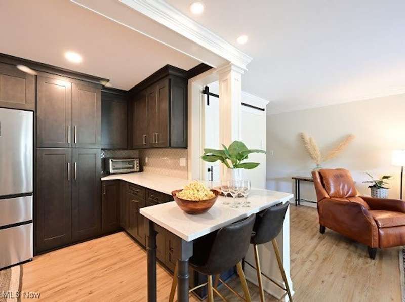 Every inch of this amazing move-in ready 1st floor condo has been completely upgraded and reconfigured. Sunshine streams in through the triple glass sliders in the huge living room leading to a private patio overlooking the pond. The living room and both bedrooms overlook the peaceful pond w/water fountain. The kitchen is a showstopper, with black-stained CNC cabinets, KitchenAid appliances, a Haier refrigerator, and beautiful quartz countertops that carry through to the upgraded bathrooms. The laundry room was reconfigured to create a bigger space, a wall of cabinets and a smarter layout w/a barn door entry in addition to a new breakfast bar w/today's custom columns. LVP was installed throughout the entire home in addition to replacement of all doors to 6 panel doors. Enjoy the amazing wine/coffee bar with unique backsplash, a wine niche and both upper and lower storage. 2 large bedrooms have large windows for viewing the pond. The 2nd has a nice window seat. You will love the community amenities ? 2 swimming pools, walking paths, tennis courts, pickleball and 4 square ? and the location can't be beat! You're just minutes from shopping, the airport, CLE's sports venues and spectacular Lake Erie. Call now for a private showing.