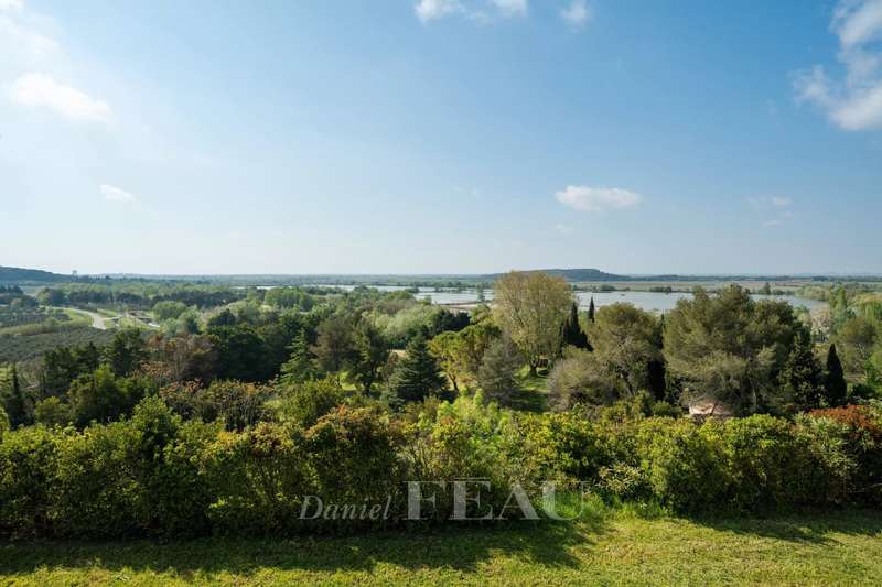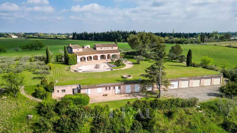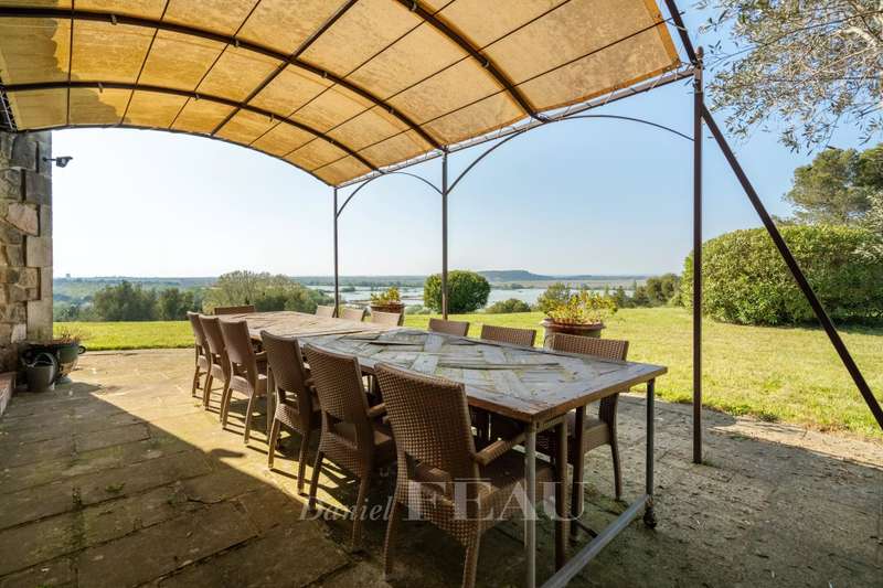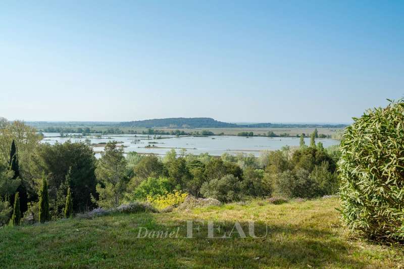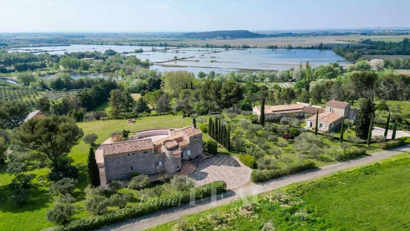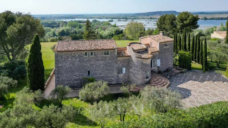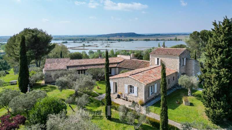 This relatively recent property in an elevated setting surrounded by olive trees commands an exceptional view of a peaceful lake renowned for its migratory bird population, and notable pink flamingos. Mainly on a single floor and in a “U”-shape, it offers about 270 sqm of living space bathed in sunshine and including spacious living/reception rooms and three bedrooms. A guest house benefiting from independent access comprises three further bedrooms, as well as potential to create a home cinema, recreation room etc. With several garages (up to ten cars), a studio apartment and a caretaker’s lodge. A rare opportunity just 5 minutes from delightful Fontvieille and under 10 minutes from the amenities and roads accessing Arles.