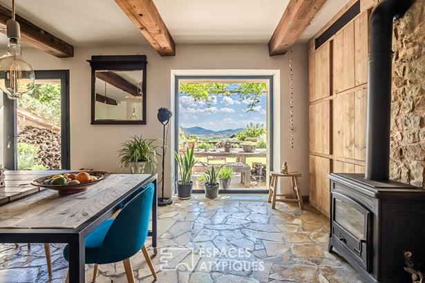 The ground floor houses a bedroom with an en-suite bathroom, an office, and a spacious living area including a living room and kitchen opening onto a private patio, bathed in sunlight and completely unoverlooked. The authentic materials and natural light give the property a soft and welcoming atmosphere.