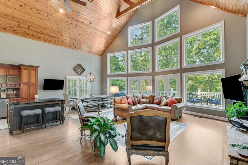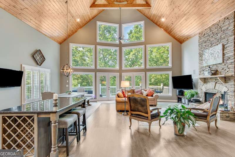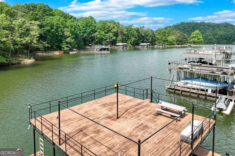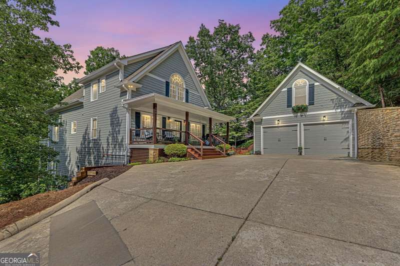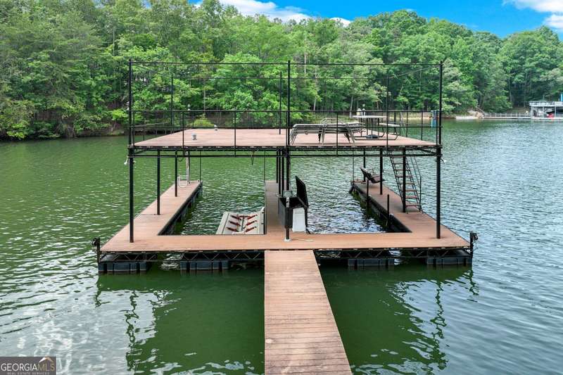 Discover the perfect blend of charm and functionality in this spacious craftsman home on Lake Lanier, offering plenty of room for family and friends! Thoughtfully designed with a resort-style feel, this property features two great rooms with stone fireplaces, two kitchens, and four covered porches ideal for entertaining in every season. Located in a prime Dawsonville spot just 30 minutes north of Atlanta and 15 minutes south of the Dahlonega wineries and fall festivals, this home is nestled in a secluded Lake Lanier neighborhood. Tucked away behind gates in a private three-home enclave, it sits just steps from the water on a protected deep-water cove. Enjoy easy lake access from your private twin-slip dock with a party deck perfect for sunbathing and gatherings, with calm waters ideal for swimming and floating. Inside, the main level features an open floor plan with a two-story vaulted ceiling and stone fireplace, hardwood floors, a spacious kitchen with an island, two bedrooms, and a full bath. The upstairs owner's suite includes a loft sitting area, ideal for a reading nook or office space, and offers serene views. The finished terrace level mirrors the main level layout, complete with a second kitchen, two bedrooms, and a full bath perfect for guests or multi-generational living. The unfinished daylight basement offers even more potential for game rooms, storage, or lake toys. A detached two-car garage with an upstairs storage room adds extra flexibility. With ample parking for trailers and visitors, the shared gated driveway serves just three homes. No HOA, but residents share annual maintenance costs (approximately $600-700 per year) for the gate and common landscaping. Ideal for full-time living or Airbnb potential, this home offers a unique opportunity to enjoy the best of lake life!