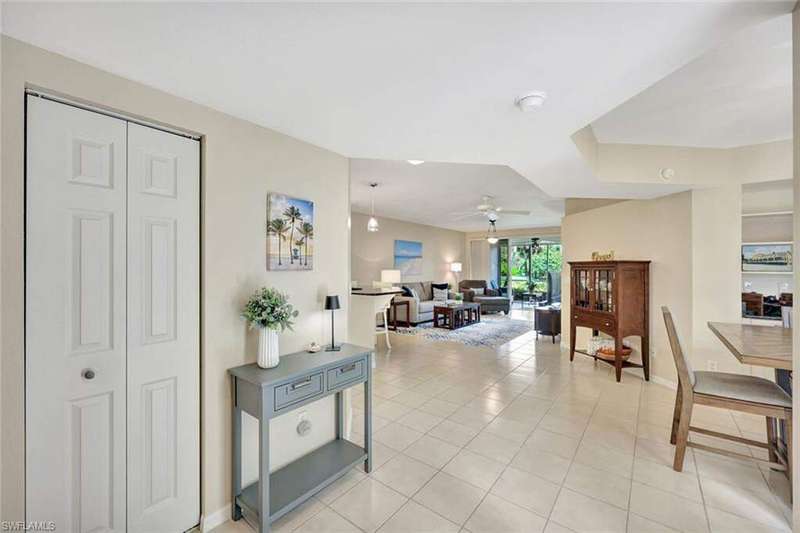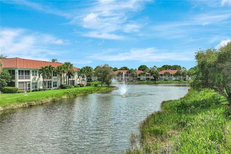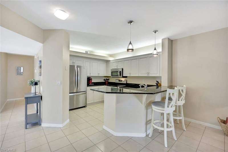 LAKE VIEW & TURNKEY! This 2 bedroom/2 bath first-floor condo is open and welcoming. The perfect mix of comfort, style, and convenience for SWFL living. Through the front door the open floor plan offers an abundance of natural light and a neutral color palette that is the perfect backdrop for any decor. The kitchen boast crisp white cabinetry, stunning dark granite countertops, newer stainless steel appliances, and generous storage paired across from the formal dining area with built in Buffet for additional storage. The primary suite offers serene lake and fountain views and ensuite bath features dual raised vanities and upgraded walk-in shower with frameless glass door. The lanai has been enclosed and fitted with IMPACT sliding glass doors, expanding your living space and allowing you to enjoy rain or shine. This condo also has a newer Air Conditioner and newer Water Heater! Stone-coated steel roofs replaced community-wide in 2020 for peace of mind and durability. ResortStyle Living at Lighthouse Bay: This gated community is packed with amenities, including:5 pools, including a lap pool 2.5miles of walking/jogging paths A robust bocce program Tennis courts with a pro on staff 2 boat houses, a fitness center, sauna, clubhouse, and library Arts & Learning Center and more! As a bonus, a Bronze Membership to the Brooks Commons Club is included, granting access to a private restaurant, enrichment center, pickleball, vibrant social programs, and more. Prime Location. Enjoy being just minutes from Coconut Point Mall, dining, entertainment, SWFL International Airport, and pristine beaches!