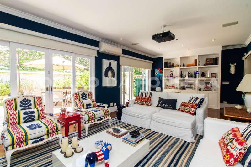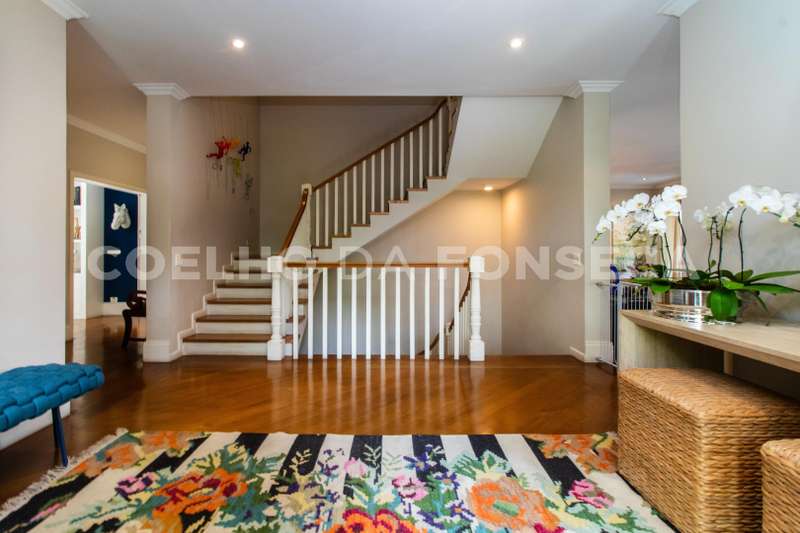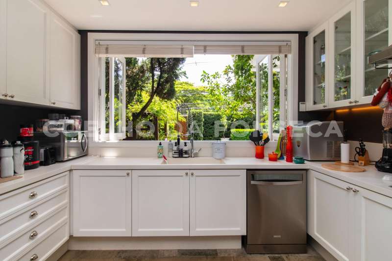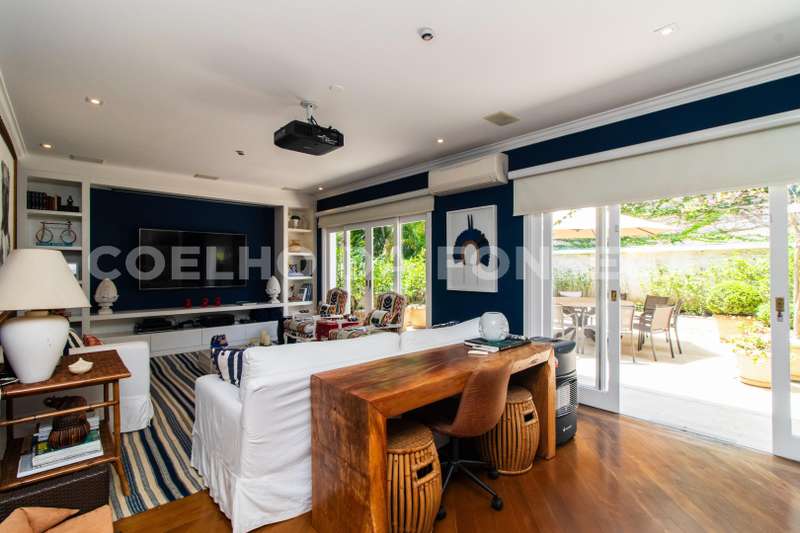 Localizada de frente para uma praça, com monitoramento 24 horas, esta casa conta com portão automático, porta blindada, sistema de alarme e circuito interno de TV. Possui diversos ambientes, incluindo sala de estar, de jantar, escritório, terraço, home theater, cozinha gourmet, pergolado de madeira no jardim estilo italiano, piscina, churrasqueira, quatro suítes e uma sala íntima no andar superior.