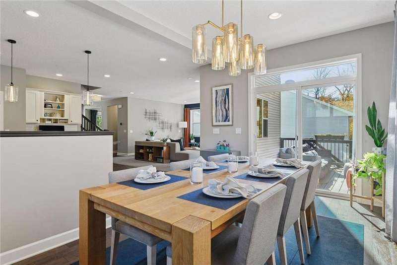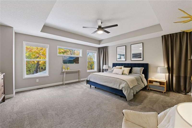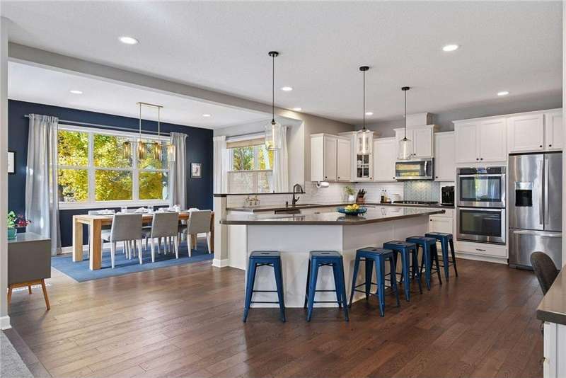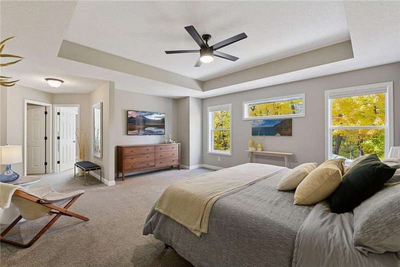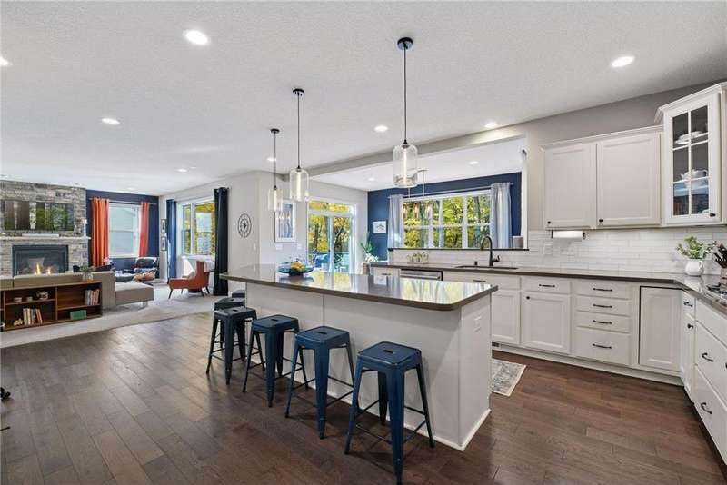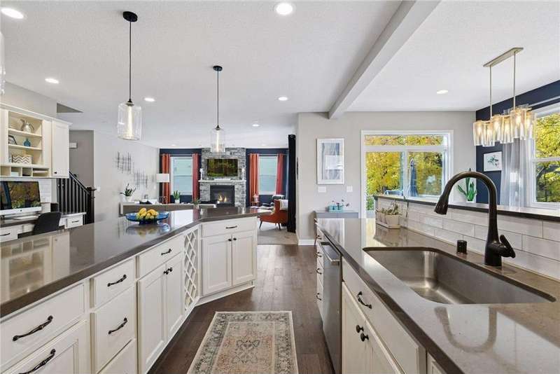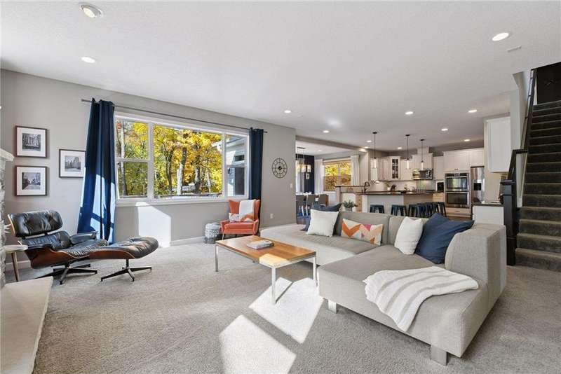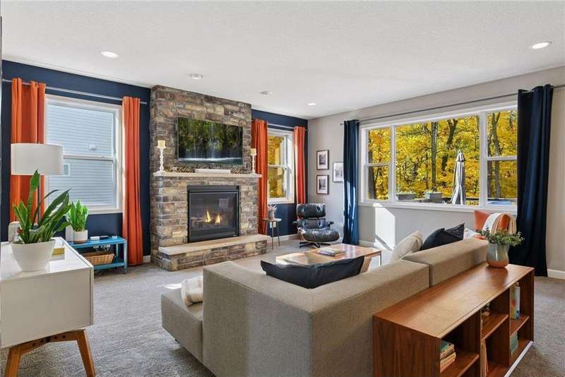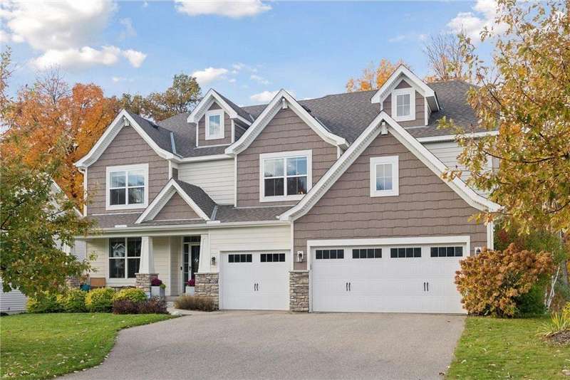 Located on a premier lot with a deep, fenced backyard and sunset views, this home features the largest floor plan in the neighborhood. Walls of windows fill the interior with natural light and capture scenic views. The open main level includes a stone-surround fireplace and a chef’s kitchen with a large island, double ovens, stainless appliances, stone countertops, ample cabinetry, and pantry. The dining area opens to a spacious, low-maintenance deck. Main-floor bedroom and office offer flexible living options. Upstairs includes a loft, four bedrooms, three full baths, and a convenient laundry room. The primary suite features a tray ceiling, walk-in closet, and private bath with dual vanities, jetted tub, and tiled shower. The walkout lower level, finished in 2021, offers 9’ ceilings, family/media space, amusement area, wet bar with full-size refrigerator, plus a sixth bedroom and ¾ bath. The fenced backyard includes a firepit area for outdoor enjoyment. Close to Lake Minnetonka amenities with convenient bus access to Westonka and Orono schools.