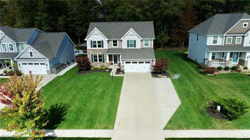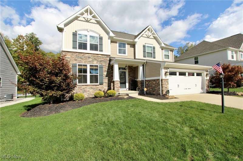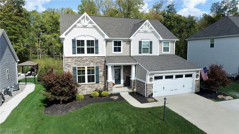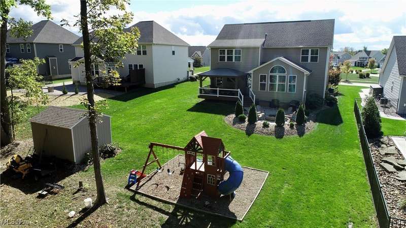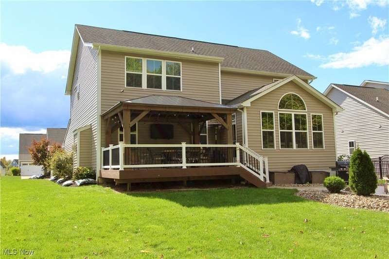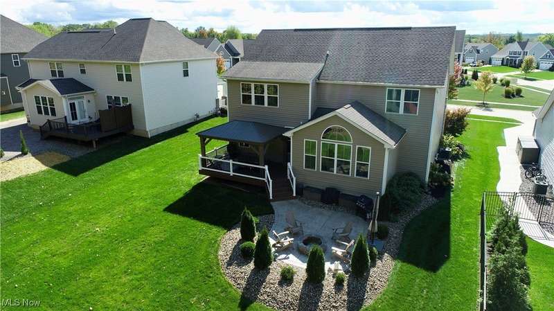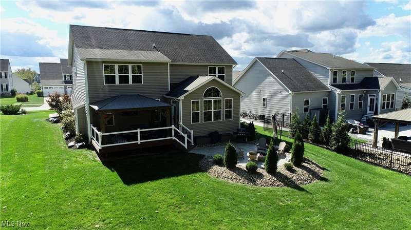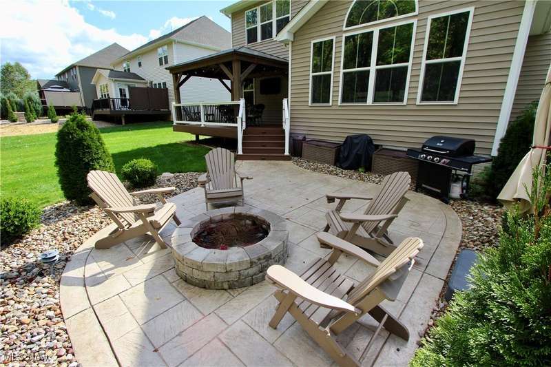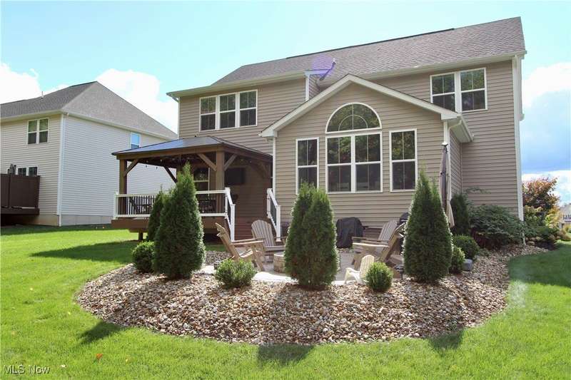 Discover this stunning 2019-built, four-bedroom, 2.5-bath home nestled in the desirable Weymouth Crossing development in Medina, Ohio. This modern residence offers spacious living with an open floor plan, featuring an oversized kitchen island perfect for family gatherings and entertaining. Enjoy the beautifully landscaped yard with lawn irrigation system, and entertain outdoors on the pergola-covered TimberTech deck and stamped concrete patio, complete with an outdoor fire ring and seating area-ideal for relaxing and hosting guests. The home is equipped with a security system and a full basement, ready to be finished with hookups for a full bathroom, providing ample potential for additional living space. Ideally situated in a fantastic area that backs up directly to Weymouth Country Club. Combining stylish design, outdoor features, and modern conveniences, this home truly has it all.