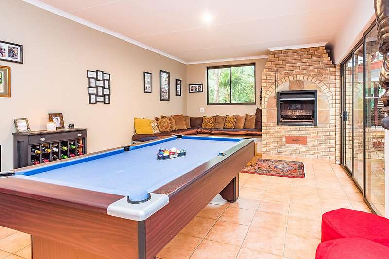 Games room with Snooker table and Foosball/Table soccer, built in braai fireplace, and lounge.