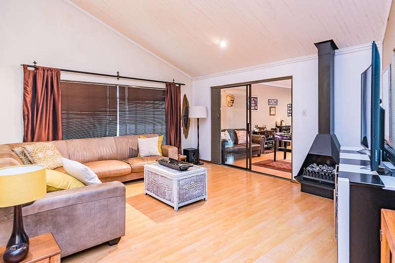 Open plan to built in bar, fireplace and sliding doors onto pool area.