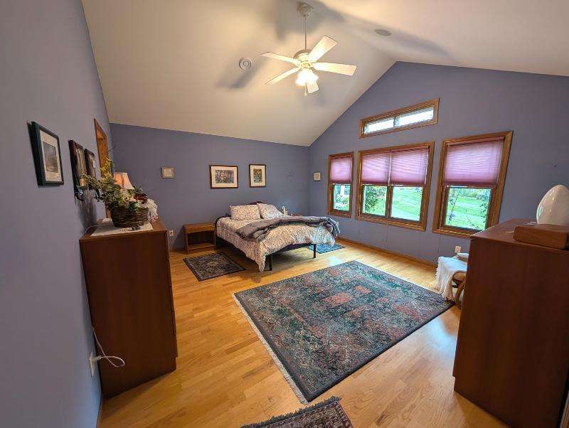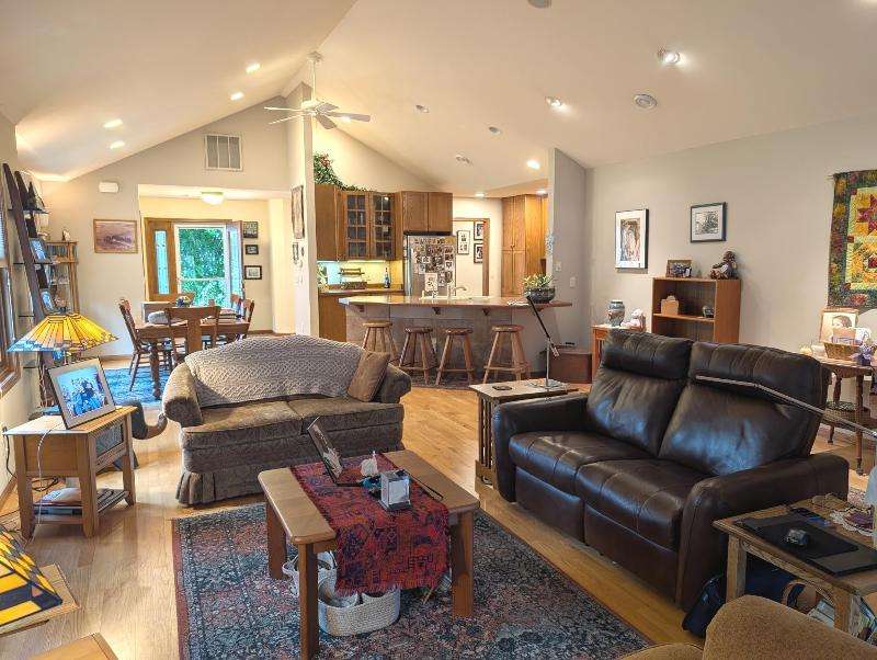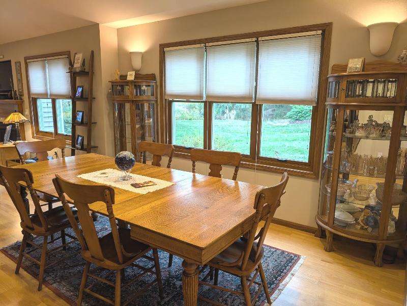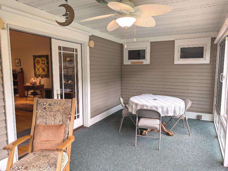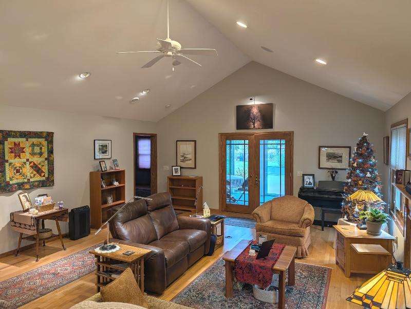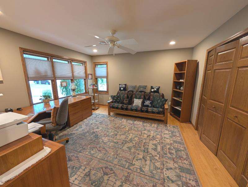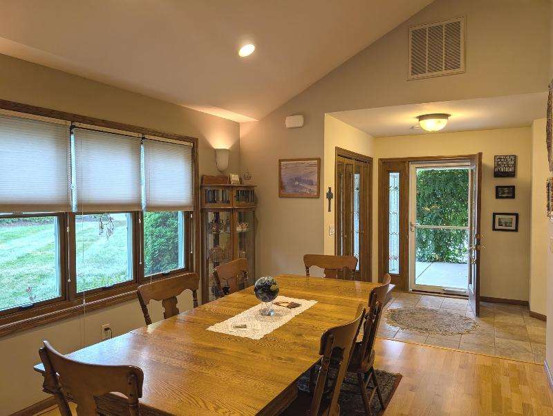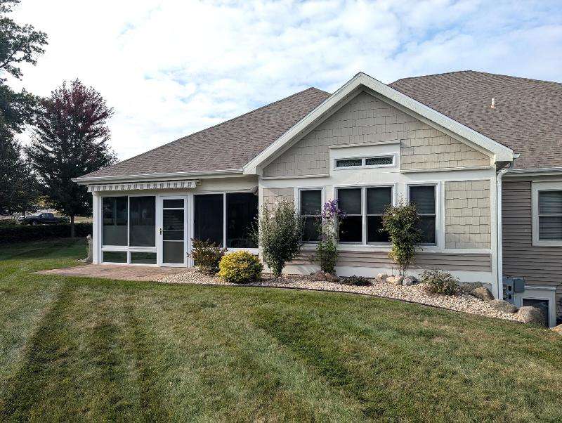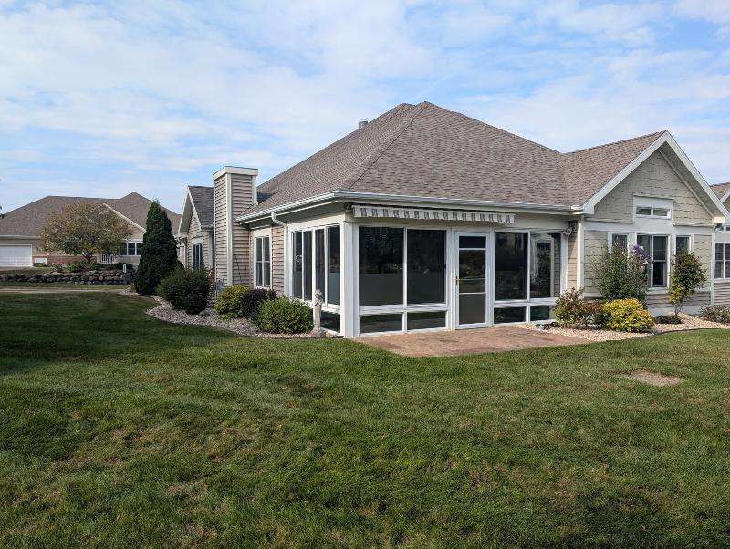One-owner, custom ranch nestled by peaceful ponds & green space. Open floor plan, radiant in-floor heat, vaulted ceilings, & French doors to a 3-season room & patio with retracting awning. Kitchen with oak cabinetry, handy breakfast bar, & plenty of storage. Designed with accessibility in mind, everything is on one level with wide hallways, pocket doors, level entrances, and a flat lot. The second bedroom is currently being used as an office. The garage has built-in cabinets, attic storage with drop-down stairs, & a gas range/oven. Recent upgrades: Boiler (2019), Central Air & Pella Windows (2020), & Microwave (2024). Step outside and take in wide, beautiful views of mature trees, lush landscaping, & two tranquil ponds. A little piece of heaven--in the middle of it all!