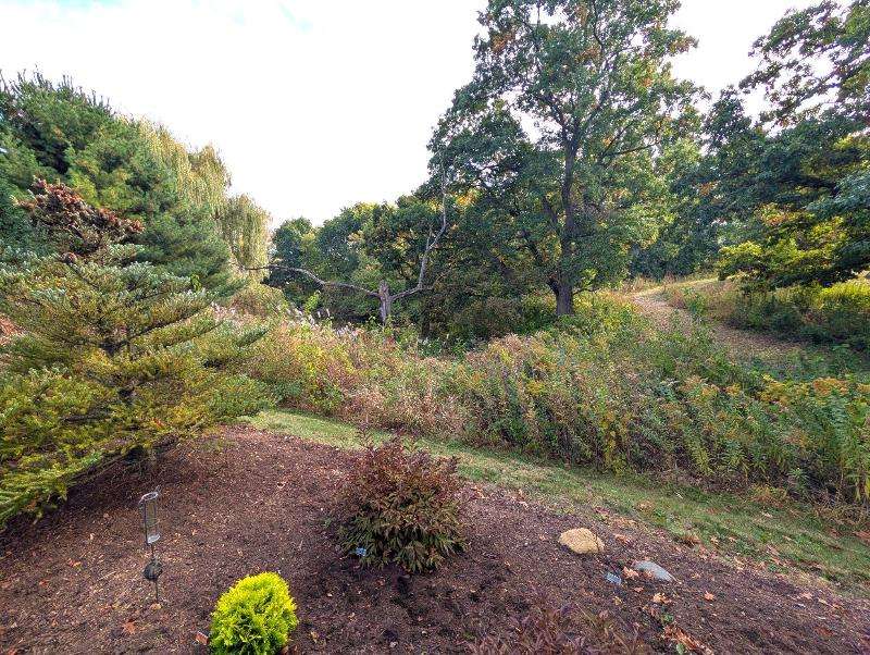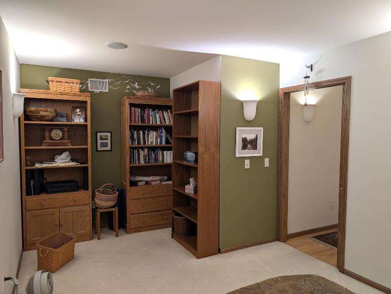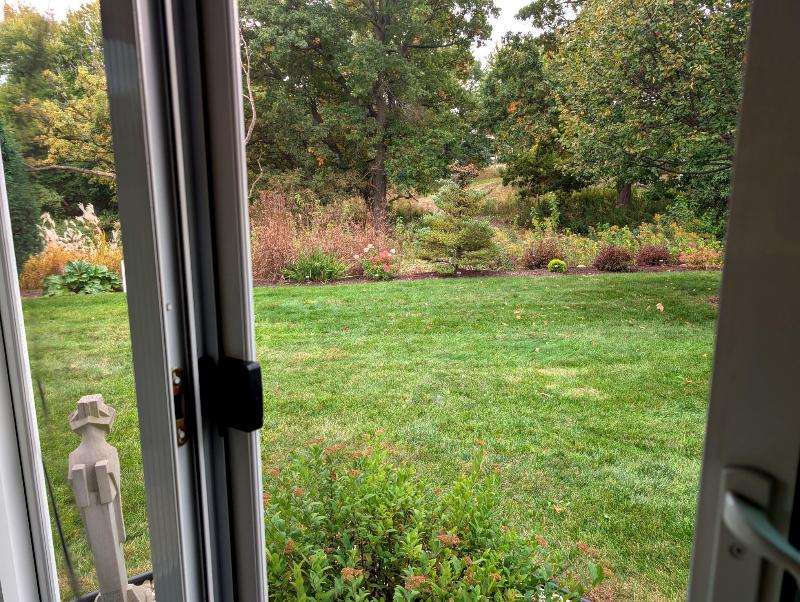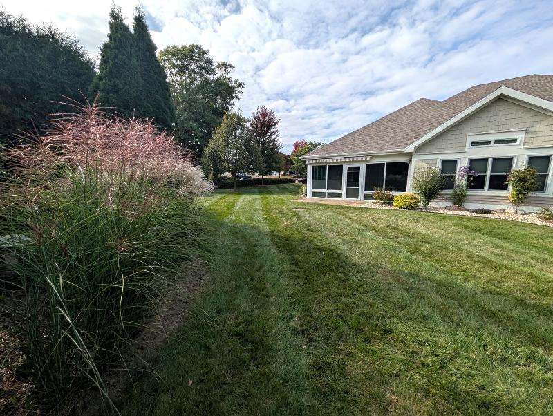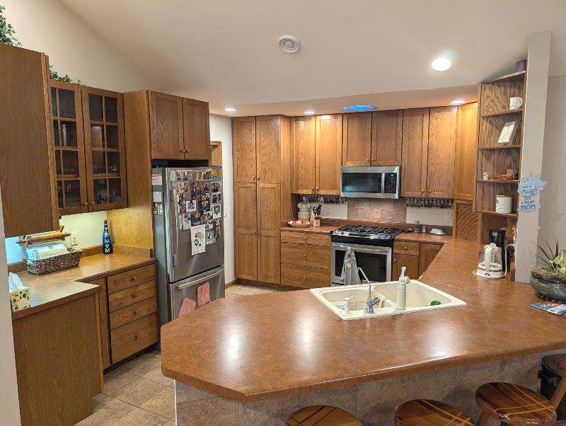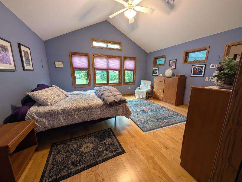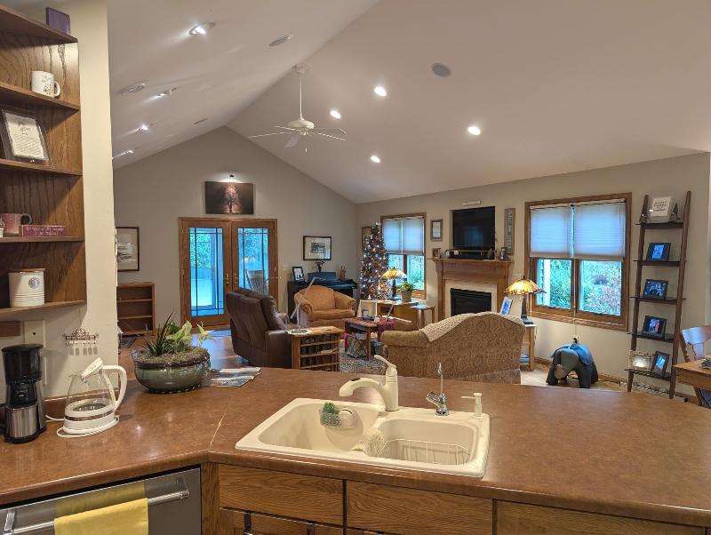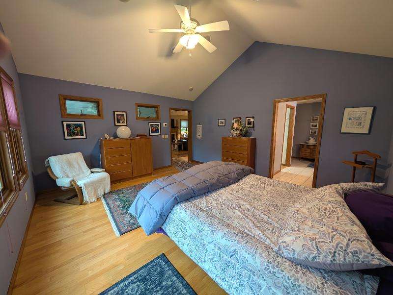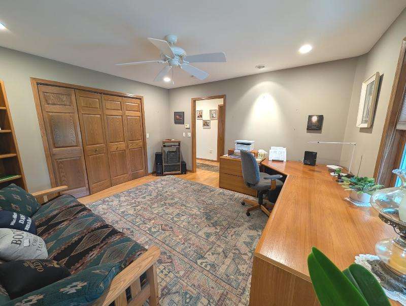 One-owner, custom ranch nestled by peaceful ponds & green space. Open floor plan, radiant in-floor heat, vaulted ceilings, & French doors to a 3-season room & patio with retracting awning. Kitchen with oak cabinetry, handy breakfast bar, & plenty of storage. Designed with accessibility in mind, everything is on one level with wide hallways, pocket doors, level entrances, and a flat lot. The second bedroom is currently being used as an office. The garage has built-in cabinets, attic storage with drop-down stairs, & a gas range/oven. Recent upgrades: Boiler (2019), Central Air & Pella Windows (2020), & Microwave (2024). Step outside and take in wide, beautiful views of mature trees, lush landscaping, & two tranquil ponds. A little piece of heaven--in the middle of it all!