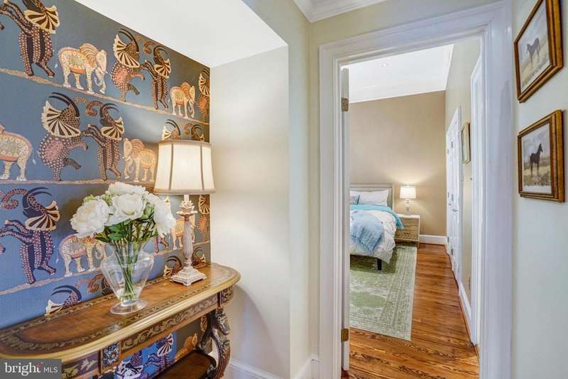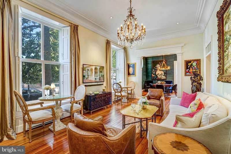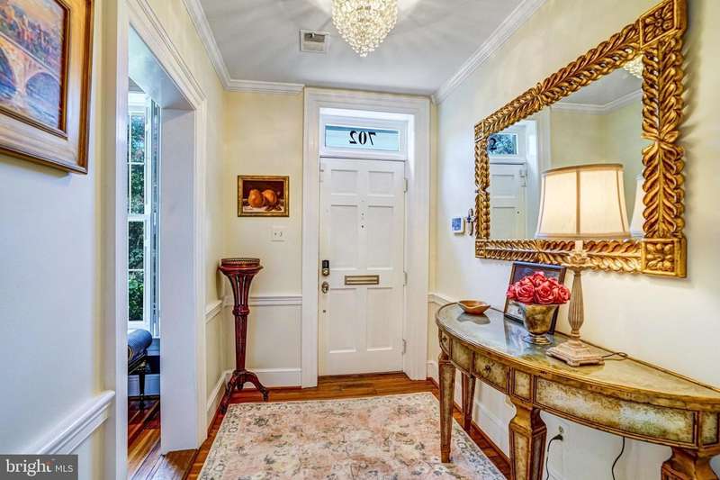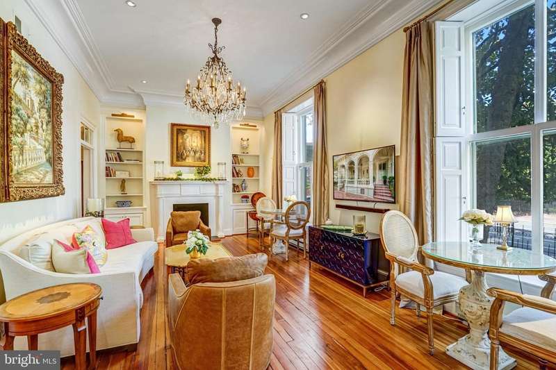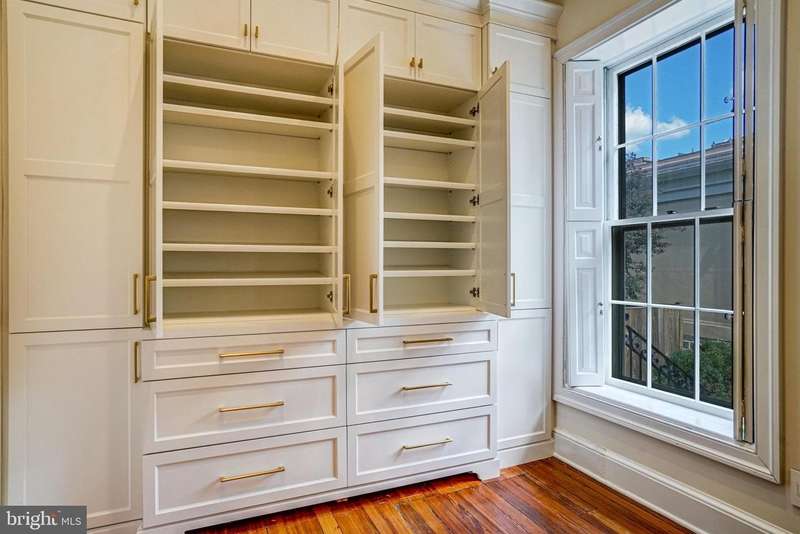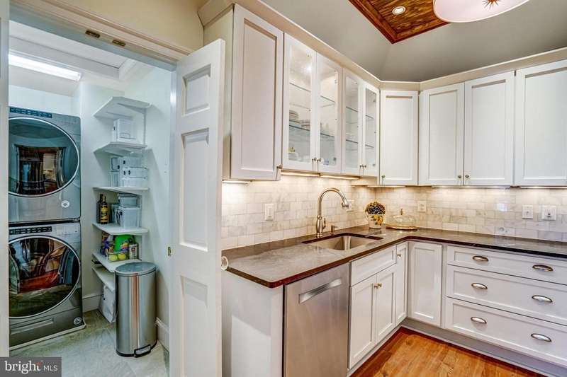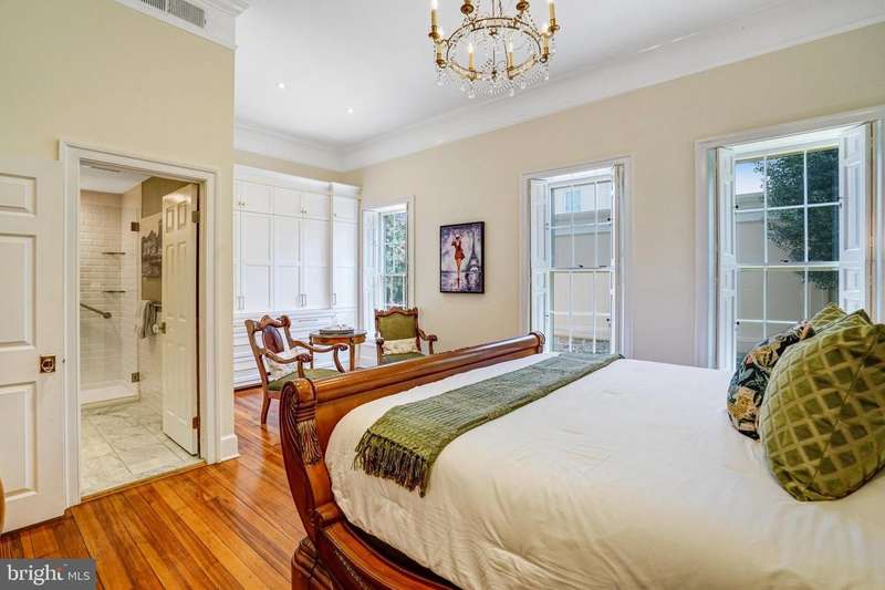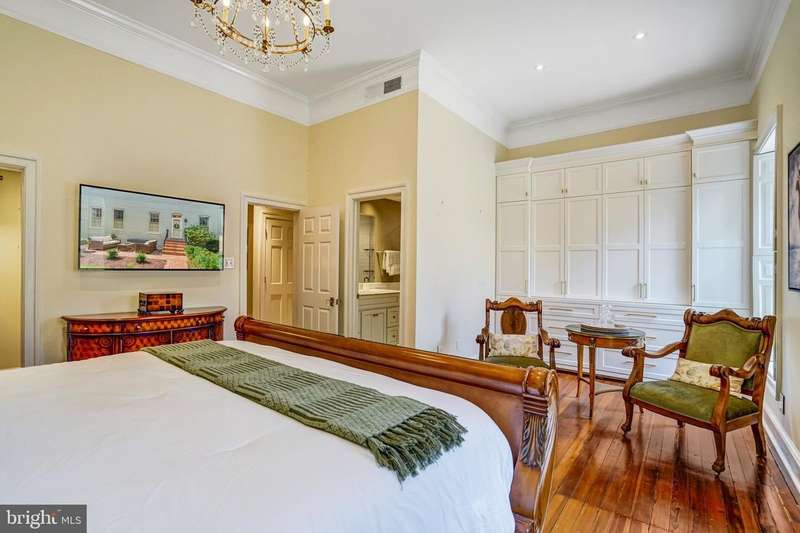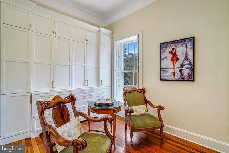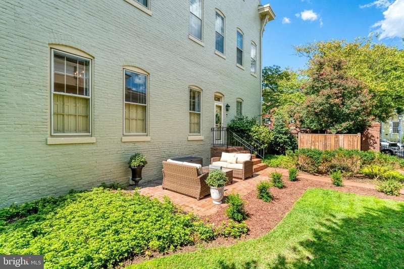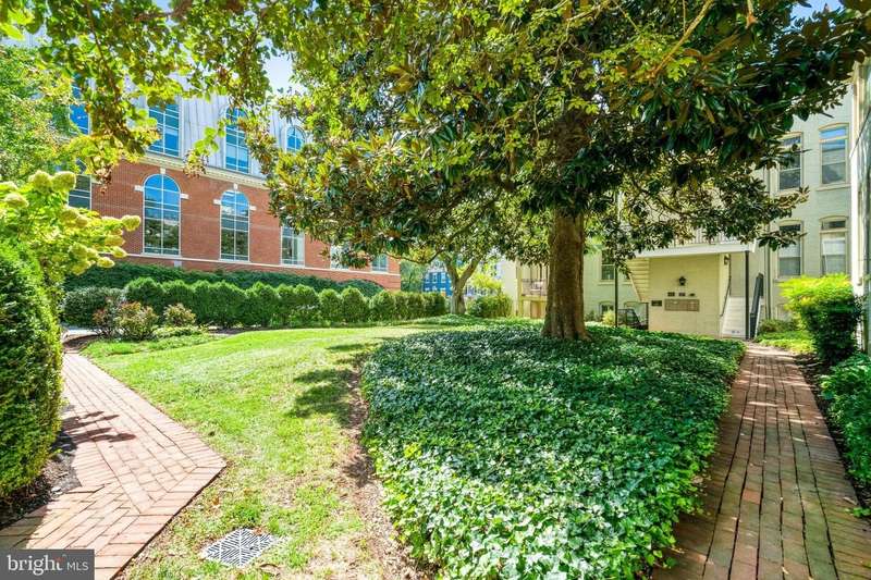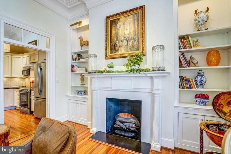 Perfectly positioned in the heart of Old Town, this exceptional Swann Daingerfield condo offers the rare convenience of single-level living on the main floor, complete with a private brick patio framed by lush plantings. The living room showcases over 11-foot ceilings, striking 8-foot windows, a fireplace flanked by custom bookcases, and original heart pine floors that accentuate the historic millwork. An adjacent dining room, featuring another tall window and a dramatic oval window, creates a breathtaking setting elevated by custom wine bar cabinetry. The chef's kitchen exudes character with a shiplap ceiling, soapstone counters, high-end appliances including Bosch stove and dishwasher, and a stylish backsplash. A hall lined with storage closets leads to two generous bedroom suites overlooking the gardens. The primary suite delights with an enormous walk-in closet and a beautifully renovated bath. A wall of custom cabinetry allows for even more primary room storage needs. The second suite also includes a wall of custom cabinetry, as well as ample closet storage, and updated private bathroom. Additional conveniences include a deeded assigned parking space (#2) and a private lower-level 10 x 8 foot storage unit for oversized belongings. This home masterfully blends the Old Town elegance with modern comforts-soaring ceilings, massive windows, and thoughtful renovations-making it truly one-of-a-kind. Built in 1802, own a piece of history at Swann Dangerfield condominium. Just moments away from the phenomenal restaurants and shopping that Old Town Alexandria has to offer.