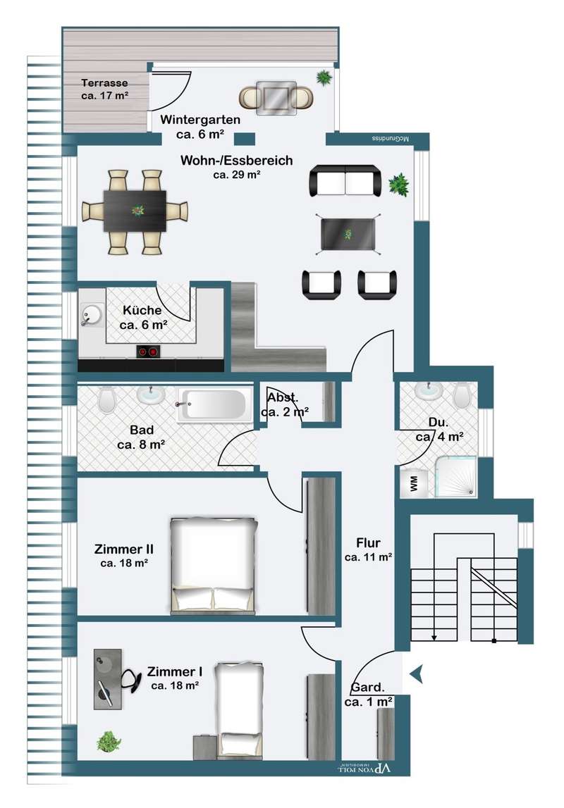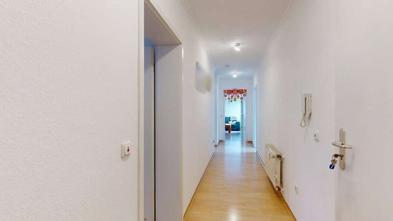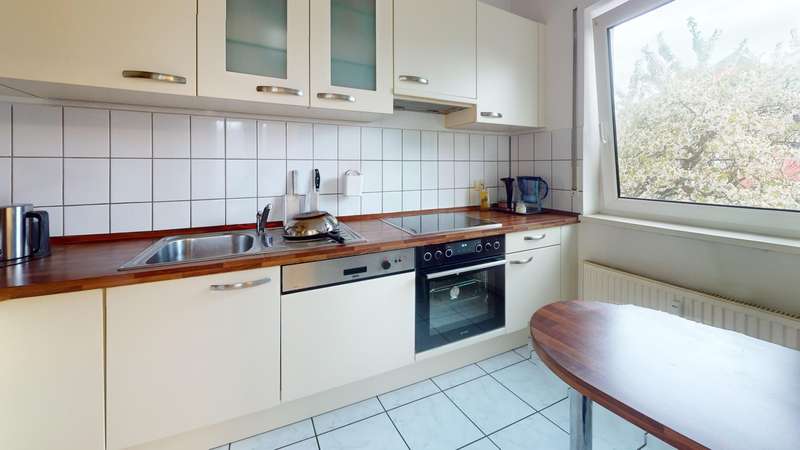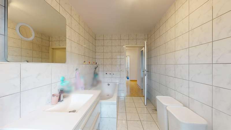 A well-kept apartment is for sale, which was built in 1999 and was last partially modernized in 2019. This spacious apartment offers a living space of around 110 m² and has three rooms. With two bedrooms and two bathrooms, the apartment is ideal for couples or small families who appreciate the comfort of a well-designed apartment. Upon entering the apartment, you are greeted by an inviting hallway that offers plenty of space for a wardrobe and personal belongings. The living area is spacious and allows for versatile furnishing options. The integrated fitted kitchen is equipped with all the necessary appliances and offers plenty of storage space. Stone tiles give the kitchen and sanitary areas an attractive and easy-care look. A special highlight of the apartment is the light-flooded conservatory, which provides access to the terrace. Here you can spend relaxing hours and enjoy the view of the greenery. The double-glazed plastic windows ensure optimum thermal insulation and a pleasant indoor climate at any time of year. The brightly designed daylight bathroom is equipped with modern fittings and invites you to relax after a long day. A further shower room offers additional comfort and flexibility. Both bathrooms are functionally and stylishly furnished. Additional storage space is provided by a practical storage room within the apartment, in which household utensils can be conveniently stored. The apartment has an allocated double parking space, which offers secure parking for two vehicles. The furnishings of the apartment are of a standard quality and underline its functionality and practicality. The property is heated by an efficient central heating system, which provides cozy warmth on cold days. This detail contributes to a pleasant living comfort and enables an economical use of energy. The apartment is in a well-kept condition thanks to ongoing maintenance and modernization in 2019. During this phase, key elements of the apartment were brought up to date to meet the requirements of today's living needs. The building in which the apartment is located is fully finished and integrates harmoniously into the neighborhood. The property offers a pleasant living atmosphere in a quiet environment, allowing potential buyers to benefit from an ideal balance between tranquillity and urban accessibility.