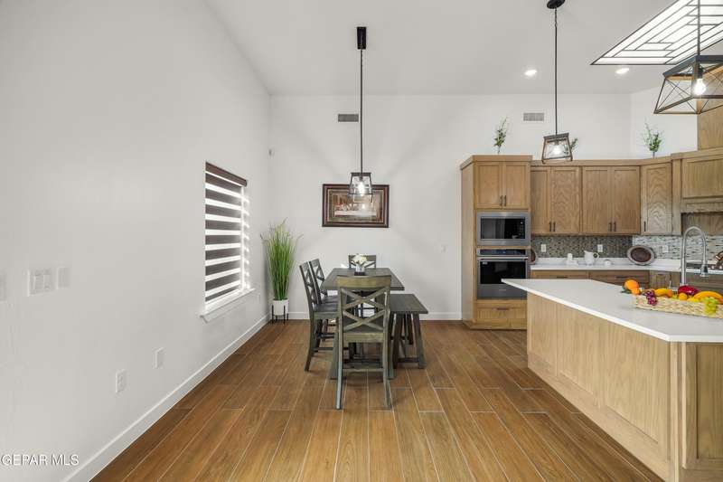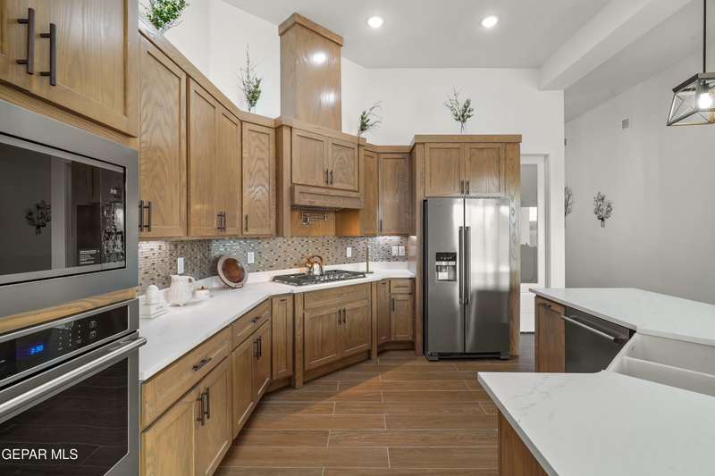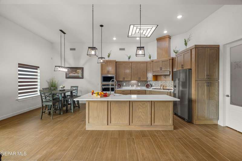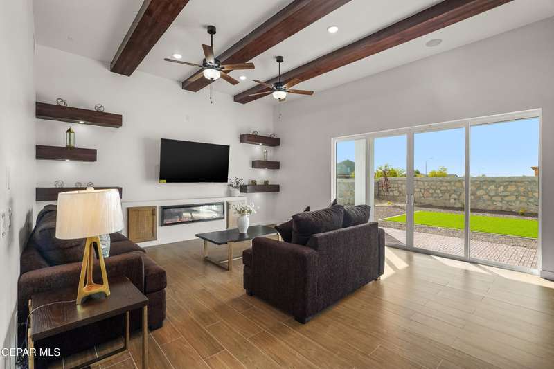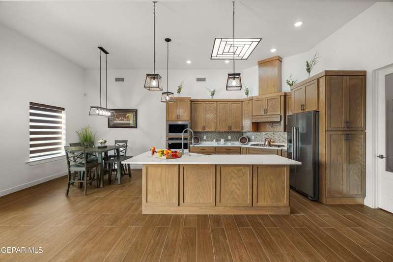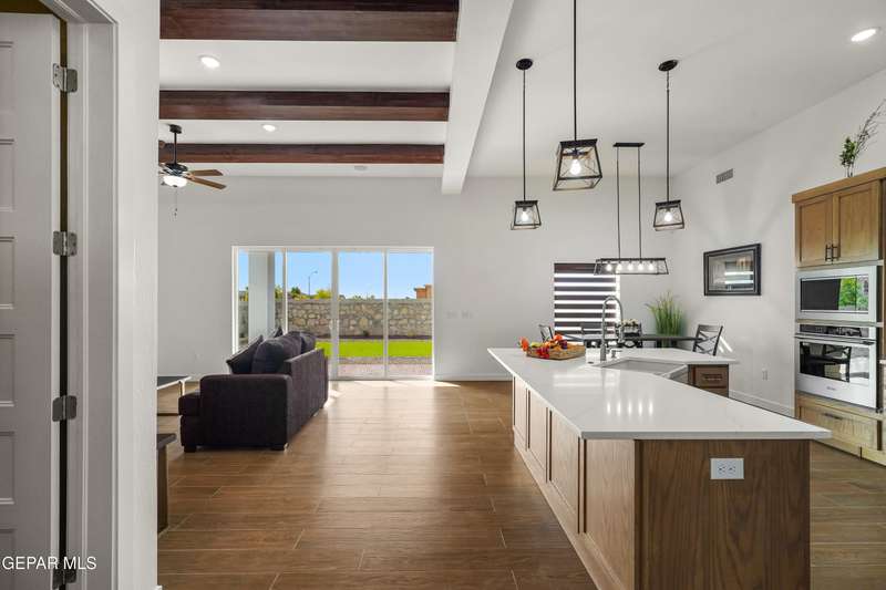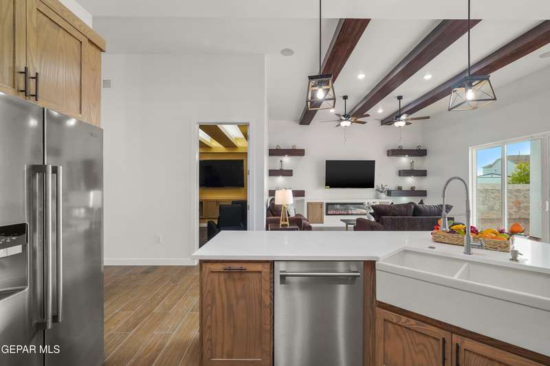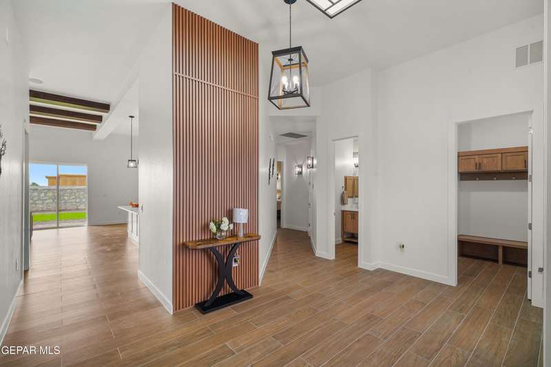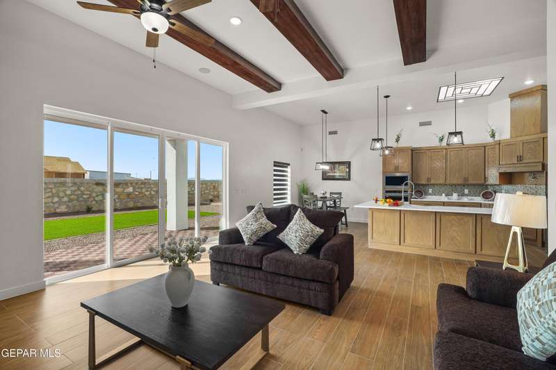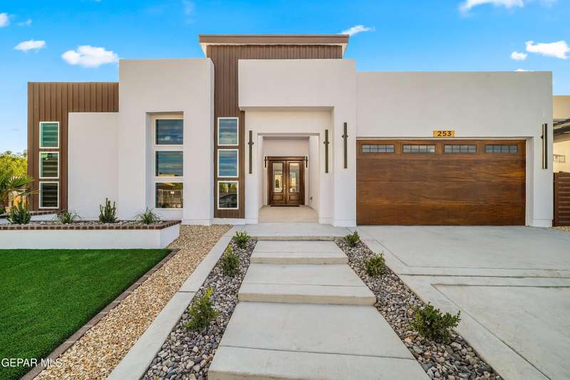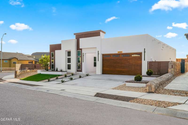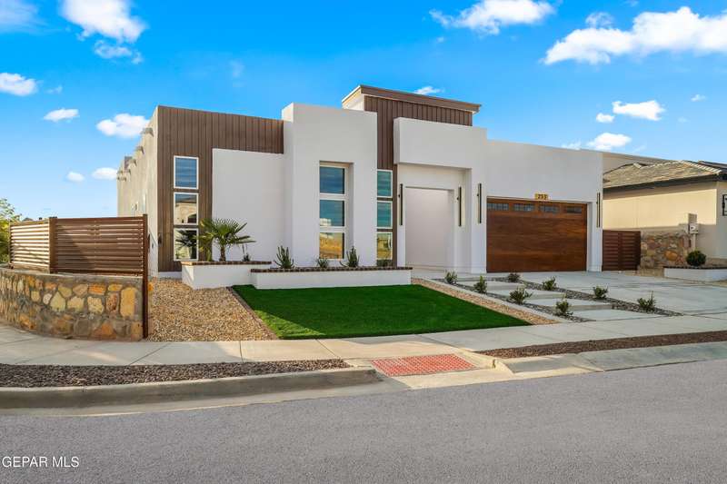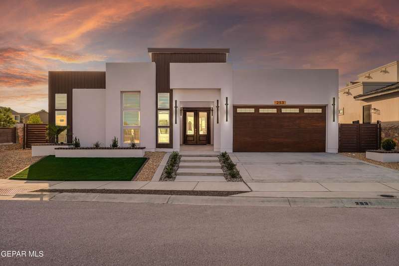 Experience modern elegance in this brand-new Custom Home, proudly featured in the 37th Annual Festival of Homes. Located on a corner lot in Horizon City, this transitional single-story residence spans 2,411 sq. ft. and offers 4 spacious bedrooms, 3 luxurious baths, and a private home theater. Step inside to discover bright, airy interiors highlighted by light-colored cabinetry, designer flooring, and detailed wall accents that create a warm, refined ambiance. The kitchen and baths showcase stunning finishes, including wall cladding, rounded mirrors, and elegant fixtures that exude style and sophistication. Enjoy seamless indoor-outdoor living with fully landscaped front and back yards-perfect for relaxing or entertaining. With its timeless design and thoughtful craftsmanship, this Custom Built Home is sure to impress even the most discerning buyer.