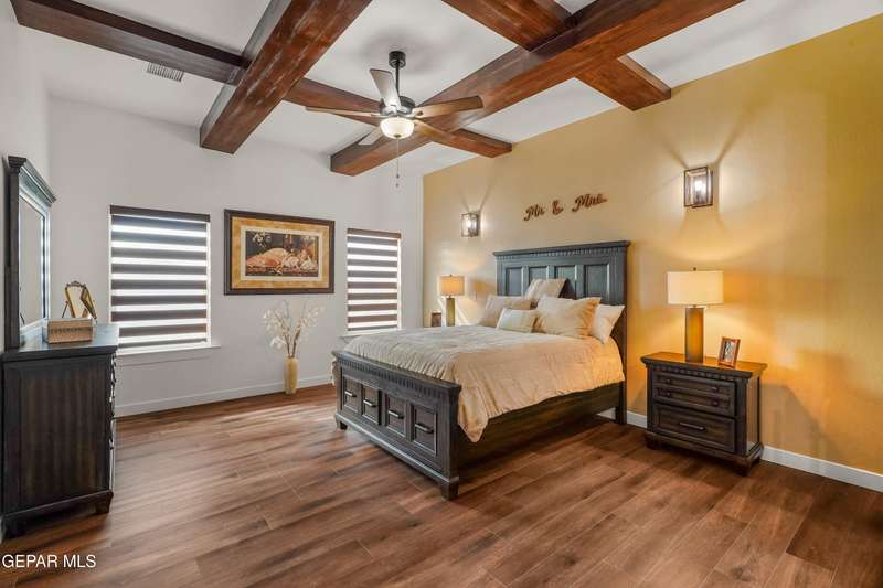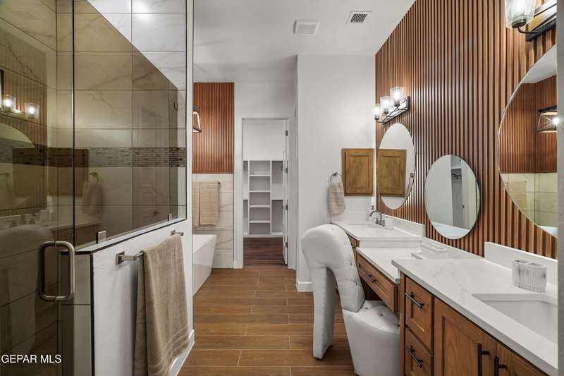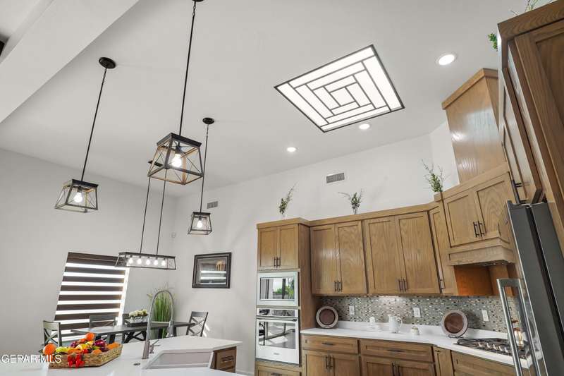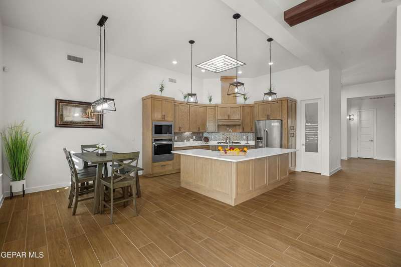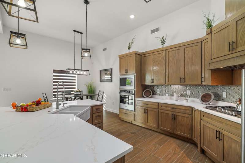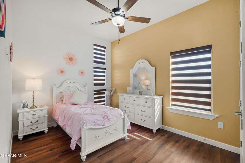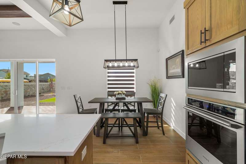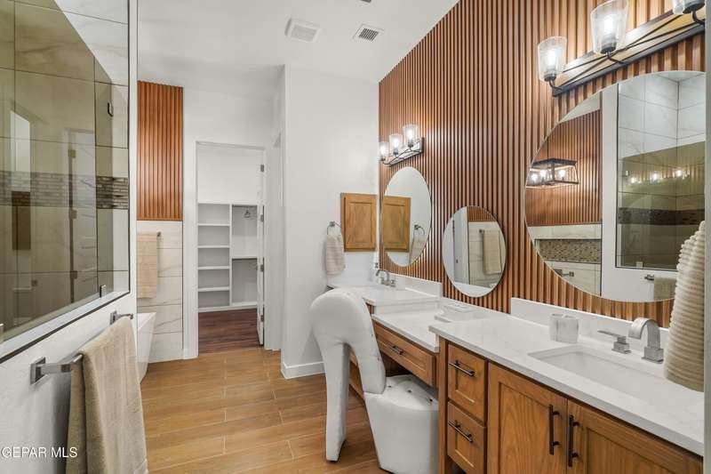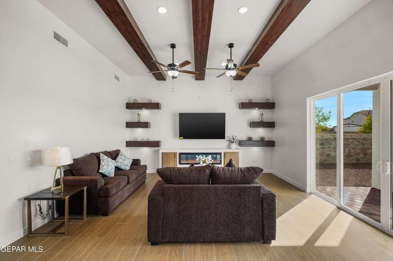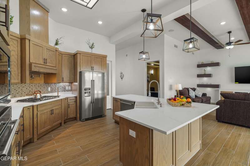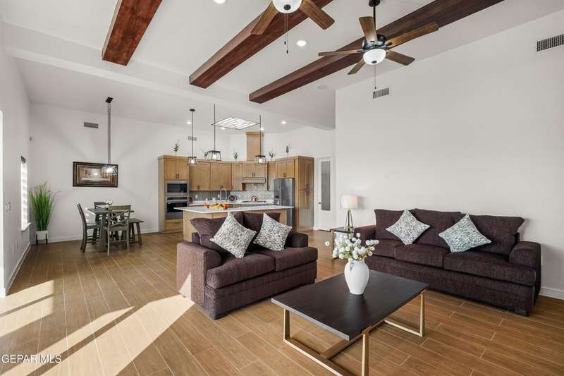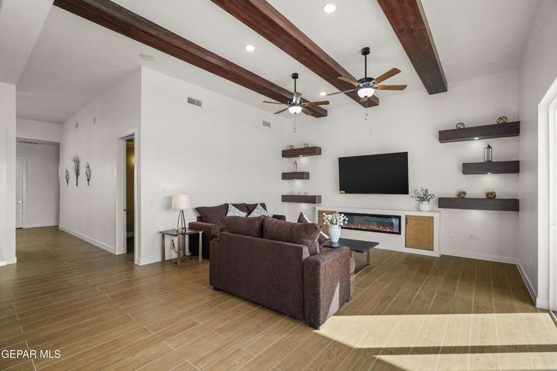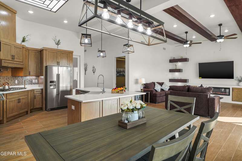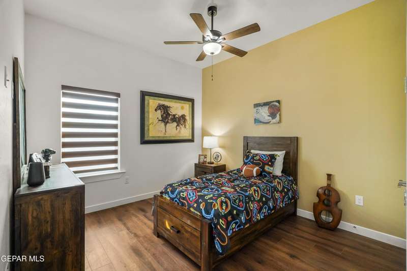 Experience modern elegance in this brand-new Custom Home, proudly featured in the 37th Annual Festival of Homes. Located on a corner lot in Horizon City, this transitional single-story residence spans 2,411 sq. ft. and offers 4 spacious bedrooms, 3 luxurious baths, and a private home theater. Step inside to discover bright, airy interiors highlighted by light-colored cabinetry, designer flooring, and detailed wall accents that create a warm, refined ambiance. The kitchen and baths showcase stunning finishes, including wall cladding, rounded mirrors, and elegant fixtures that exude style and sophistication. Enjoy seamless indoor-outdoor living with fully landscaped front and back yards-perfect for relaxing or entertaining. With its timeless design and thoughtful craftsmanship, this Custom Built Home is sure to impress even the most discerning buyer.