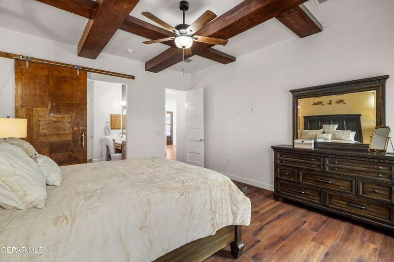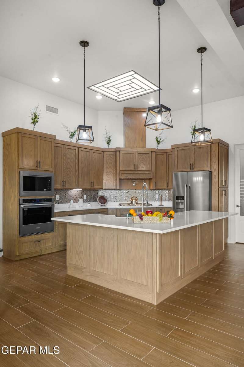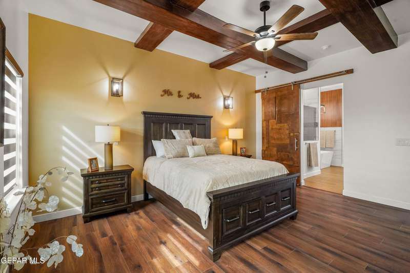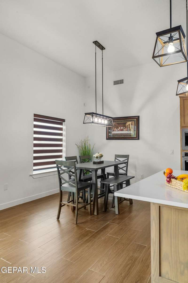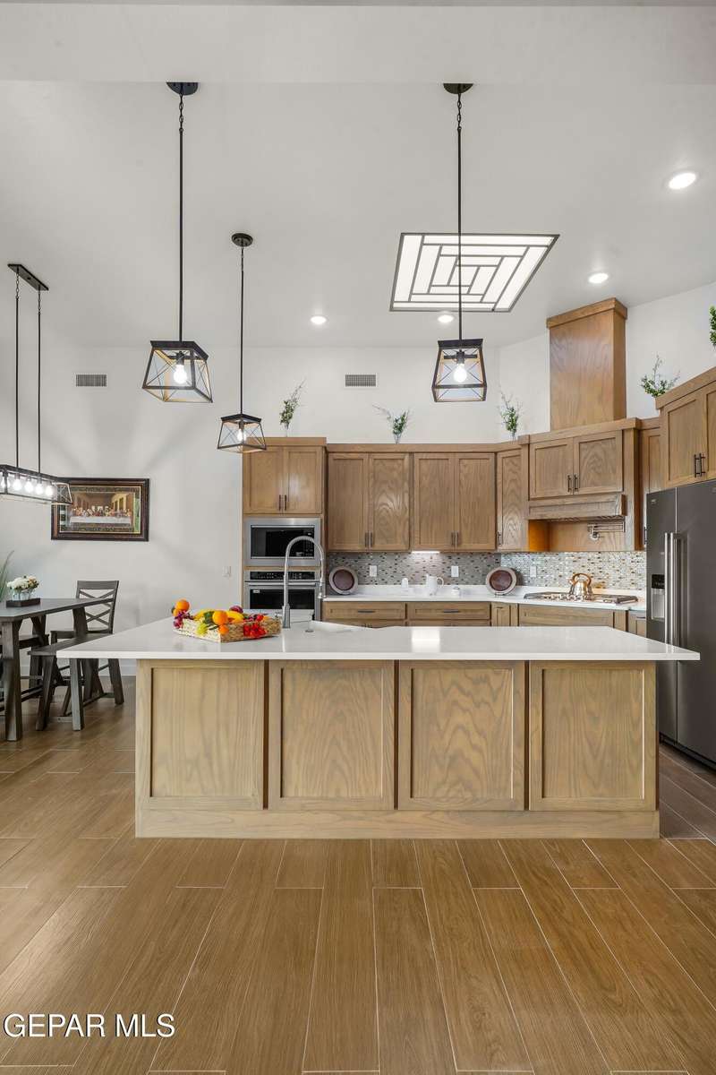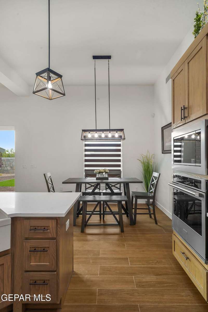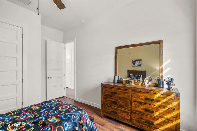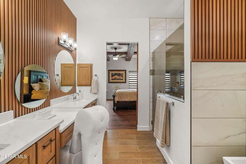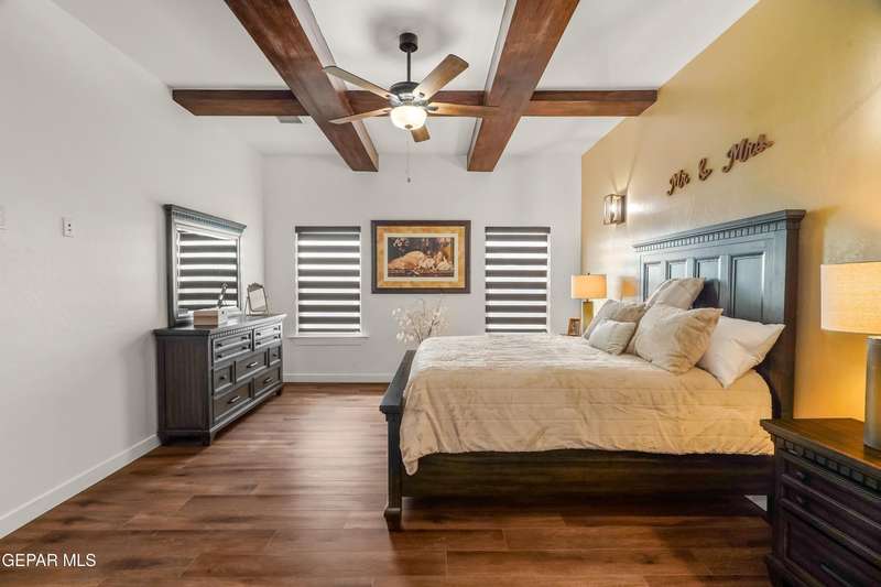 Experience modern elegance in this brand-new Custom Home, proudly featured in the 37th Annual Festival of Homes. Located on a corner lot in Horizon City, this transitional single-story residence spans 2,411 sq. ft. and offers 4 spacious bedrooms, 3 luxurious baths, and a private home theater. Step inside to discover bright, airy interiors highlighted by light-colored cabinetry, designer flooring, and detailed wall accents that create a warm, refined ambiance. The kitchen and baths showcase stunning finishes, including wall cladding, rounded mirrors, and elegant fixtures that exude style and sophistication. Enjoy seamless indoor-outdoor living with fully landscaped front and back yards-perfect for relaxing or entertaining. With its timeless design and thoughtful craftsmanship, this Custom Built Home is sure to impress even the most discerning buyer.