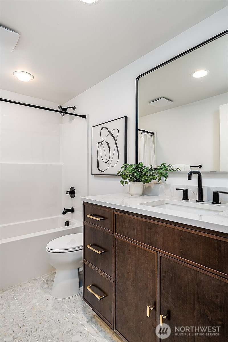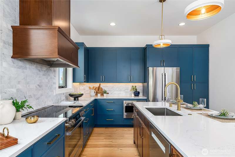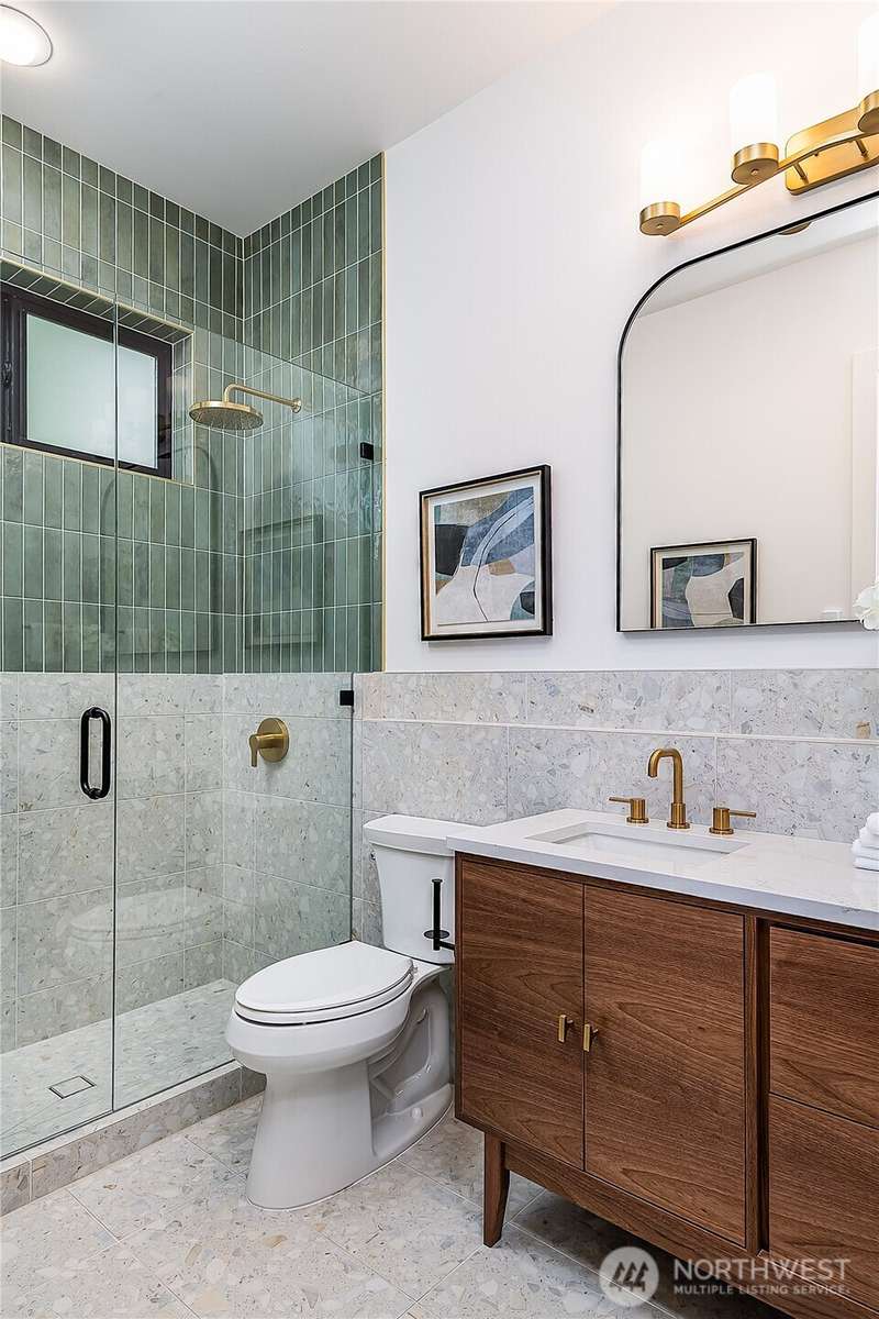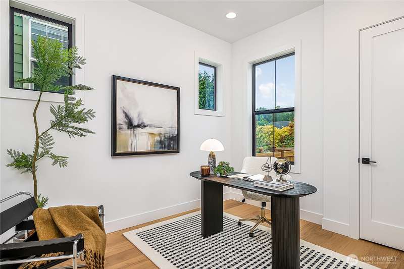Stunning 5bd/4ba home in Green Lake/Phinney Ridge! This 2,300+ SF home sits on a quiet corner lot w/ standout curb appeal. Main floor features dining/living room, office/bed, full bath, & a stunning kitchen w/ Bosch appliances, quartz island, marble backsplash & wood range hood. Sliding doors open to a deck & fenced yard- perfect for indoor-outdoor living! Upstairs, a large family room (or bedroom) has lake views, & a primary suite offers spa bath, WIC & more views! Daylight lower level has a bed, bath, laundry, & garage. Other features include wide-plank hardwoods, 10’ open-joist ceilings, custom finishes, cat 6 network wiring, & efficient HVAC. Just steps to Woodland Park Zoo & minutes to Green Lake, Fremont, Ballard, & top schools.