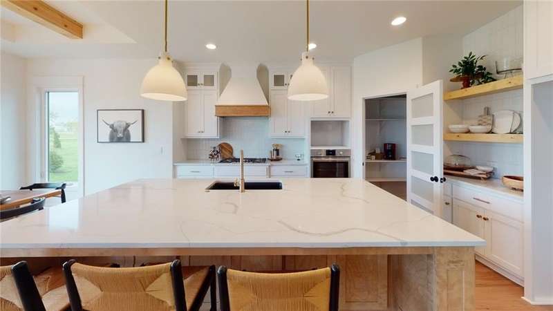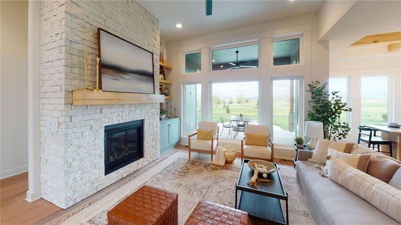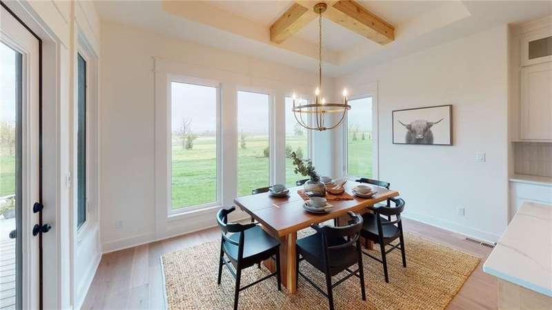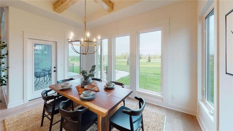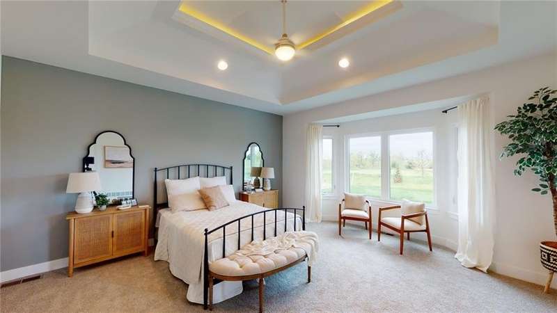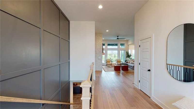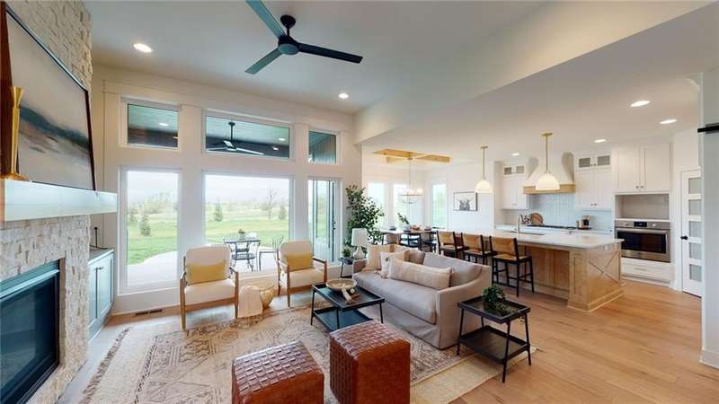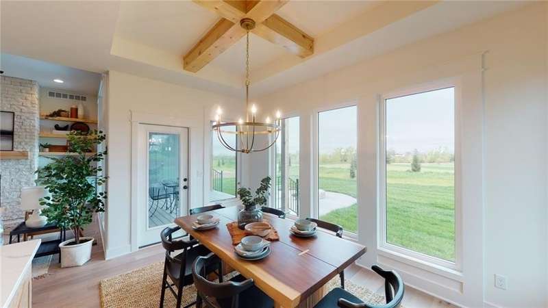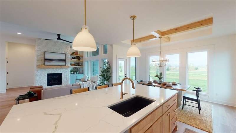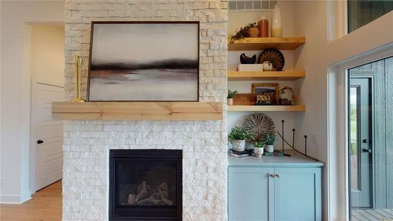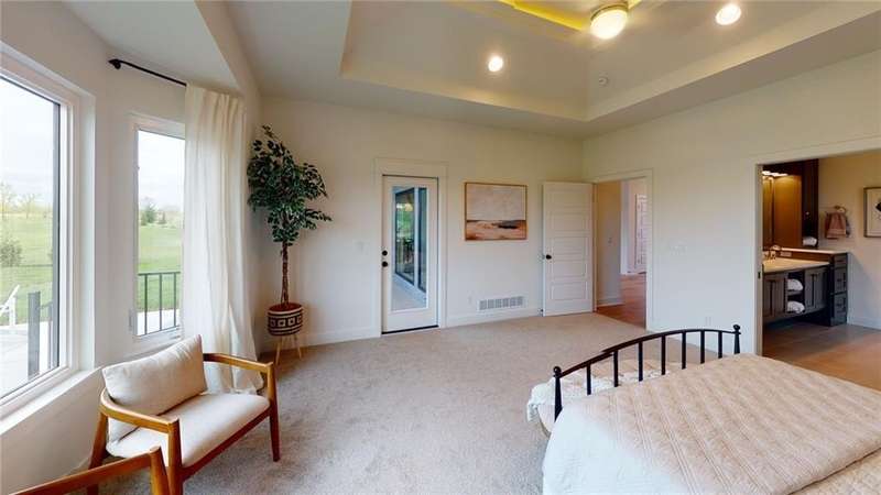 Lot 121. The Everest II plan by Dreams and Design. Backs to the Lake! Suspended Garage with rear side path to the extra garage for the golf cart! Open great room/kitchen/dining with an abundance of windows that provide natural lighting. This home has many upgrades including double front door leading to 11'x11' foyer, programmable lights, a second fireplace and lvp flooring in lower level, stair lights, barrel vault with indirect lighting, under stair playroom with dutch door, to name a few. The Primary suite is located on the main level with walk-in closet with 4 sets of metal pull down bars and a luxury bath with a beautiful tiled shower. Finished lower level includes rec room, media area, 1.1 baths, 2 bedrooms, and a bar! Covered patio. Enjoy golf course living in a great location, close to everything! Convenient highway access. Ten minutes to the Legends and 30 minutes to the airport and most other parts of the metro area as well as Lawrence. Community pool, play area, basketball and pickleball courts. Area restaurant open to the public. Acclaimed Basehor-Linwood Schools! Call listing agent for complete details. Other upgrades include Toe Kick Vac Pan in kitchen with canister in garage & hose attachments to vacuum cars, utility sink and freezer outlet in garage, 100k BTU 96% furnace variable speed, 4 ton - 16 SEER air conditioner variable speed, IAQ humidistat to automatically adjust humidity, F100 media air cleaner, 2 zones (main & 2nd floor) – 2 thermostats, two 50 gallon electric water heater, insulated garage, Energy Star 3.2 and more!!