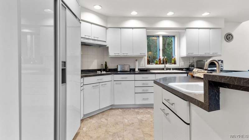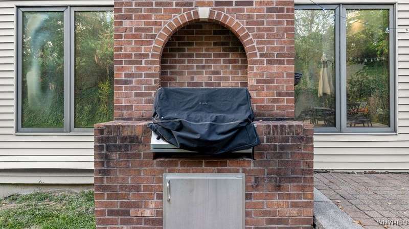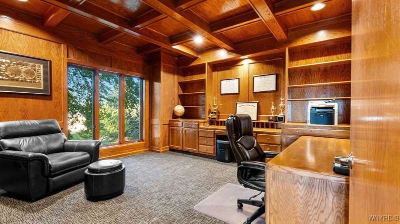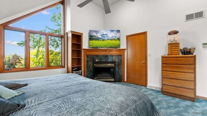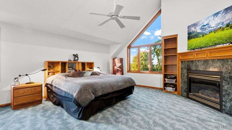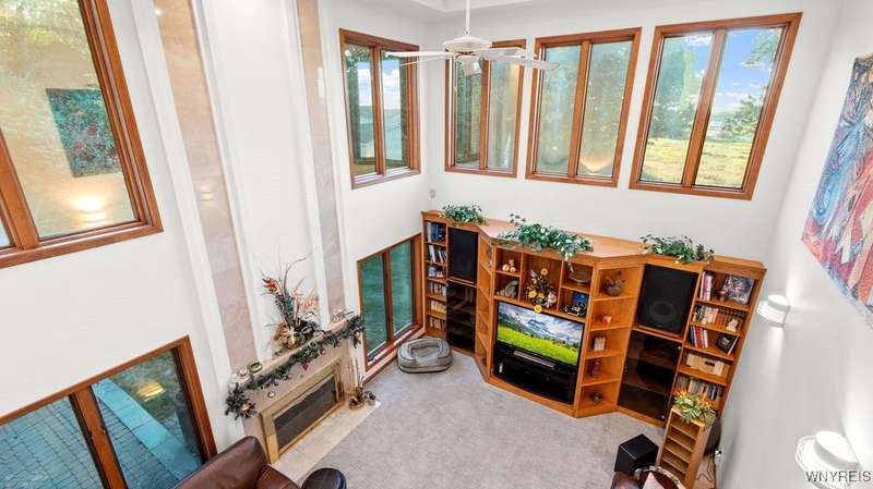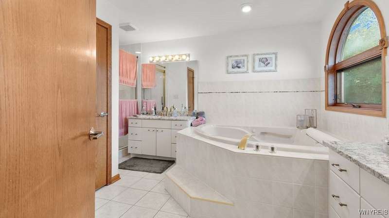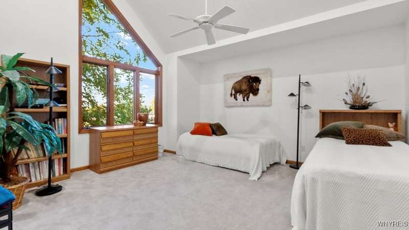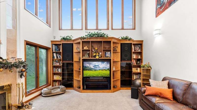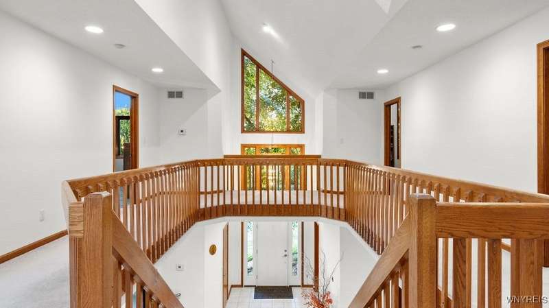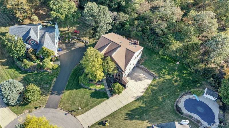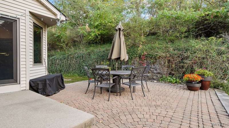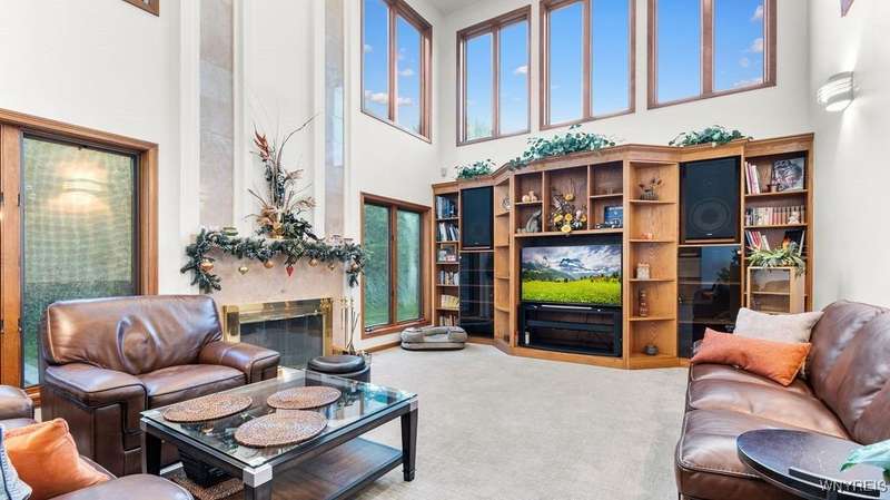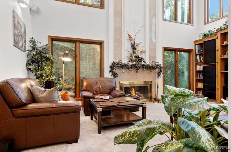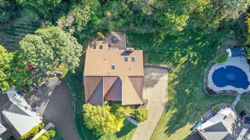 Constructed atop the Onondaga Escarpment, this wondrous property now awaits YOUR family. Perfect for guests, natural light pours in 10 ft-high rooms, with privacy to the rear. Spacious, bedrooms with walk-in closets. Home may also live as a ranch; good for all mobilities! Start your day in the breakfast-friendly kitchen, relax in your office/den, or in the privacy of your backyard patio. All appliances and three gas fireplaces are in perfect working order. Built on rock, the dry basement boasts enough storage and game space - with a lovely theater for movie night. Updates from 2024 include high-efficiency furnace and central A/C, granite master bathroom, sliding glass door, and garage floor. Difference of 216 in sq. ft (4,107 sq. ft. - 3,891 sq. ft.) is indicated on the home's blueprints.