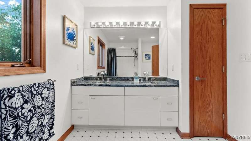Constructed atop the Onondaga Escarpment, this wondrous property now awaits YOUR family. Perfect for guests, natural light pours in 10 ft-high rooms, with privacy to the rear. Spacious, bedrooms with solid wood doors and walk-in closets. Home may also live as a ranch; good for all mobilities! Start your day in the breakfast-friendly kitchen, relax in your office/den, or in the privacy of your patio and huge backyard. All appliances and three gas fireplaces are in perfect working order. Built on rock, the dry basement boasts enough storage and game space - with a lovely theater for movie night. Updates from 2024 include high-efficiency furnace and central A/C, granite master bathroom, sliding glass door, and garage floor. Difference of 216 in sq. ft (4,107 sq. ft. - 3,891 sq. ft.) is indicated on the home's blueprints.