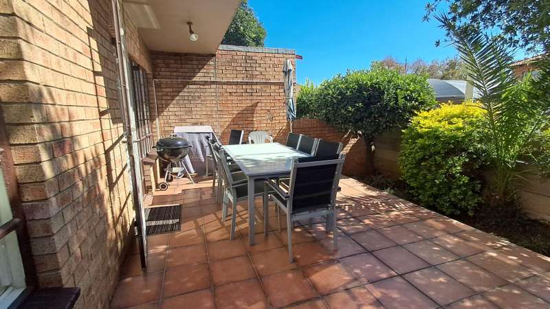 Lovely townhouse in a sectional scheme. Close to the schools and walk to the shops and centers. Double storey with a beautiful garden. Downstairs open plan lounge and dining area, doors open to a well established garden. Guest toilet is available. Kitchen has an exit door to the garden. Gas hob and electric oven and warmer. Double sink and space for washing machine. Security is good with automated gates and garage doors. Burglar proofing on the windows downstairs. Upstairs three, tranquil bedrooms and two bathrooms. Main bedroom has an en-suite. Balcony from main bedroom for a breeze in the hot evenings. Double garage and a double carport. Call me for a viewing appointment.