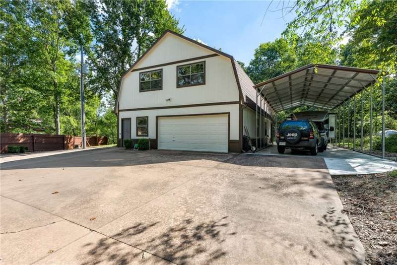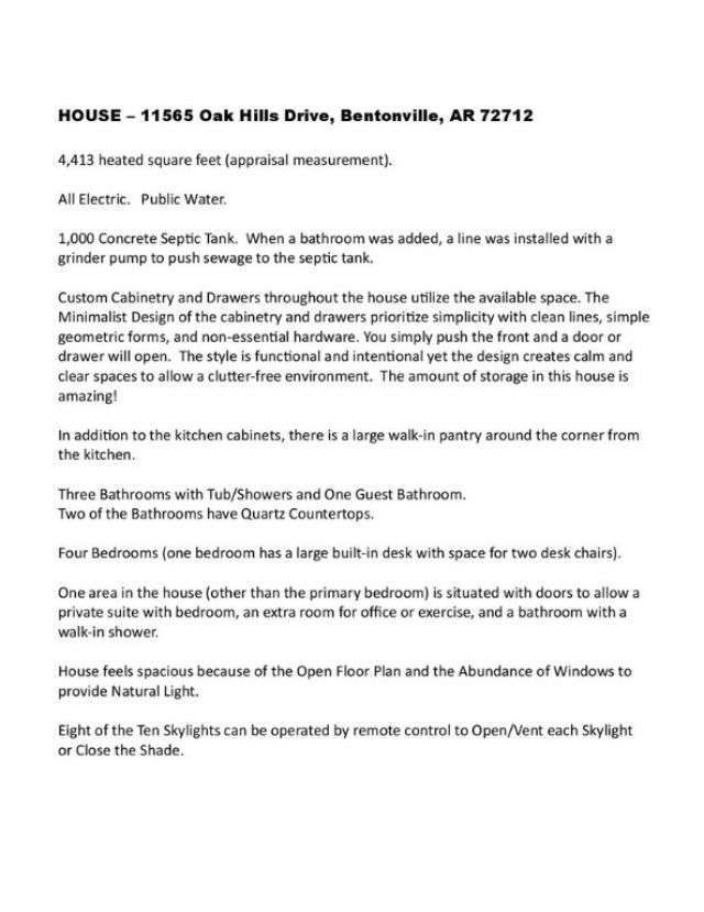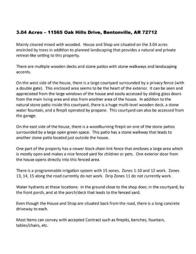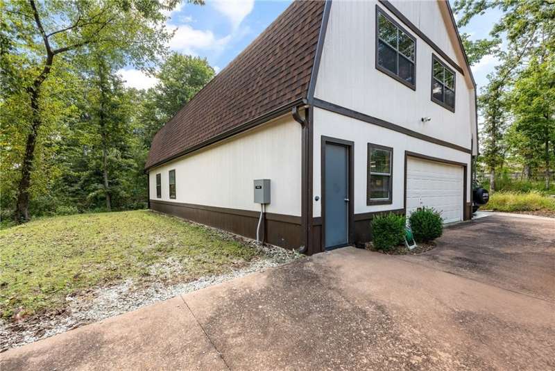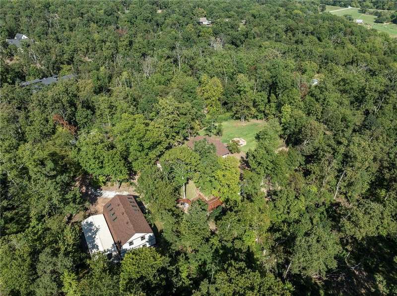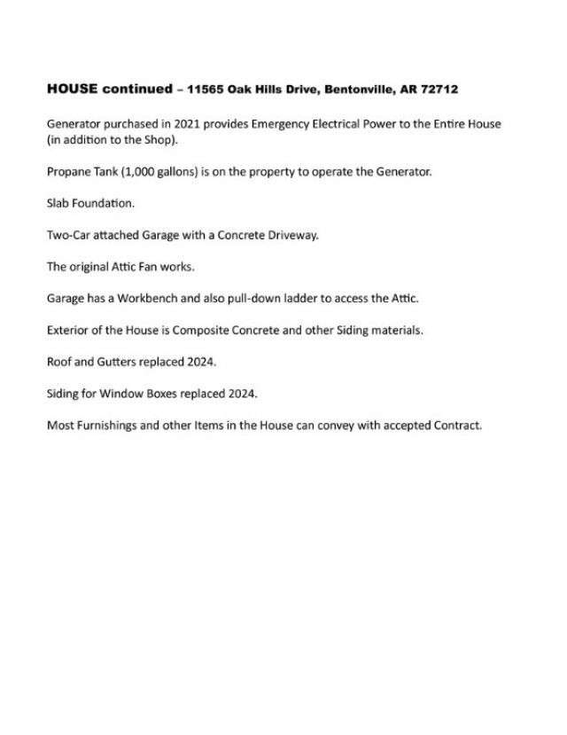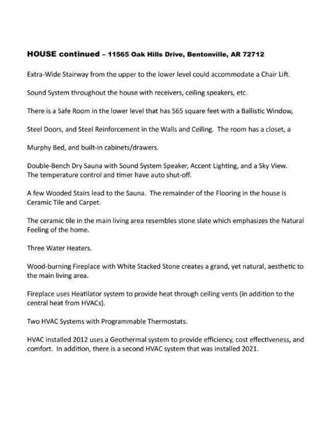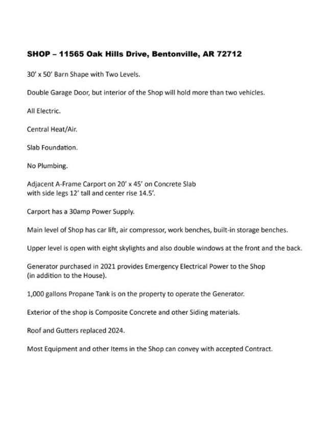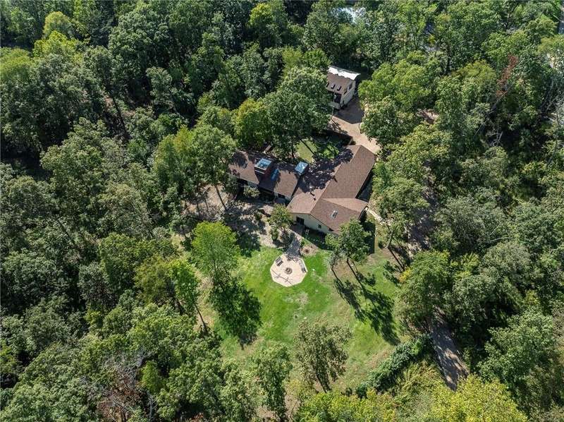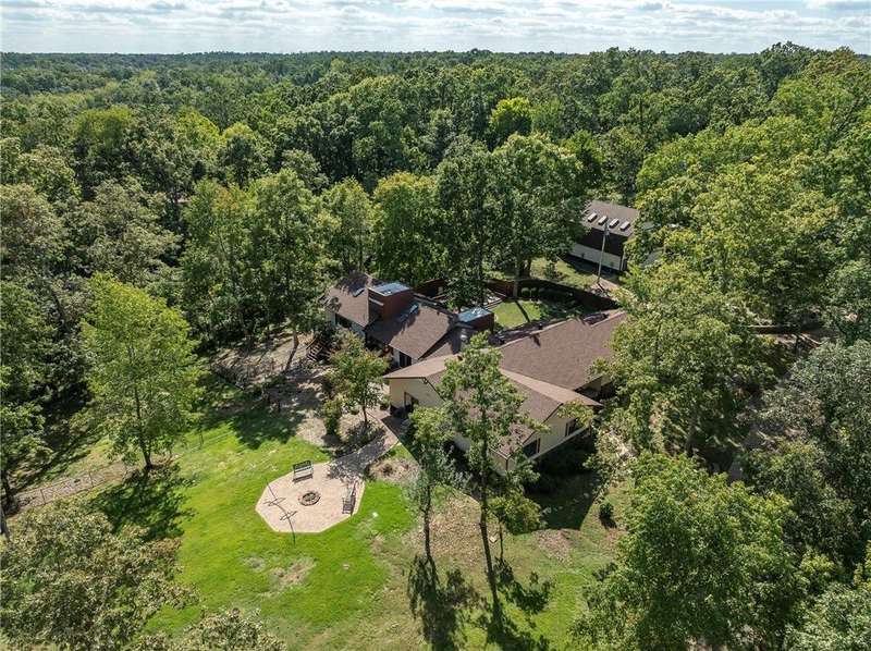 Less than mile from Coler Mountain Bike Preserve. The acres have open space, lots of trees, firepits, decks, patios; property feels like a retreat; peaceful setting. From indoors, nature is appreciated because of large windows & skylights. Main living space is large/open; allows versatility to furnish for a preferred lifestyle; whether to use the space for large sofas & chairs, dining areas, game tables, piano, or other furnishings. There is a lot of minimalist style cabinetry throughout the home with clean lines and a focus on simplicity & functionality that creates a calm and uncluttered environment. A safe room (565 sq.ft.) is in the lower level. Home also has a sauna. The location adds much value to this property. It is a rural setting where homes have large lots, yet just a few minutes to Bentonville Square, Museums, Walmart Home Office, and many trails. There is a 1500 sq.ft. heated/cooled 2-level shop with car lift & other equipment. There's a generator for the full house & shop with 1000 gallon propane tank