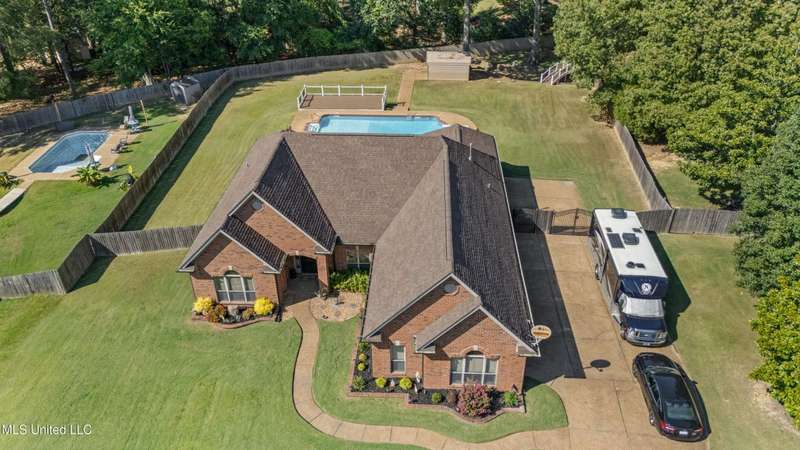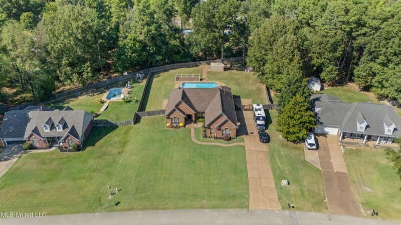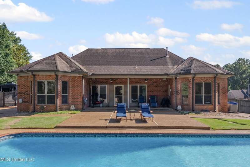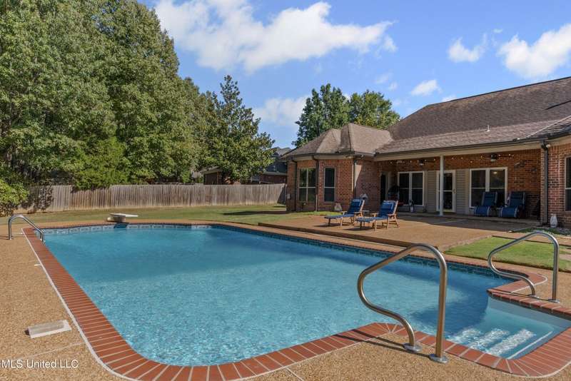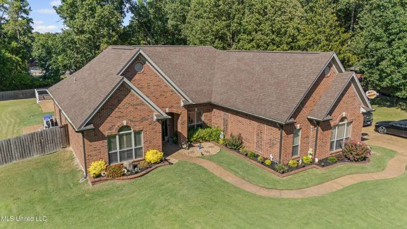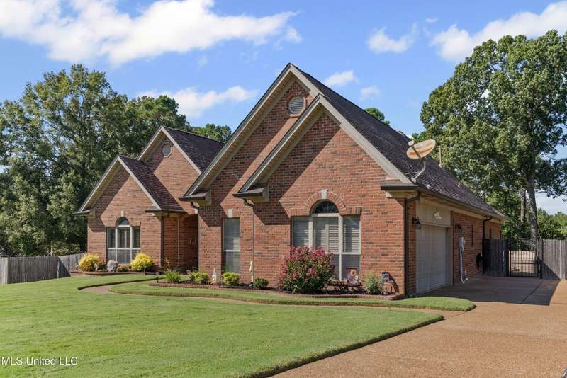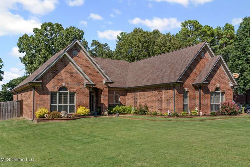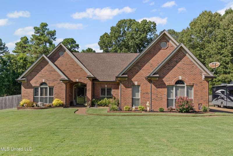 OPEN HOUSE: Saturday, 9/27, 11-1 & Sunday, 9/28, 2-4 ~~~~~ Tucked into a quiet, established neighborhood in Olive Branch, this beautifully updated single-level home offers approximately 2,500 square feet of thoughtfully designed living space on a nearly 3/4 acre lot. A Grecian-style in-ground pool with a diving board, Trex deck, and both covered and open patio areas . . . creates a private backyard oasis that's perfect for entertaining or relaxing in peace.Inside, a wide foyer welcomes you with a clear line of sight through the open-concept great room and dining area to the sparkling pool beyond. Fresh paint and brand-new luxury vinyl plank flooring flow throughout the home, while abundant windows and a floor-to-ceiling brick fireplace add warmth and charm. The spacious kitchen, open to the living areas, features tile floors, an island, generous cabinet and counter space, and upgraded appliances . . . including a brand-new refrigerator that stays. Just off the kitchen, the laundry room includes a new washer and dryer and stylish floating shelves for added function.The split-bedroom layout ensures privacy, with a spacious primary suite tucked away on one side of the home. This serene retreat includes a sitting area with pool views, private patio access, a luxurious en-suite bath with dual sinks, soaking tub, walk-in shower, and a custom-designed walk-in closet. On the opposite side, two additional bedrooms offer flexibility . . . one is large enough to serve as a second primary or guest suite (19x13), complete with its own patio access, seating nook, and walk-in closet. The third bedroom is also generously sized at 16x13 and shares a full bath with the second.Bricked flower beds, a full irrigation system, and a privacy-fenced backyard add to the home's curb appeal and outdoor enjoyment. Additional highlights include a two-car garage, brick and vinyl construction (for low maintenance living), abundant interior storage, attic space, and a 16x12 metal outbuilding on a concrete pad. A charming Trex bridge leads to a quiet garden area, ready for a butterfly and hummingbird haven.Ideally located near shopping, dining, and medical services, with convenient access to Memphis and Shelby County for work, this move-in ready home offers the perfect blend of comfort, style, and everyday livability.