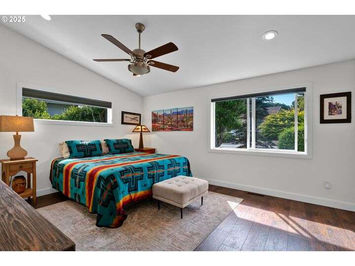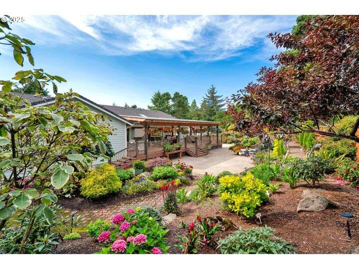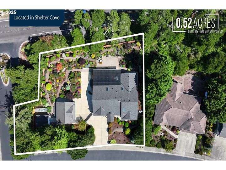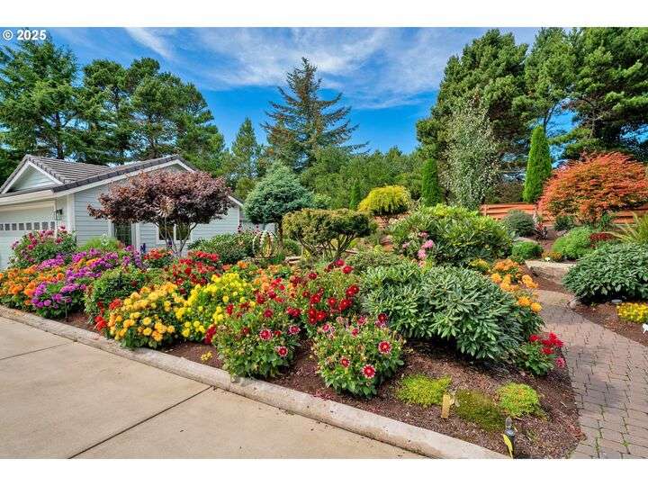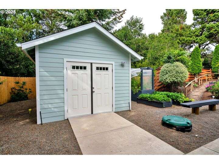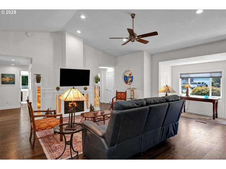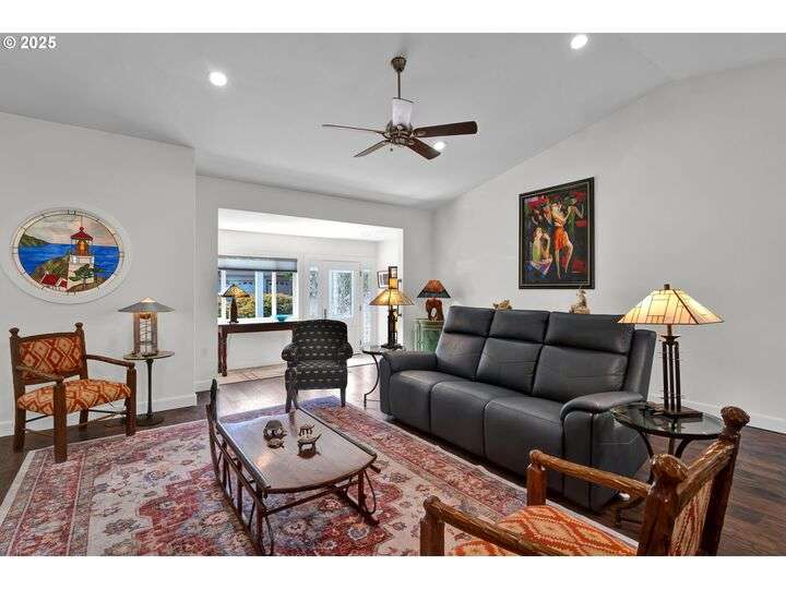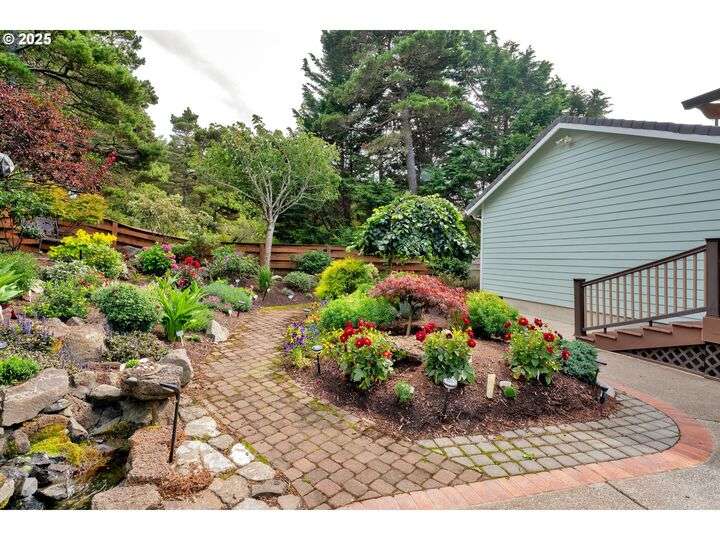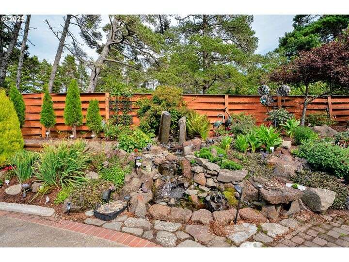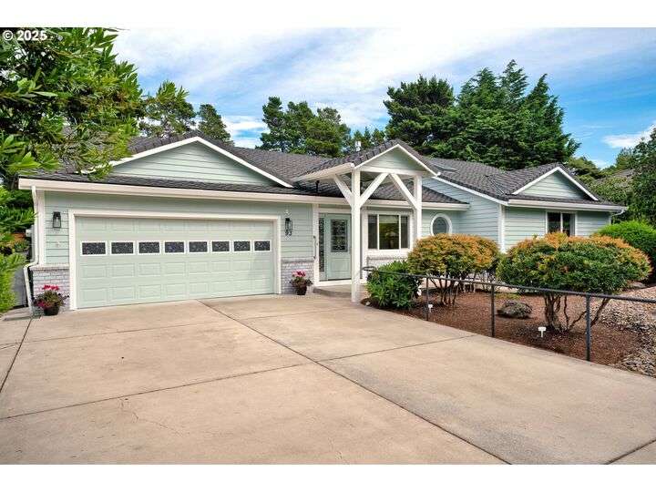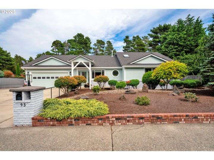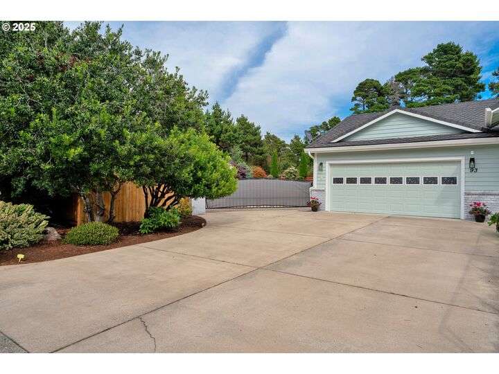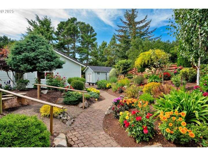 This beautifully updated residence features premium materials throughout its 2,354 sq. ft. layout. A 50-year architectural grade roof [2023]; new paint [2023-2024] inside and out; quartz countertops throughout; gas fireplace; all four [4] bathrooms have been redone with countertops, sinks, ADA toilets, ADA walk in showers and fixtures. The gourmet Kitchen is equipped with a gas cooktop and has an updated 10.5-foot quartz island complemented by extensive cabinetry for pantry space. Three new skylights and two solar tubes add additional lighting. The home has two master bedroom en suites with walk in closets; and an office/den or baby's bedroom. The laundry room is centrally located for convenience. A formal dining room seats 6-8 guests, with additional seating in the dining nook. Comfort is enhanced by heated floors in the entry and primary en suite bathroom. The expansive 16x40 covered patio provides excellent outdoor entertaining options, with a remote-controlled wind screen and three propane hook-ups to accommodate BBQs, fire rings, deck heaters. The property’s gardens were recognized as #1 on the 2025 Florence Garden Club Tour and are maintained effortlessly with an updated 12-zone irrigation system, and a beautiful water feature. The .52-acre lot offers both privacy and space to enjoy the landscaped grounds with extensive pathways. A detached 576 sq. ft. garage provides potential for third master en suite guest quarters, classic car storage or artist’s studio, with a bathroom and kitchenette. A 192 sq. ft. insulated tool and garden shed ensures protection for equipment against the elements. Additional features include an 18’x60’ concrete RV pad with a remote-control gate, suitable for parking up to four vehicles or an RV. ADA ramps in the gargage and deck for convenience. Located within the Shelter Cove gated community, this immaculate home offers an extensive list of amenities; please inquire for further details.