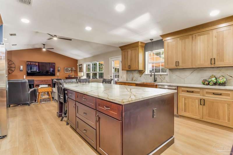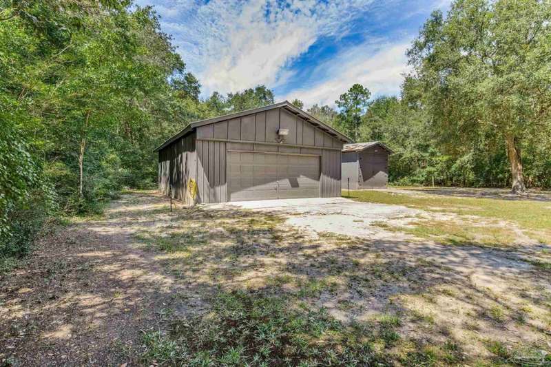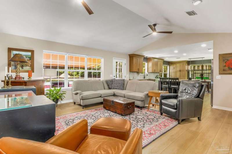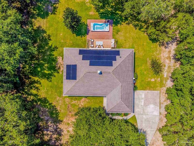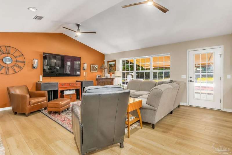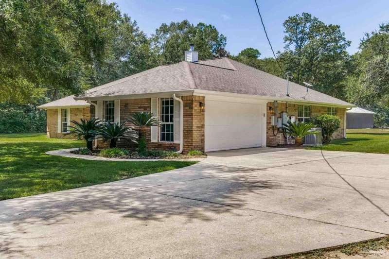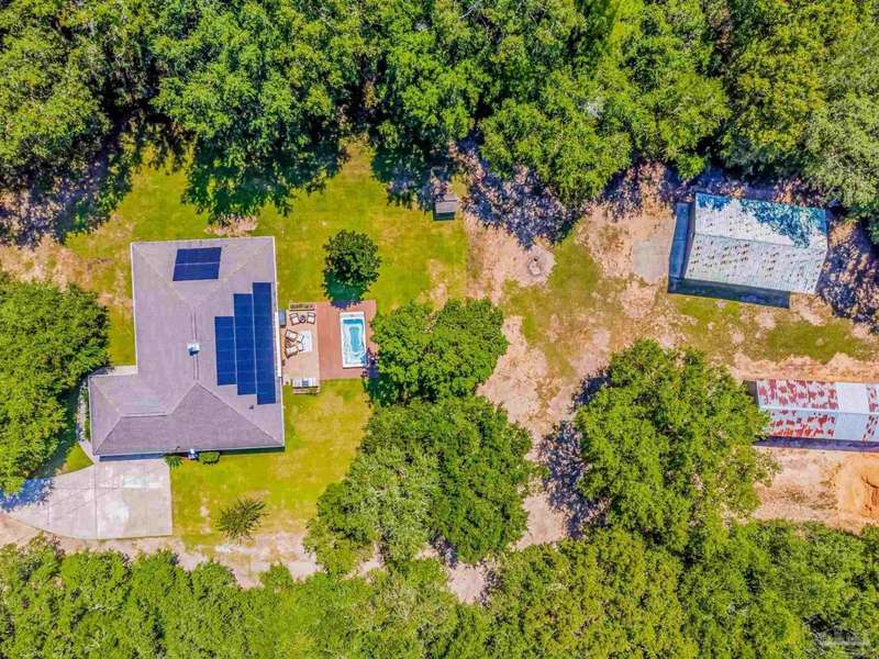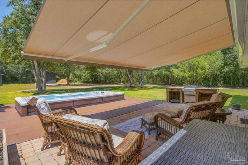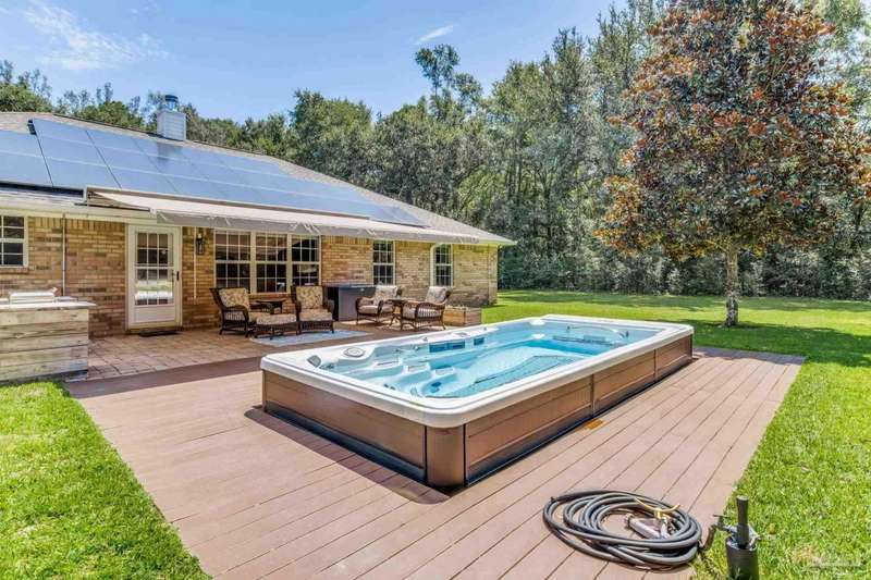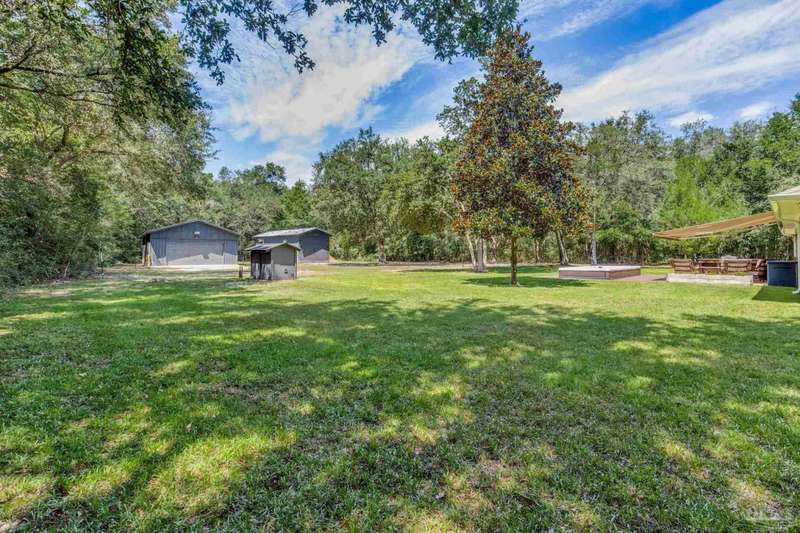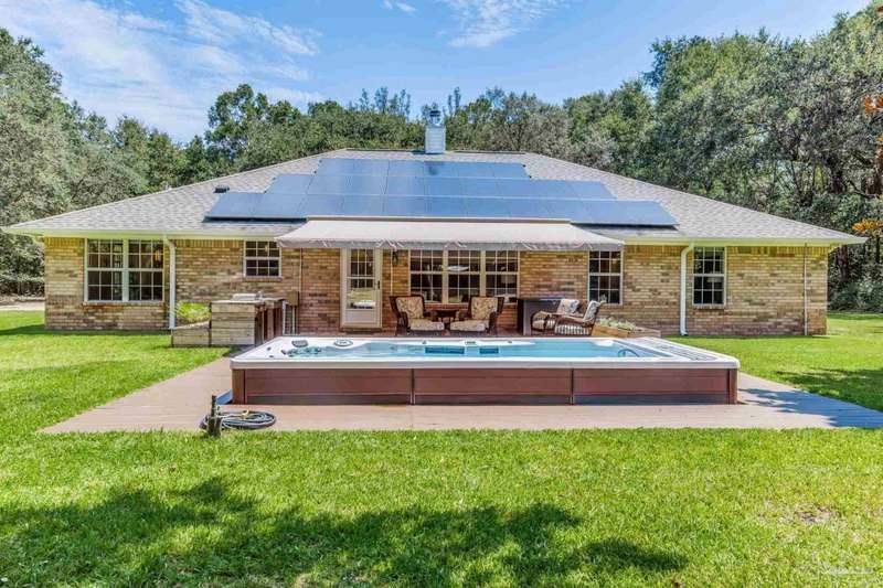 Well maintained and tastefully updated 3 bedroom 2 bath home situated on 4 acres! This brick home offers privacy with a large lot that is covered in mature landscaping that provides ample wildlife and space for outdoor activities. Inside, the home offers luxurious wood look flooring. The front den offers additional living or entertaining space. Making your way into the main living space provides vaulted ceilings, fireplace with brick hearth, modern lighting fixtures, and surround sound. The completely remodeled kitchen includes real wood cabinets, induction cooktop with stainless steel appliance package, double oven, recessed lighting, granite counter tops and spacious island with additional storage. The kitchen provides a multitude of seating options including breakfast bar and designated dining space. The home offers an office space or separate bedroom with 2 closets, and additional guest bedrooms. The spacious primary suite offers views of the expansive backyard, walk-in closet, fully tiled shower with glass surround and double vanity. Out back, the home offers a spacious open patio with retractable awning to provide great shade. The inground jacuzzi style pool offers relaxation. The backyard provides a well for the irrigation, a large oversized 2-car garage with workshop along with a completely enclosed RV garage with power and a junction box that could support 30amp. Additional features include full solar system with battery power backup installed in 2022, full home gutters, roof in 2019, HVAC in 2014 and so much more!