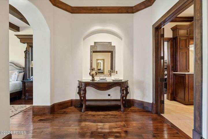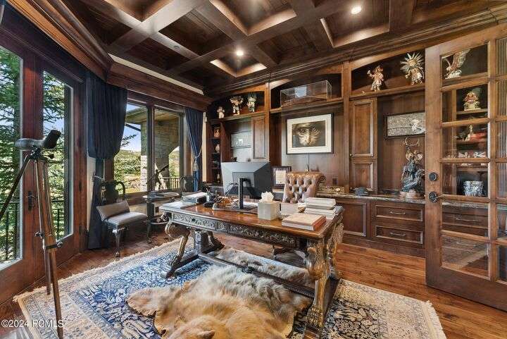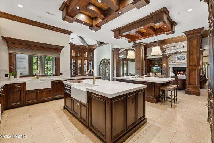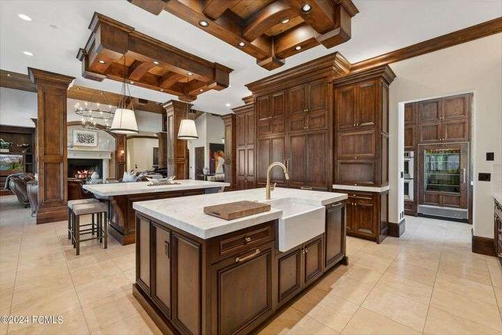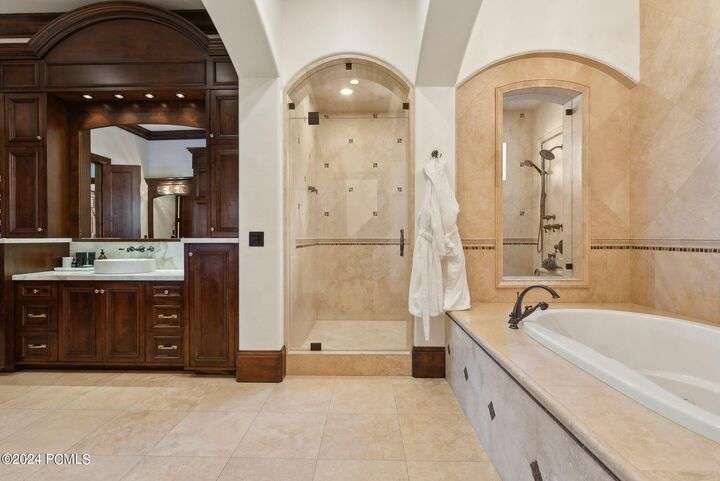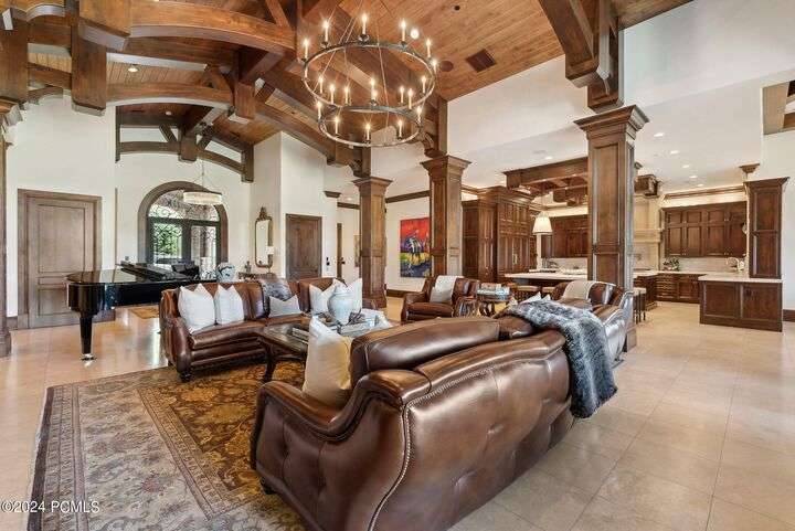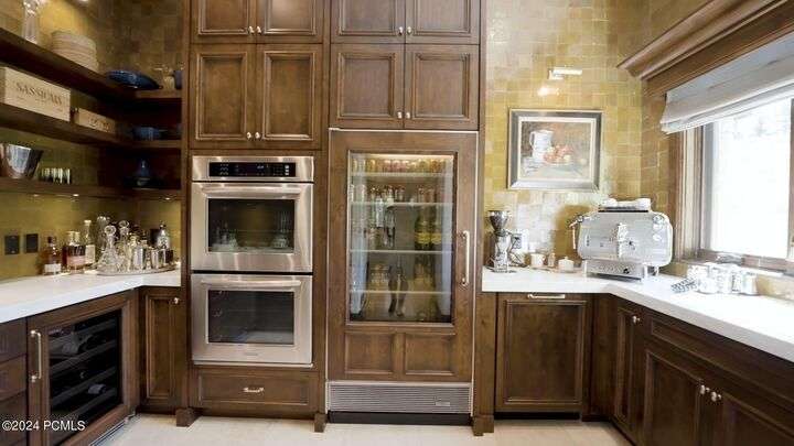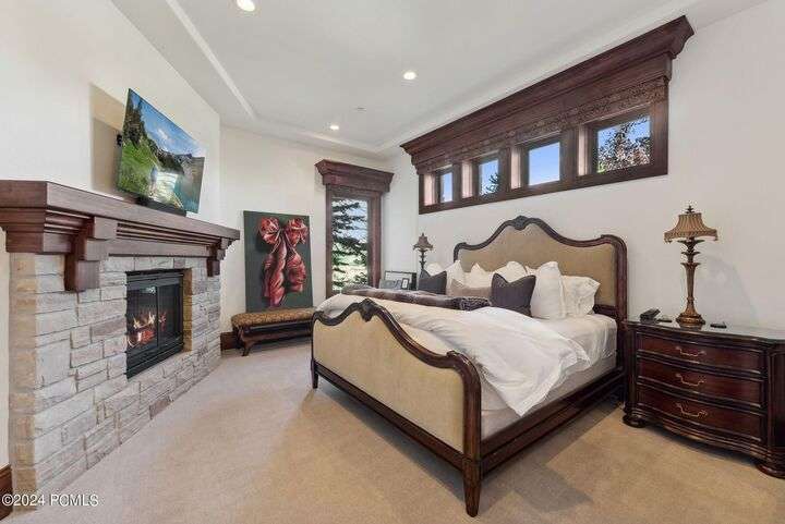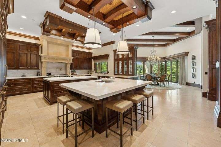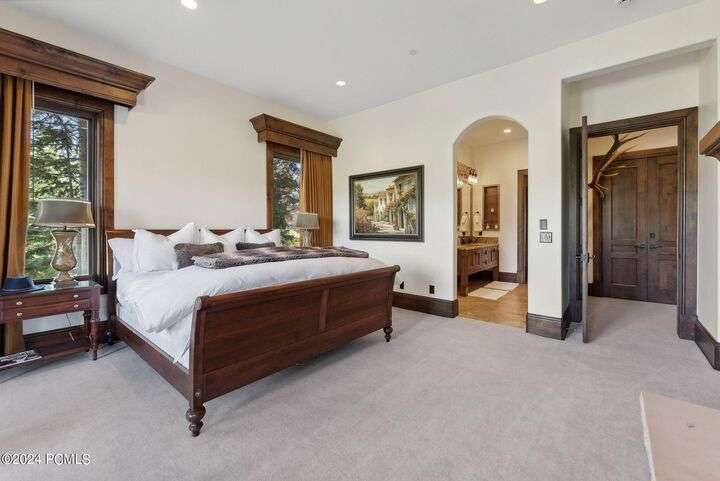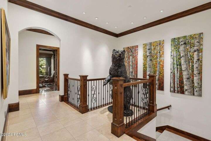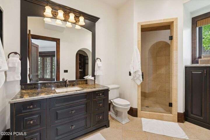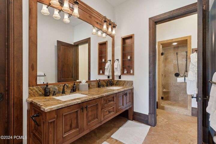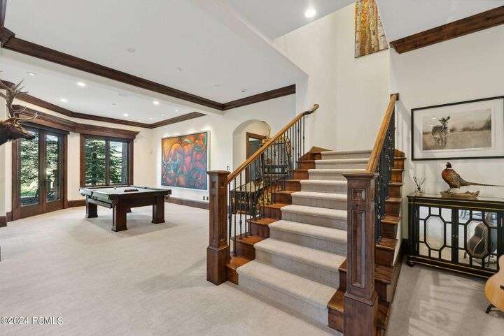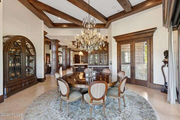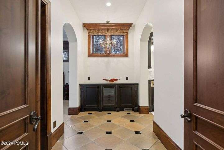 Timeless elegance meets remarkable comfort in this stunning custom residence within the exclusive, gated Glenwild community. Enhanced with luxurious upgrades in 2022, this property seamlessly blends established grandeur with modern refinement. Perched above the 6th fairway of Utah's #1-rated golf course, it boasts breathtaking ski resort and golf course views.The meticulously designed layout caters to both grand entertaining and intimate gatherings. The main level features expansive living areas with smooth alder wood beams, striking mantles, and dramatic vaulted ceilings. An enviable open kitchen with new marble slabs flows into a fully updated butler's pantry. Glass doors in the dining area blur the line between indoor luxury and outdoor splendor.The secluded northwest wing houses the primary bedroom suite, complete with a private deck, fireplace, large walk-in closet, and a spacious en-suite bathroom featuring a grand bathtub. An adjacent office offers access to a covered deck. A separate guest suite with its own fireplace and en-suite bathroom completes the main level, which also boasts an elegant library.The lower level, accessible by staircase or elevator, includes three additional private en-suite bedrooms and a potential fourth bedroom currently serving as a state-of-the-art workout room with a sauna. An expansive living room with a custom bar sets the stage for entertaining, while an all-brick wine cellar, movie theater, and new gun vault add to the home's amenities.Outdoor living reaches perfection with stone archways framing exquisite gathering areas and custom fire pits, offering golf course views through mature pines and aspens. A water feature and sculpted retaining walls line the heated brick-paved drive, complemented by updated landscaping. The crowning touch is a newly added custom outdoor spa with dramatic ski resort views.This rare opportunity in Glenwild, the only gated golf course community in the Park City school district awaits you.