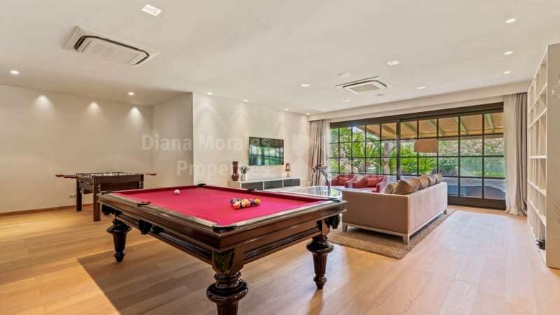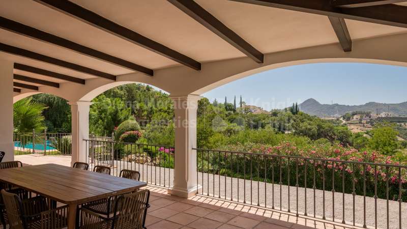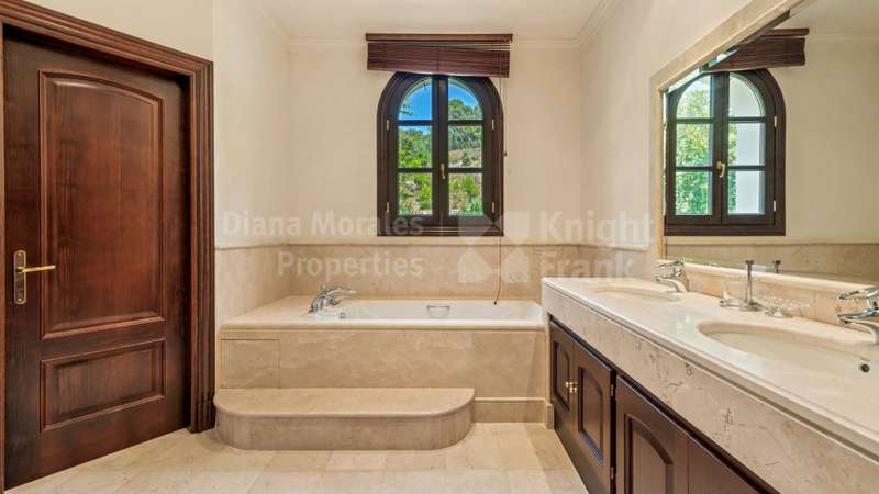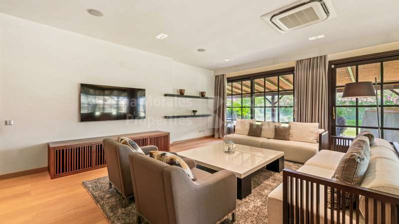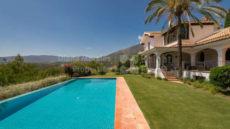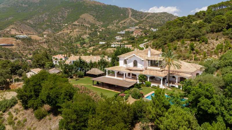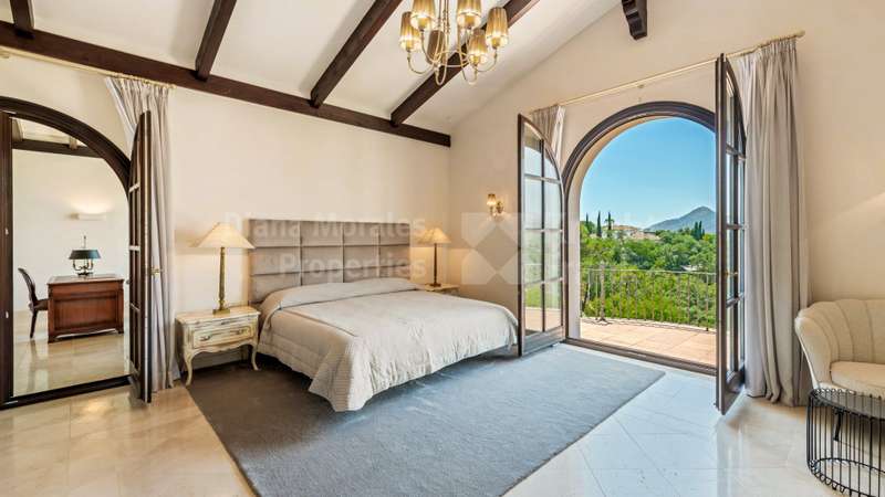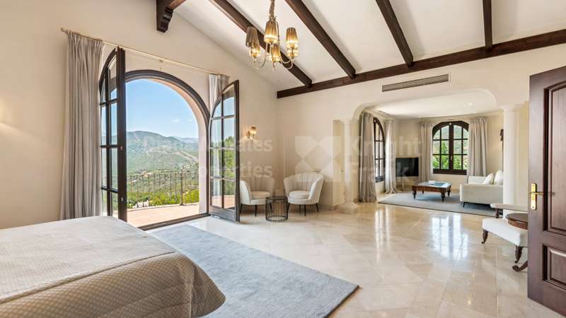Villa El Magnolio with spectacular mountain views, is situated in the peaceful location of La Zagaleta Golf & Country Club, an exclusive and secure residential estate with two 18-hole golf courses, equestrian centre, heliport and a variety of sporting facilities as well as red carpet services for its residents. Access to the estate is guarded 24 hours a day. The villa’s imposing entrance leads to an elegant foyer with a sweeping staircase, ascending to the upper floor which hosts the spacious master bedroom featuring a sitting area, a dressing room, a study, a marble bathroom and a private terrace to enjoy the panoramic views. On the main level there is a cosy and comfortable lounge warmed by a fireplace, a TV room, an adjoining dining area, an elegant fully equipped kitchen and 3 bedrooms en suite, all with outside wrap-around terraces and picturesque far reaching mountain views. Downstairs offers really amazing entertainment area with direct acces to the garden, with a h
