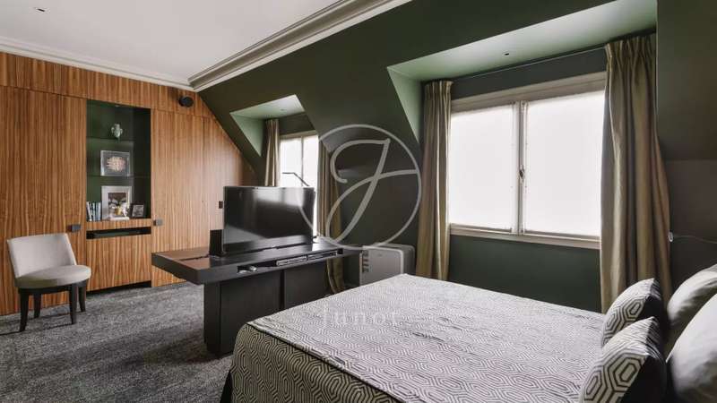 In the heart of the Golden Triangle, on the top floors of a magnificent Art Deco building with elevator and concierge, discover this 225sqm duplex apartment with three bedrooms. The first level features a vast living room with 5.70m ceiling height and access to the terrace overlooking the Grand Palais, the Eiffel Tower and the monuments of Paris, a dining room with kitchen and laundry, and a guest toilets. The night area features a vast master bedroom with dressing room and bathroom, as well as two en suite bedrooms. The second level offers a TV lounge with shower room and toilet, as well as an office and a gym, all opening onto a roof terrace with panoramic views over the monuments of Paris. A cellar completes this property. Two additional parking spaces are available on top of the price.