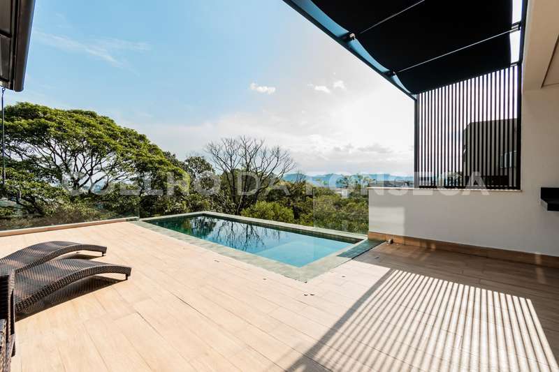 Casa maravilhosa de construção moderna, situada em condomínio com Bosque, 4 quartos sendo 3 suítes, piscina aquecida, churrasqueira, forno de pizza e amplo jardim interno com jabuticabeiras no piso inferior. Aquecimento solar, elétrico e a gás. A casa possui armários embutidos e eletrodomésticos na cozinha.