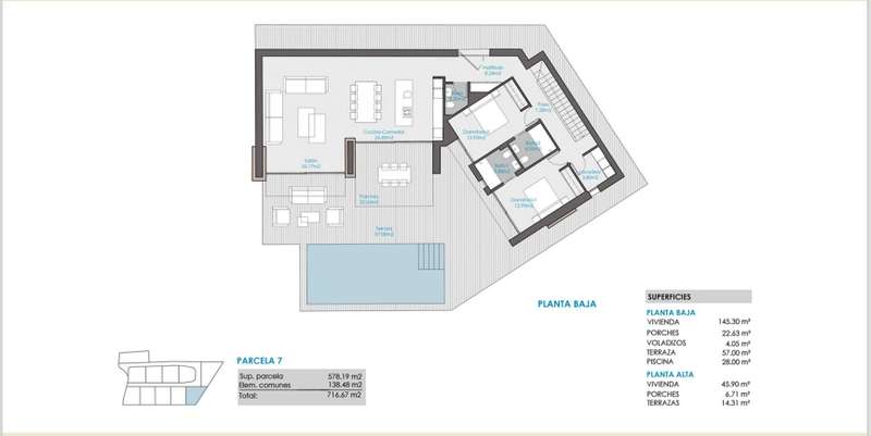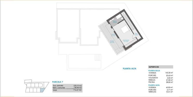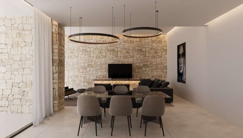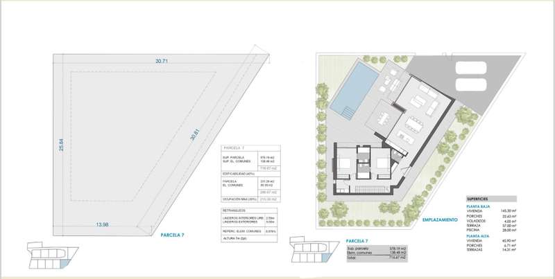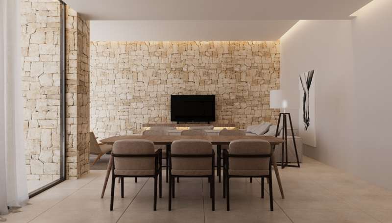 PARCELA 7. Contemporary villa project located in an exclusive private residential between the beach of Las Rotas and the skirts of the Montgó, in Dénia (Alicante), a few minutes from the marina and all main services. This residential complex consists of 7 different housing models, all designed under the same architectural concept of avant-garde lines and materials that integrate harmoniously into the environment. The villa is distributed on two floors: Main floor: large living/dining room with open kitchen, laundry area, two double bedrooms with en suite bathroom, courtesy toilet and covered terrace connected with pool and garden. High floor: master bedroom with private bathroom and spectacular views of the Montgó. The kitchen, of the Santos brand, is delivered fully equipped with induction plate, integrated extractor hood, osmosis equipment, fridge, freezer, oven and microwave. Outside, there is a saline pool with pre-installation of heating, Mediterranean garden with autochthonous vegetation and automatic irrigation, perimeter seto for greater privacy and pergola with capacity for two vehicles, built in metal structure and covering canvas. The villa is designed to provide maximum comfort: underfloor heating on both floors, air conditioning through heat pumps, 3kw photovoltaic installation and domotic to control lighting, air conditioning and motorized curtains, even remotely. The exterior carpentry will be made of minimalist aluminum with thermal bridge breakage and Guardian Sun glazing with safety foil and air chamber, with oscillating opening. The main facade will be delimited by a wall of reinforced concrete, landscaped areas and metallic fence, as well as an automatic gate of 4 meters with dual system for pedestrian and vehicle access.
