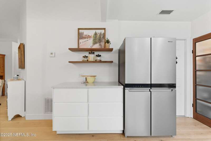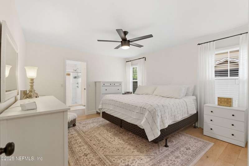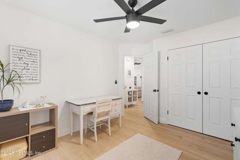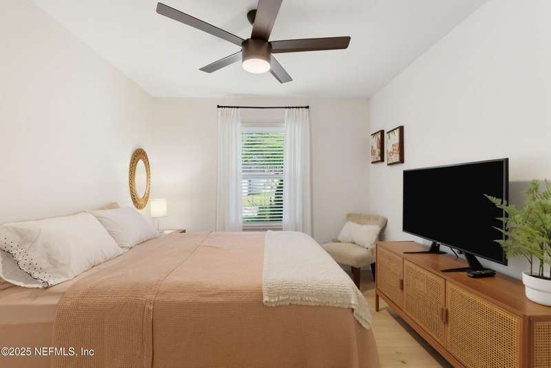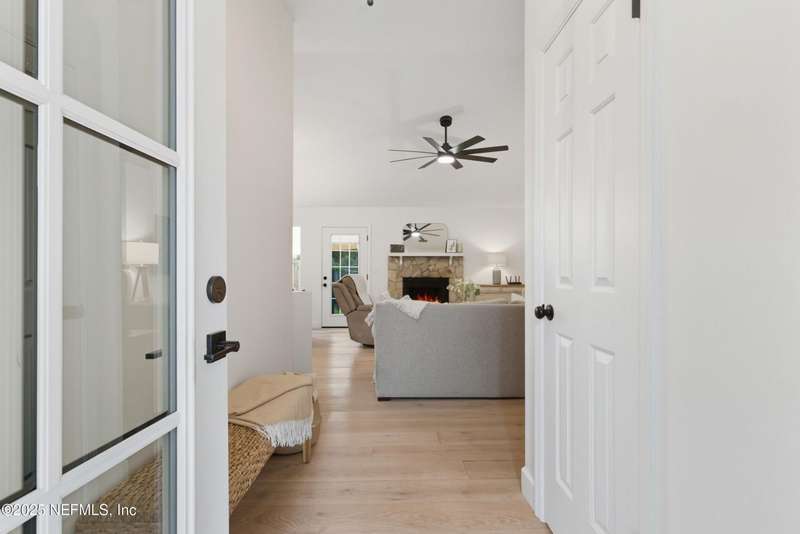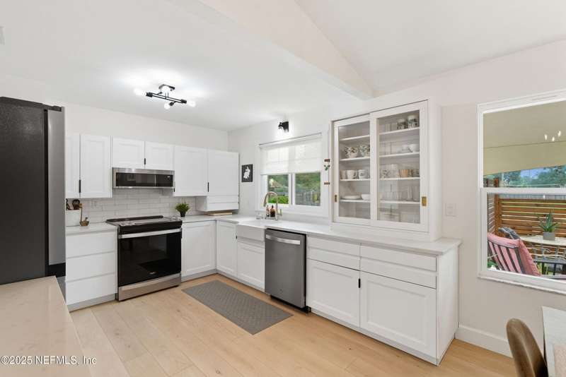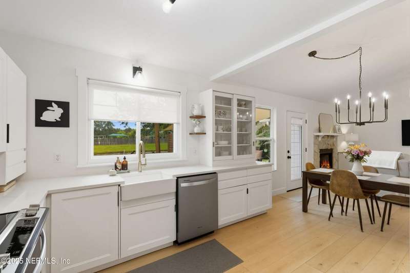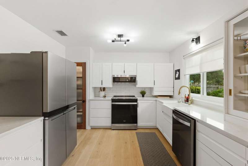 This is Mini Luxury Living - a smaller footprint with high end finishes. Set on a corner lot totaling .68 acres, this beautifully renovated home features designer-level touches in every room. The kitchen is sleek and updated with all-new custom soft touch cabinets, quartz countertops, matching stainless appliances, new sink and faucet, and updated lighting. Both bathrooms have been remodeled with new vanities, sinks, fixtures and toilets. White oak tongue-and-groove flooring runs throughout the home, paired with upgraded 5.5'' baseboard molding for a clean, cohesive look. Popcorn ceilings removed. New replacement windows (2024), new HWH (2023), 200 amp electric panel, seamless gutters, replumbed (2025). Bonus features: Power operated garage screen, pond aerator installed 2023, and mature landscaping. A private pond sits just beyond the fence - stocked with bass, offering an opportunity for relaxing and reeling in a catch right from home.