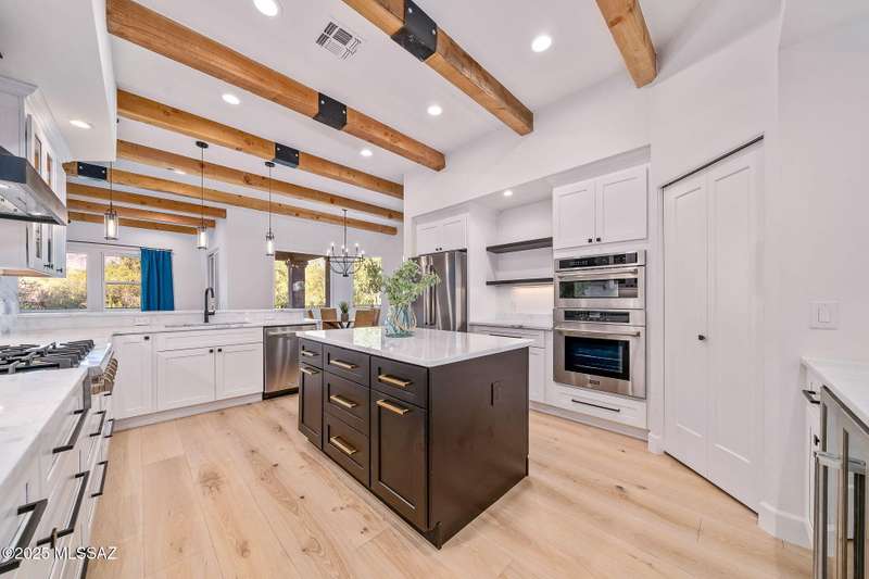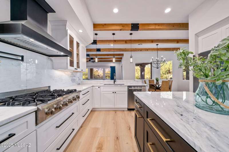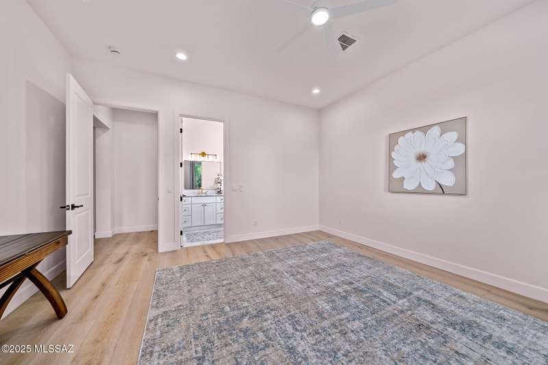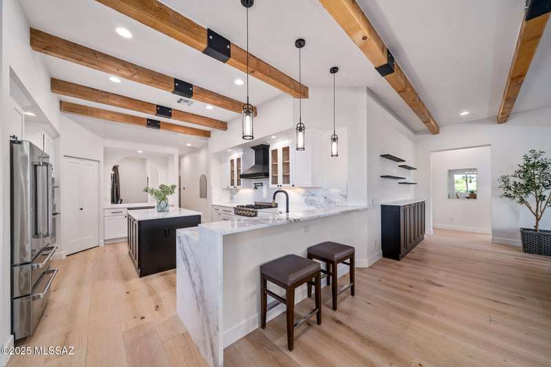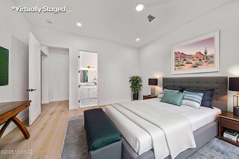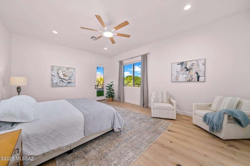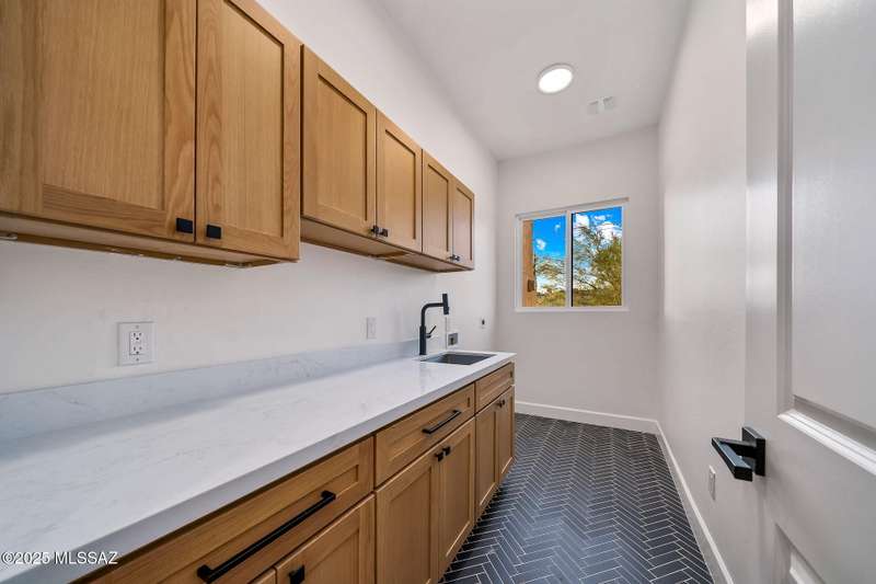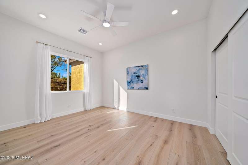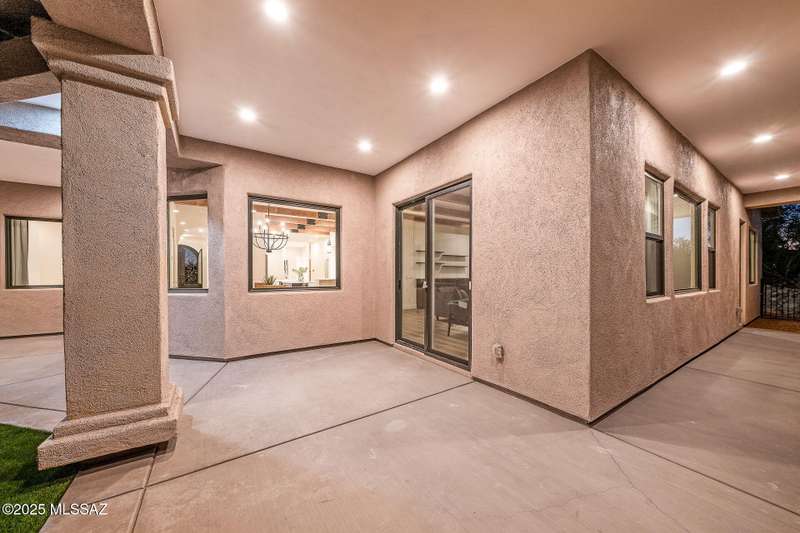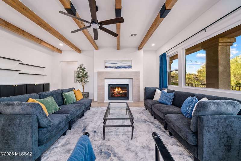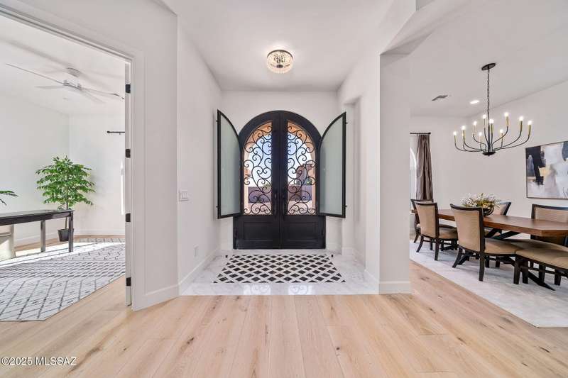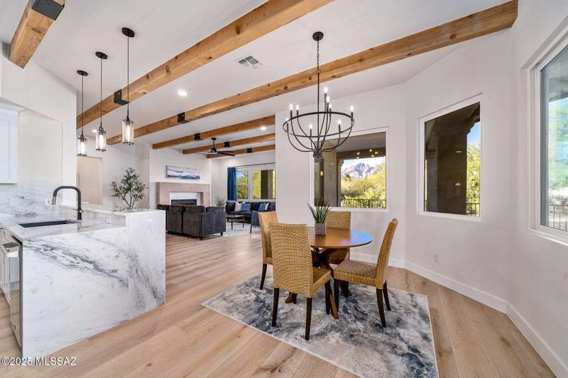 Discover refined desert living in this brand-new luxury residence perfectly situated within Pontatoc Ranch in the Catalina Foothills. Designed for today's discerning buyer, this contemporary masterpiece combines timeless elegance with modern sophistication, offering the perfect balance of privacy, style, and convenience. Set on a 1.03-acre private lot, the home makes an impressive first impression with its expansive paver driveway, mission-tile roof, and a custom iron entry door that sets the tone for the exceptional craftsmanship inside. Step into a spacious, open-concept floor plan with no interior steps, soaring ceilings, and walls of glass. Rich engineered wood flooring and exposed beams add warmth and character throughout. The 3,696 sq. ft. layout offers 5 bedrooms and 5 baths,