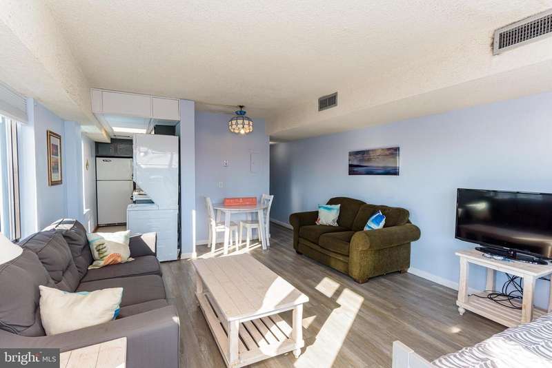 Experience the best of beach living in this sun-filled, top floor end unit located in North Ocean City, just steps from the sand. From this prime spot, you'll enjoy sweeping views of both the ocean and the bay--watch the sunrise over the water in the morning and the sunset in the evening, all from your private balcony. This move-in-ready ocean condo comfortably sleeps six and features an open layout with luxury vinyl plank flooring throughout (2021), an updated kitchen (2021), in-unit washer and dryer (2021), and a new hot water heater (2024). The building offers two elevators and an outdoor pool, perfect for relaxing after a day at the beach. Ideal as a weekend escape, year-round retreat, or investment property.