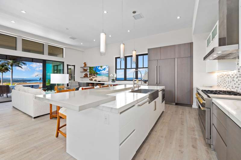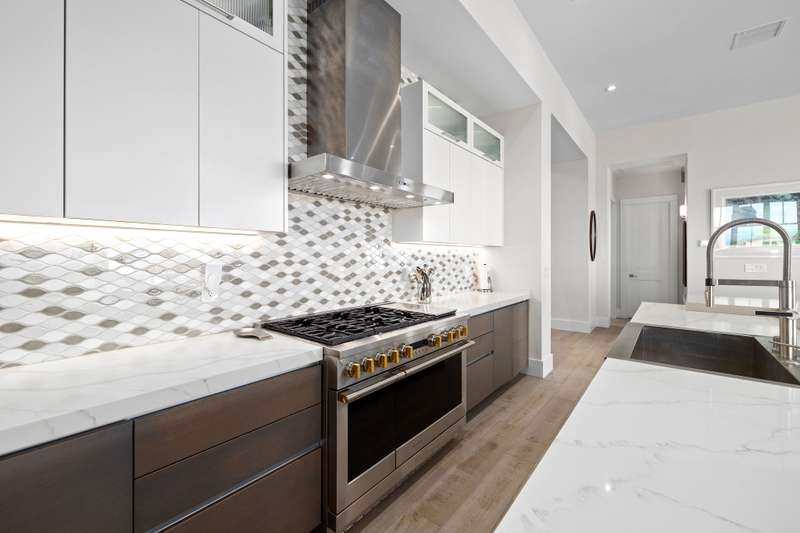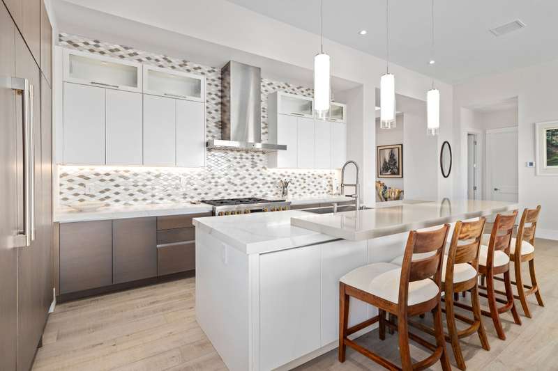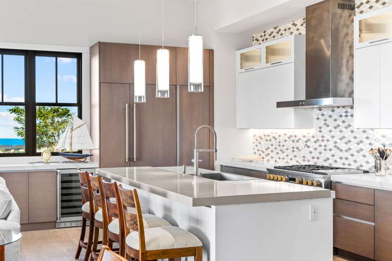 Stunning kitchen features quartz countertops, a split level island, tile backsplash, stainless steel appliances with built-in refrigerator, 6 burner gas stove and built-in wine cooler.