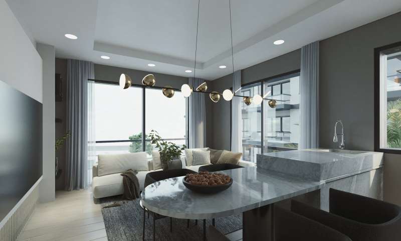 The apartments are equipped with PVC windows, ceramic flooring in all rooms and bathrooms, MDF kitchen cabinets, MDF interior doors, and steel exterior doors.