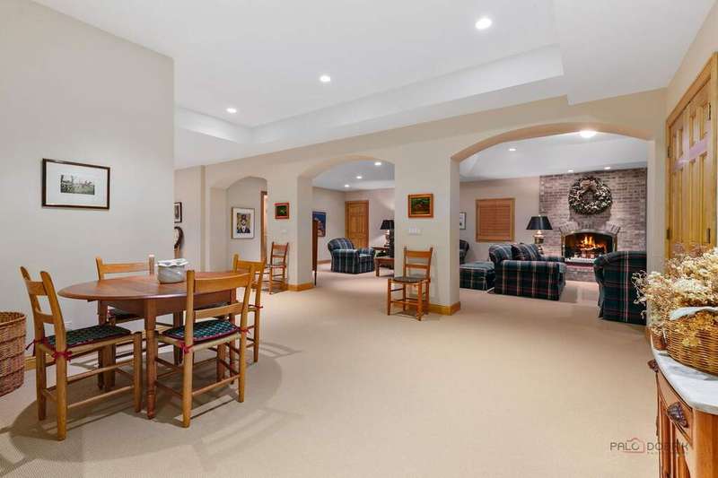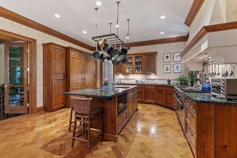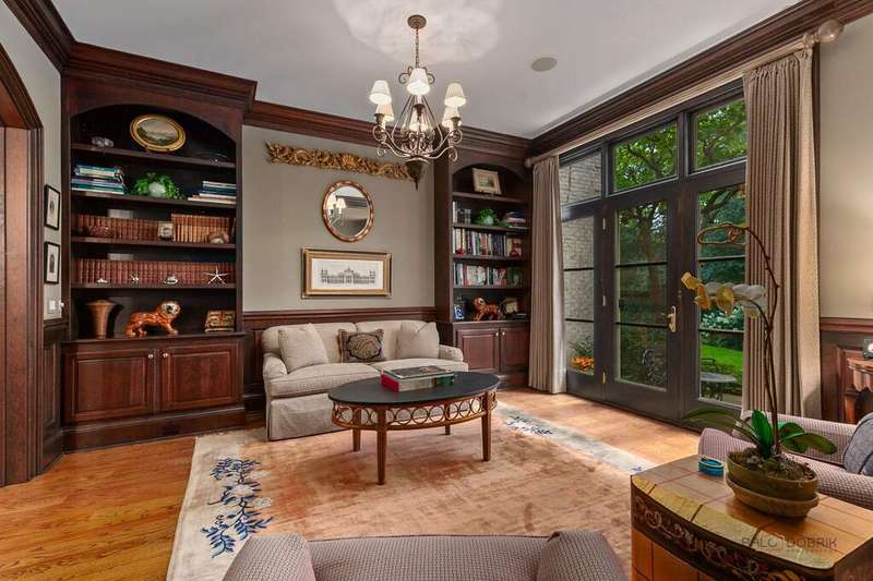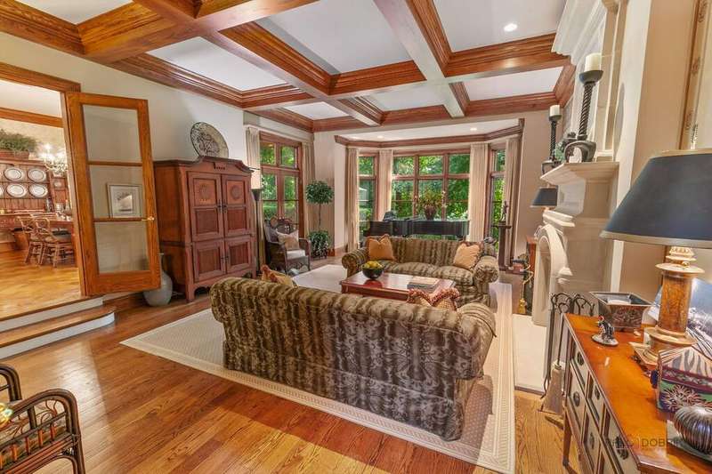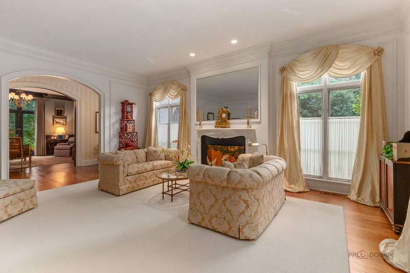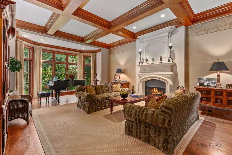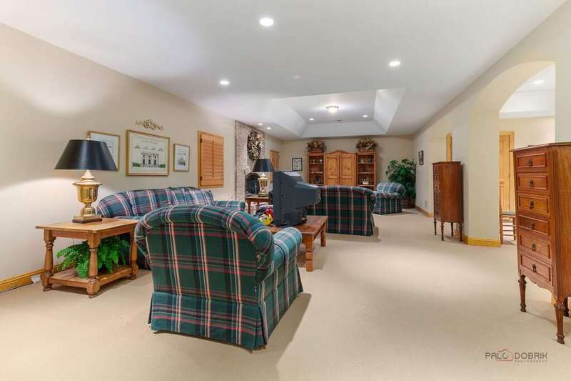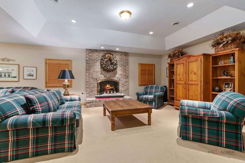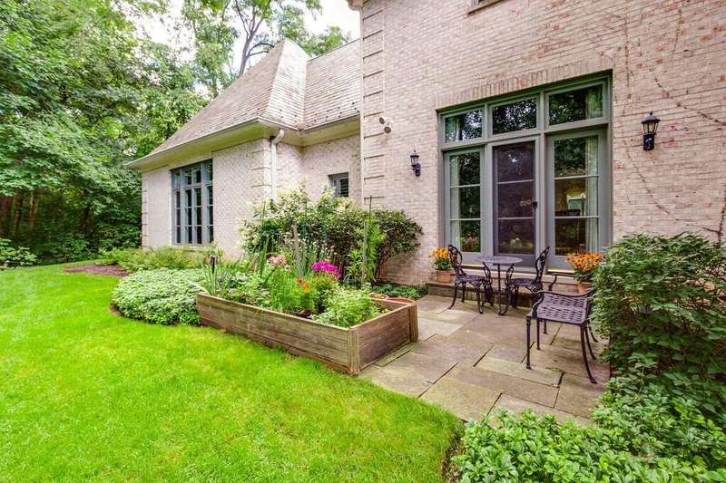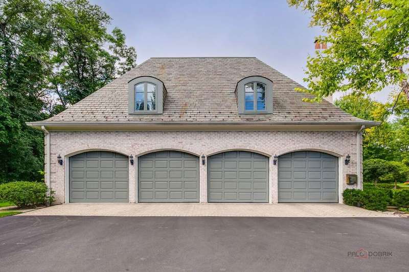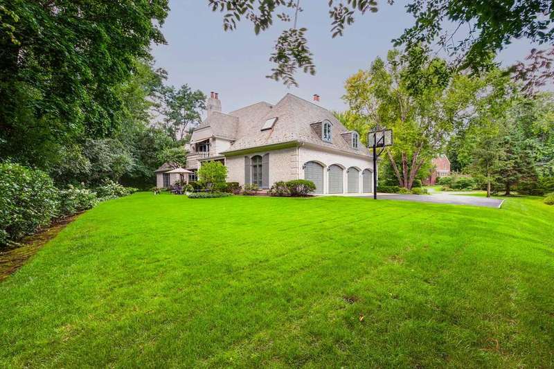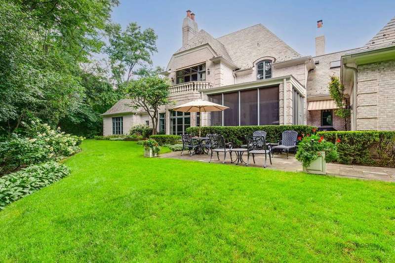 Tucked away on 1.4 pristine acres along a private lane just minutes from downtown Lake Forest, this stately French Normandy-style residence exudes timeless sophistication and exceptional craftsmanship. Custom-built in 1999 by Gene Martin, the home combines thoughtful design, solid construction, and luxurious finishes across more than 7,500 square feet of living space. The lime-washed brick facade welcomes you into a grand, two-story foyer with a sweeping staircase and herringbone oak hardwood floors. Flanking the entry, the formal living and dining rooms showcase exquisite millwork, floor-to-ceiling windows, Scalamandre window treatments, and twin gas fireplaces, creating an elegant symmetry ideal for entertaining. The de Giulio-designed kitchen is a chef's dream, featuring herringbone oak hardwood flooring, custom pine cabinetry, granite countertops, premium appliances (Viking, Sub-Zero, and Miele), a large island, and a sunlit breakfast area. Step down into the inviting family room, highlighted by a coffered ceiling, bay windows, and a stately, limestone fireplace. A handsome library with walnut built-in shelving w/ cabinets and access to a private patio provides an ideal home office. The main level also includes a spacious guest suite (or potential second primary bedroom) with a 14-foot tray ceiling, morning kitchen, and luxurious marble bath. A large, screened porch with a knotty pine, bead board ceiling and accessible via French doors from both the kitchen and family room, connects seamlessly to the bluestone patio, while the mudroom/laundry room leads to a heated 4-car garage. Upstairs, the 2nd floor landing features a wall of leaded glass panels that floods the space with light while facilitating views of the front of the property. The primary suite impresses with a 12-foot vaulted ceiling, a private balcony overlooking the grounds, a morning kitchen, an expansive walk-in closet with island, and a bonus room that can be used as a 2nd office or exercise space. The spa-like primary bath features dual vanities, a circular jetted tub, Sheryl Wagner faucetry, and a large walk-in shower. Three additional, sizable en suite bedrooms complete the second floor. The lower level offers 1,500 sq ft of finished living space and features a 2nd family room with fireplace, a game room, a full bathroom, and abundant storage. Outside, the professionally landscaped grounds feature mature trees, flowering gardens, a circular driveway, a slate roof, a sprinkler system, and multiple bluestone patios for outdoor entertaining. Perfectly located close to downtown Lake Forest, the Metra, shopping, dining, Lake Michigan, and major highways, this remarkable home blends timeless French elegance with modern comfort and convenience.