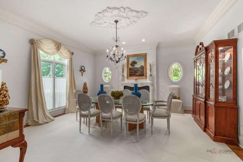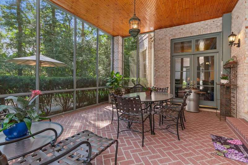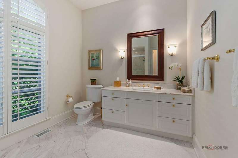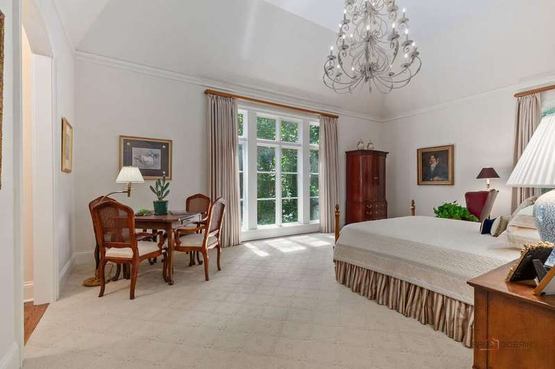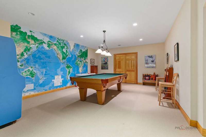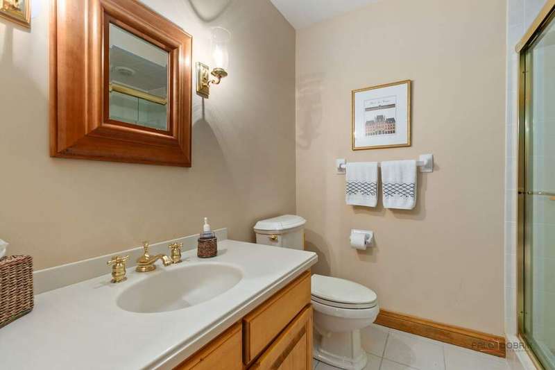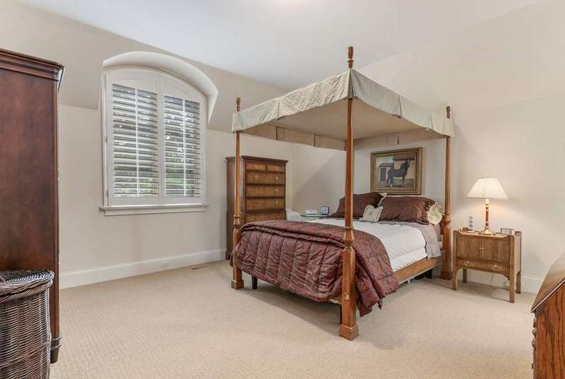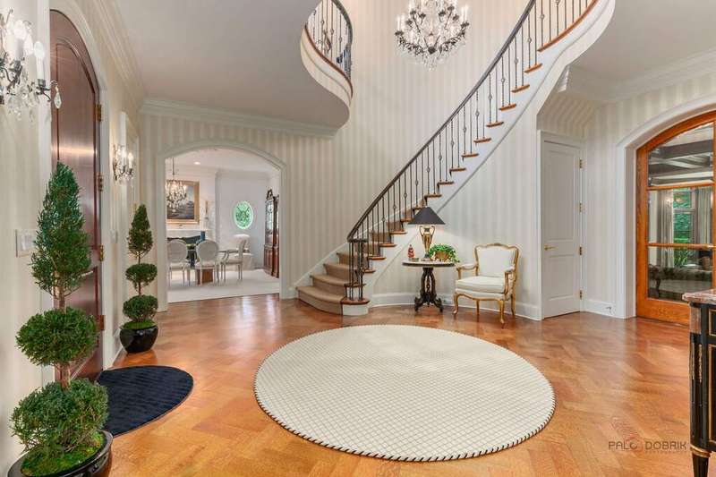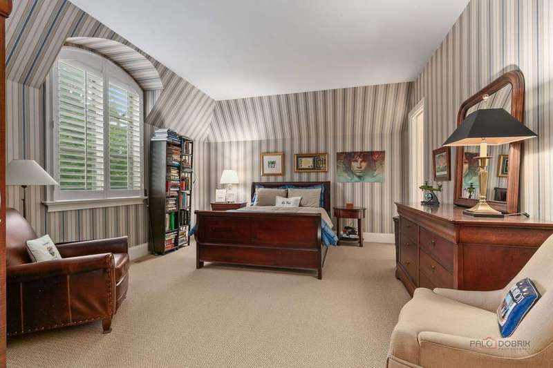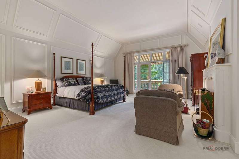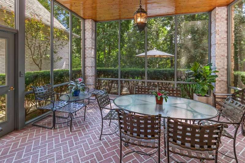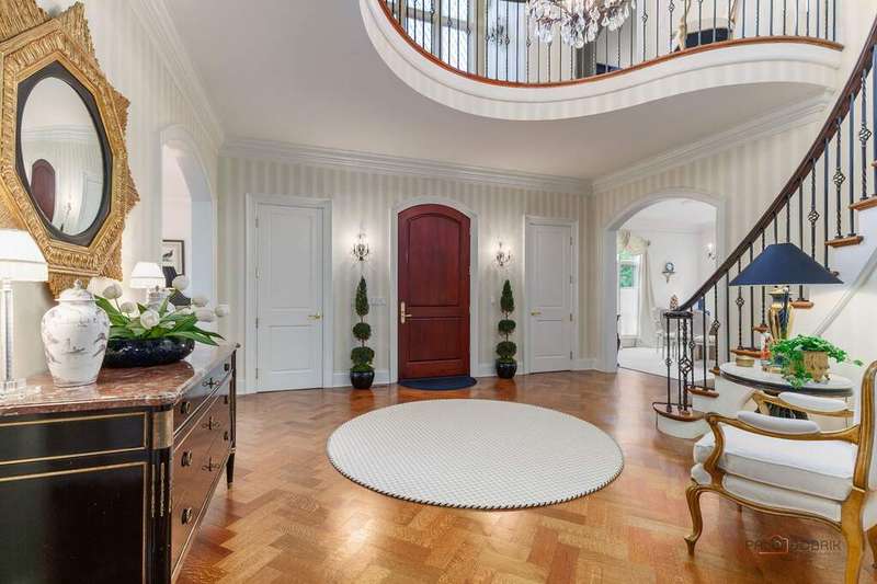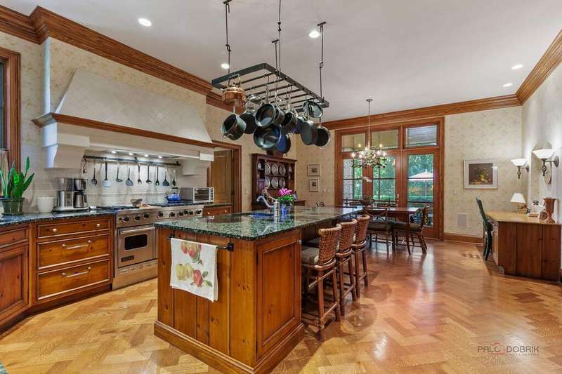 Tucked away on 1.4 pristine acres along a private lane just minutes from downtown Lake Forest, this stately French Normandy-style residence exudes timeless sophistication and exceptional craftsmanship. Custom-built in 1999 by Gene Martin, the home combines thoughtful design, solid construction, and luxurious finishes across more than 7,500 square feet of living space. The lime-washed brick facade welcomes you into a grand, two-story foyer with a sweeping staircase and herringbone oak hardwood floors. Flanking the entry, the formal living and dining rooms showcase exquisite millwork, floor-to-ceiling windows, Scalamandre window treatments, and twin gas fireplaces, creating an elegant symmetry ideal for entertaining. The de Giulio-designed kitchen is a chef's dream, featuring herringbone oak hardwood flooring, custom pine cabinetry, granite countertops, premium appliances (Viking, Sub-Zero, and Miele), a large island, and a sunlit breakfast area. Step down into the inviting family room, highlighted by a coffered ceiling, bay windows, and a stately, limestone fireplace. A handsome library with walnut built-in shelving w/ cabinets and access to a private patio provides an ideal home office. The main level also includes a spacious guest suite (or potential second primary bedroom) with a 14-foot tray ceiling, morning kitchen, and luxurious marble bath. A large, screened porch with a knotty pine, bead board ceiling and accessible via French doors from both the kitchen and family room, connects seamlessly to the bluestone patio, while the mudroom/laundry room leads to a heated 4-car garage. Upstairs, the 2nd floor landing features a wall of leaded glass panels that floods the space with light while facilitating views of the front of the property. The primary suite impresses with a 12-foot vaulted ceiling, a private balcony overlooking the grounds, a morning kitchen, an expansive walk-in closet with island, and a bonus room that can be used as a 2nd office or exercise space. The spa-like primary bath features dual vanities, a circular jetted tub, Sheryl Wagner faucetry, and a large walk-in shower. Three additional, sizable en suite bedrooms complete the second floor. The lower level offers 1,500 sq ft of finished living space and features a 2nd family room with fireplace, a game room, a full bathroom, and abundant storage. Outside, the professionally landscaped grounds feature mature trees, flowering gardens, a circular driveway, a slate roof, a sprinkler system, and multiple bluestone patios for outdoor entertaining. Perfectly located close to downtown Lake Forest, the Metra, shopping, dining, Lake Michigan, and major highways, this remarkable home blends timeless French elegance with modern comfort and convenience.