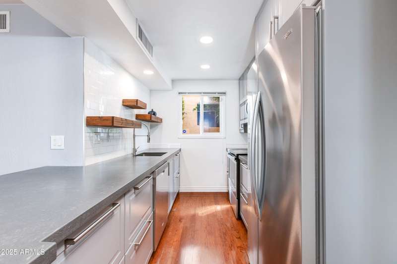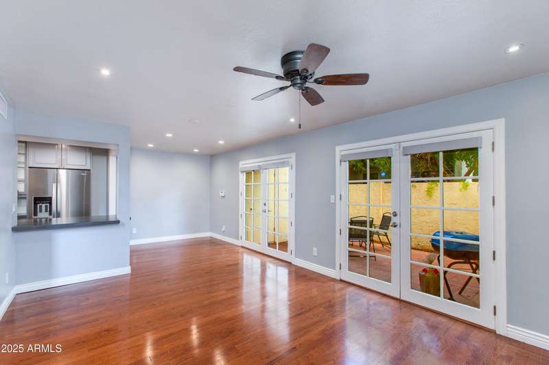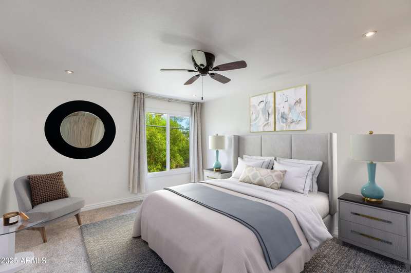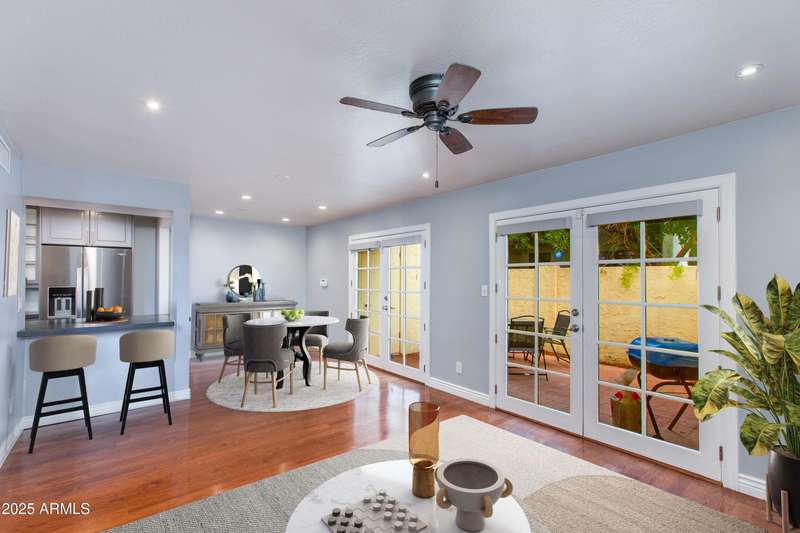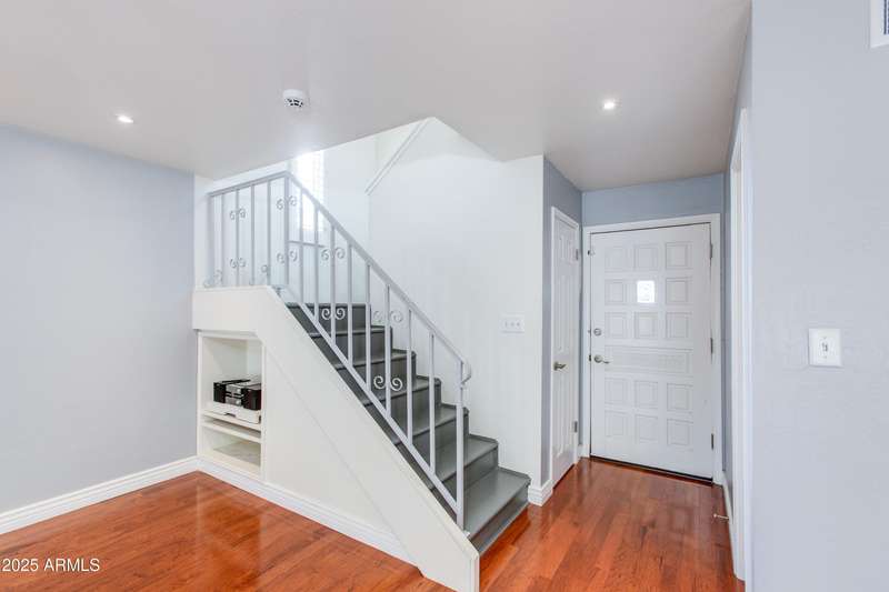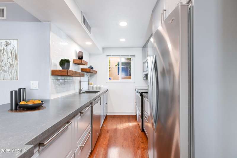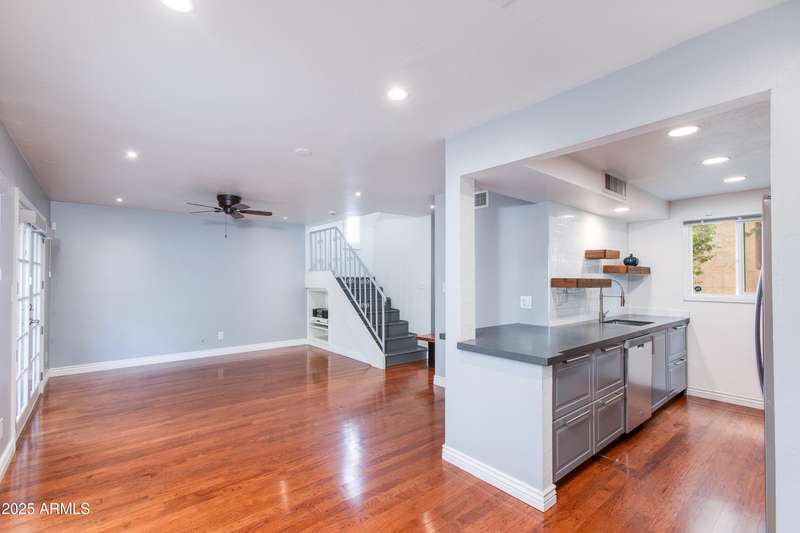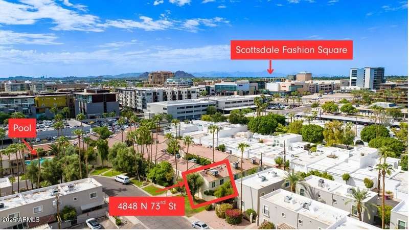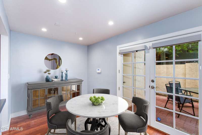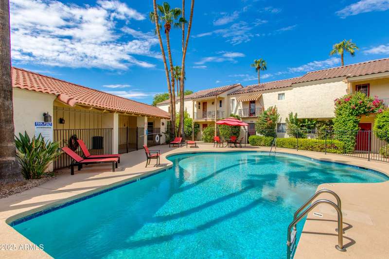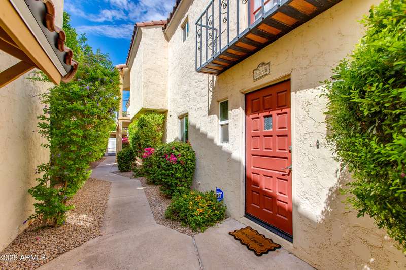 Discover this rare end-unit townhouse in the desirable Sarkis Manor community! Offering 2 bedrooms, 1.5 bathrooms, and 2 covered parking spaces, this home combines charm with convenience. The spacious layout is filled with natural light thanks to its end-unit placement and abundant windows. The main level features real hardwood floors, an inviting living space, and a generous private patio perfect for entertaining or relaxing outdoors. The updated kitchen features timeless cabinetry, modern appliances, and plenty of counter space, blending style with everyday function and convenience. Upstairs, both bedrooms have just been re-carpeted, creating a fresh and comfortable retreat. The patio includes a large storage unit with a stackable washer and dryer. HOA fees incl. water and garbage. Thoughtful updates throughout make this home move-in ready. Ideally located near the canal with easy access to biking and walking trails, Sarkis Manor also places you minutes from Fashion Square, Old Town Scottsdale's dining and nightlife, and local favorites like Postino's. This is a rare opportunity to own a bright and spacious end unit in one of Scottsdale's hidden gemsdon't miss it!
