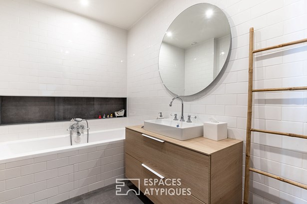 Upon entering, the cathedral-style living room impresses with its 5.90 m high ceiling and two large full-height windows, bathing the space in natural light and highlighting the spectacular volumes.