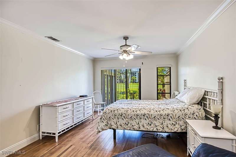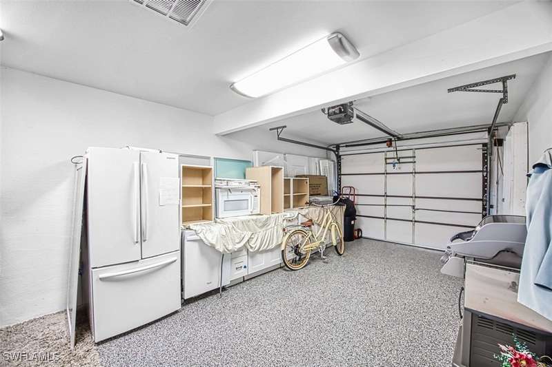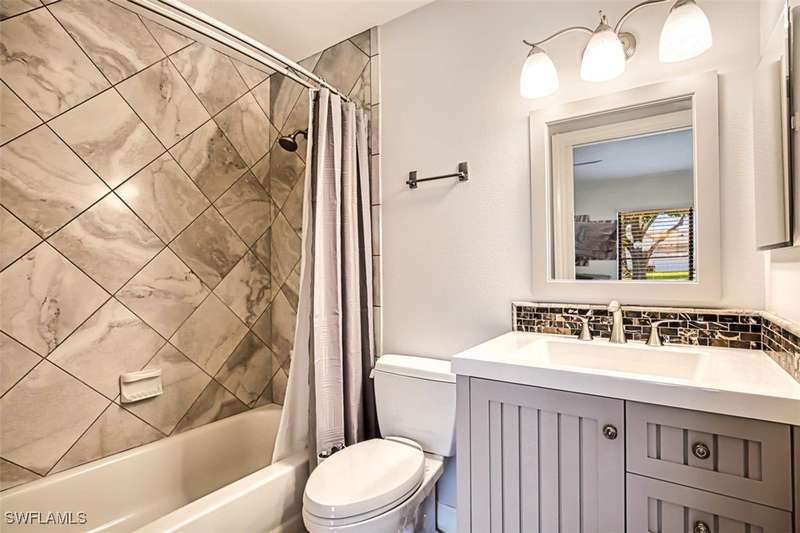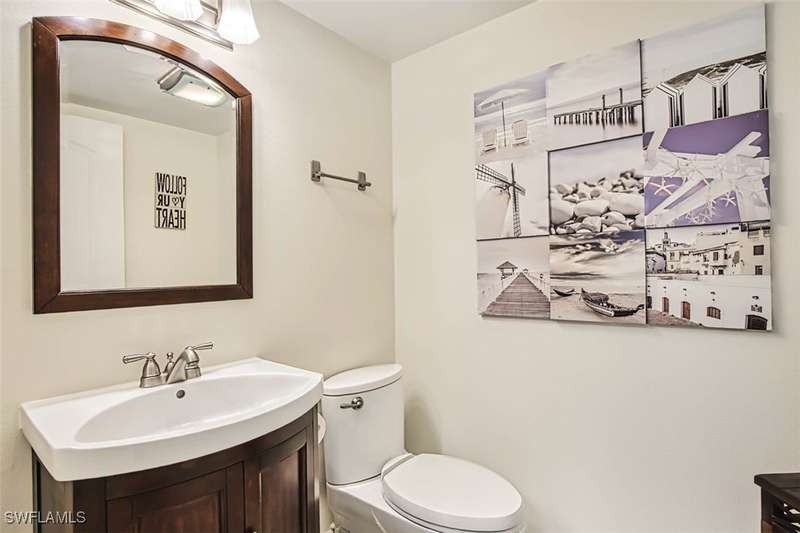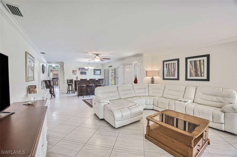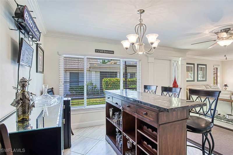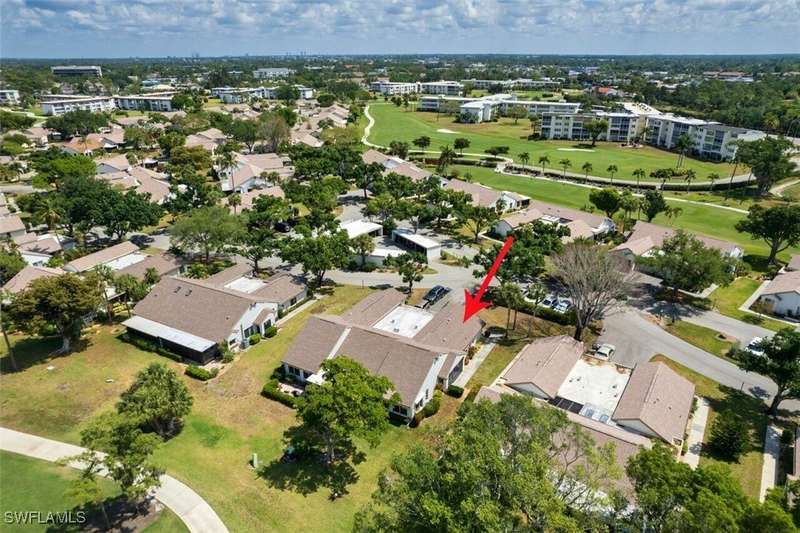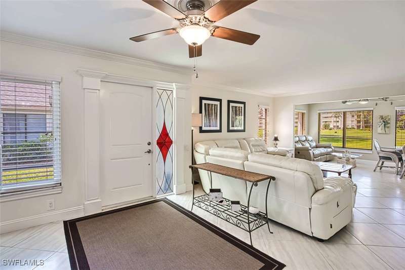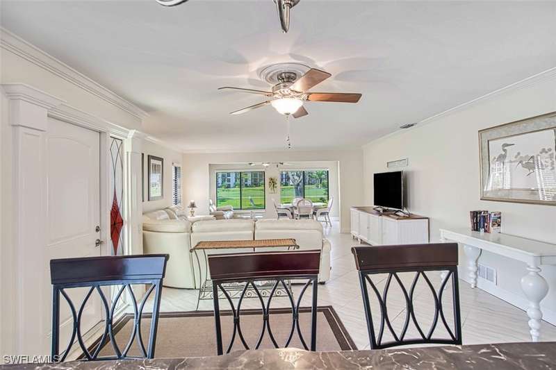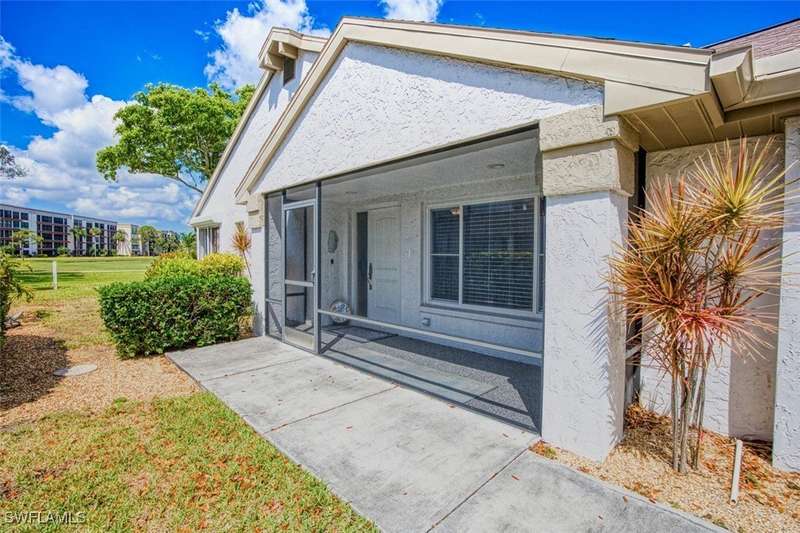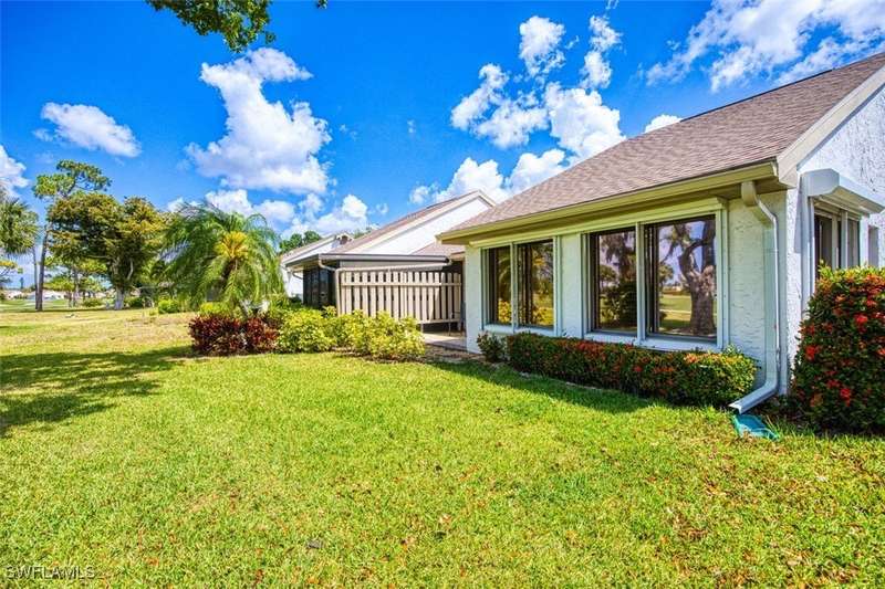 Welcome to resort style living at its finest. This stunning 2 bedroom 2.5 bath Valencia model Garden Villa situated on the 9th fairway gives you plenty of living space with just under 1600 sq ft. A private screened sitting area leads you to an entry foyer with diagonal tile through out main living area. Large eat in kitchen with granite counter tops, luxury vinyl flooring tiled back splash and recessed lighting. Oversized living room with separate sitting area to enjoy your morning coffee or a peaceful sunset. Sliders from living room and owners suite to a private patio area. Main bedroom boasts tiled walk in shower, raised vanity and plenty of closet space. Guest room is located far enough away for your guests privacy with their own bathroom and large walk in closet. Half bath is a bonus in this model as both owners and guests have complete privacy when entertaining. Impact window (kitchen) as well as manual shutters for added peace of mind. Electric garage screen, front load washer and dryer, AC unit 2018, New roof 2023, UNIT BEING SOLD TURNKEY. Seven Lakes a true bundled 55+ active golf and tennis community with no transfer, green or trail fees- giving you unlimited golf on the 18 hole executive course. 6 heated pools throughout community, tennis pavilion, pickle ball, bocce, on site restaurant with no minimum, auditorium for many socials and dances, movies and concerts, on site golf pro, fitness center, wood shop, billiards, full service Lifestyle department to keep you up to date on all the activities in the community as well as bus trips. Enjoy, trivia, karaoke, bingo, art classes, card games, lapidary, line dances and many clubs to keep you social. Centrally located across from Bell Tower Shops, restaurants, shopping. Minutes to Barbara B Mann Theater, Lakes Park, RSW Airport and beaches. Pet friendly community 1 pet under 25 lbs- Monthly condo fees includes all excluding electric. A tour of the community is well worth your time.