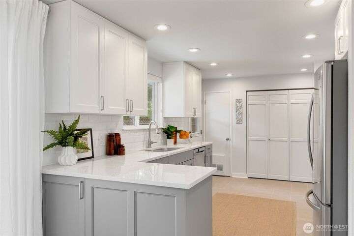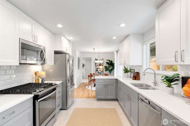 Welcome to this charming Edmonds rambler on a spacious, park-like lot! Filled with natural light and timeless finishes, this well-maintained home features a modern chef’s kitchen that opens to a bright dining area with sliders to the backyard. Oak hardwoods add warmth throughout. Three bedrooms and an updated full bath are tucked into one wing for privacy. A versatile fourth bedroom with its own half bath and laundry offers space for guests, a home office, or studio. The fully fenced backyard boasts a large patio—perfect for entertaining, gardening, or relaxing. All in a prime Edmonds location near transit, top-rated schools, and favorites like Café Ladro and Bar Dojo. A true Edmonds gem!