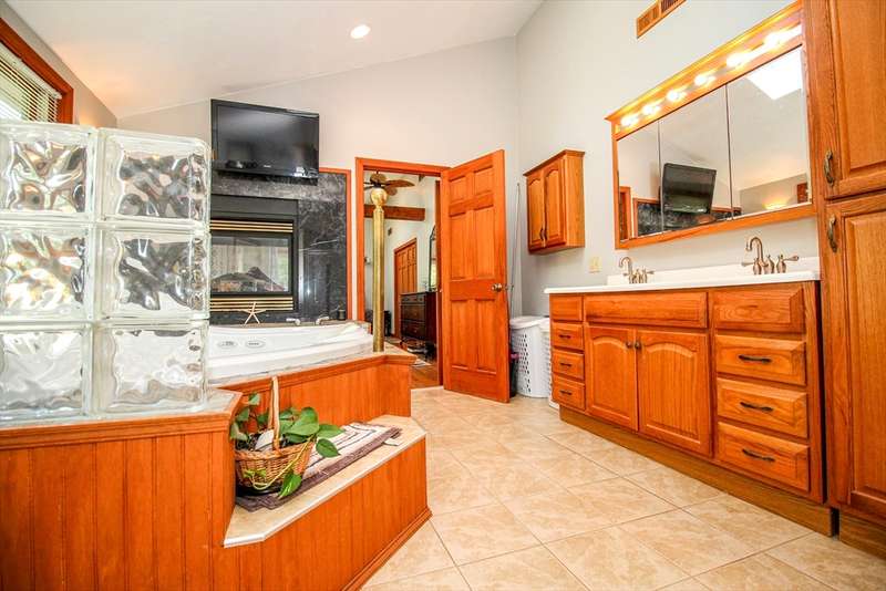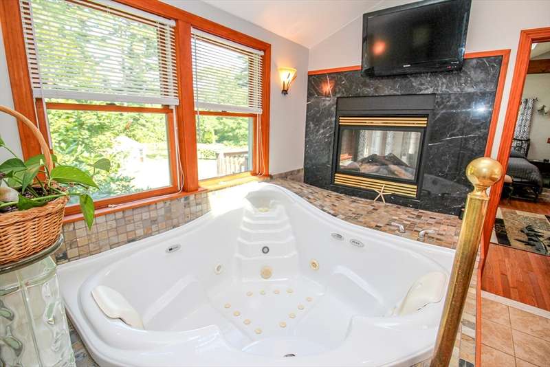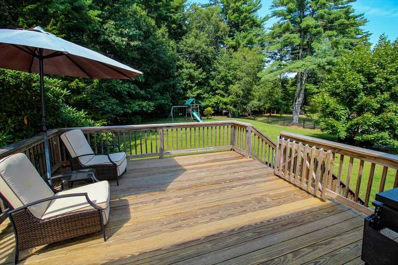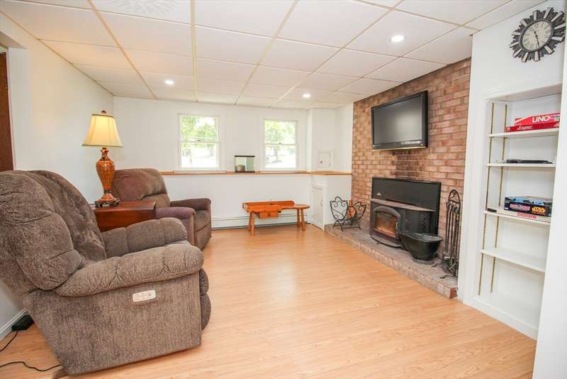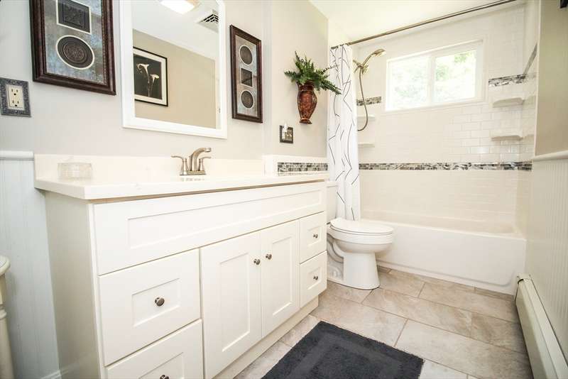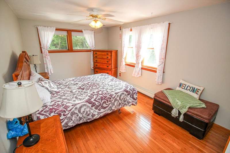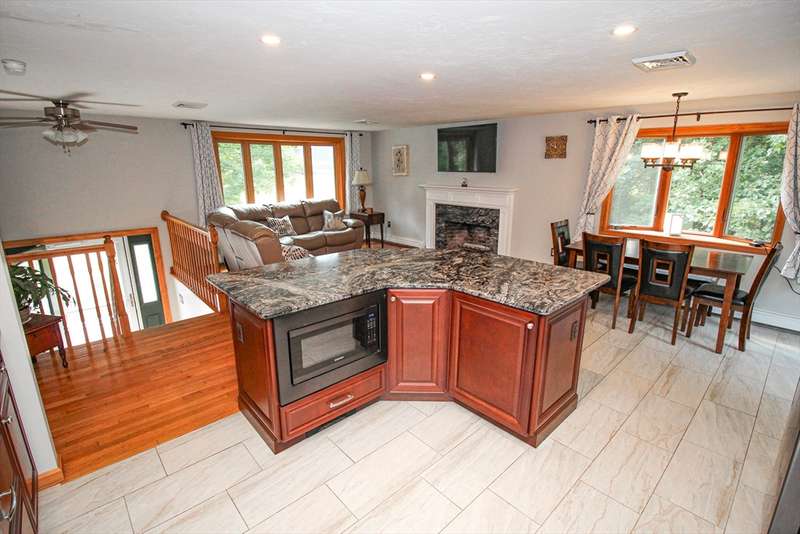 Grab your paddles and enjoy direct Jones River access from this expanded and tastefully customized five-bedroom, 2.5-bath split-entry ranch on a quiet dead-end cul-de-sac. Doubled in size in the early '00s and enhanced with a 2018 kitchen remodel by a master contractor, the home blends modern updates with New England charm. The kitchen boasts Cherry cabinetry, a farmhouse fireclay sink, and dramatic Black Forest granite counters that continue into the living room fireplace surround. Hardwood floors flow throughout, while the primary suite impresses with vaulted ceilings, private deck access, and a spa-like bath featuring a jacuzzi tub and double-sided fireplace. The finished lower level offers a spacious rec room with wood stove and walkout to a covered patio, perfect for entertaining. Outside, enjoy a large yard with mature trees, sheds, and space for gatherings. With a 6-bedroom septic, this five-bedroom home also offers flexibility for future expansion. House not in flood zone!