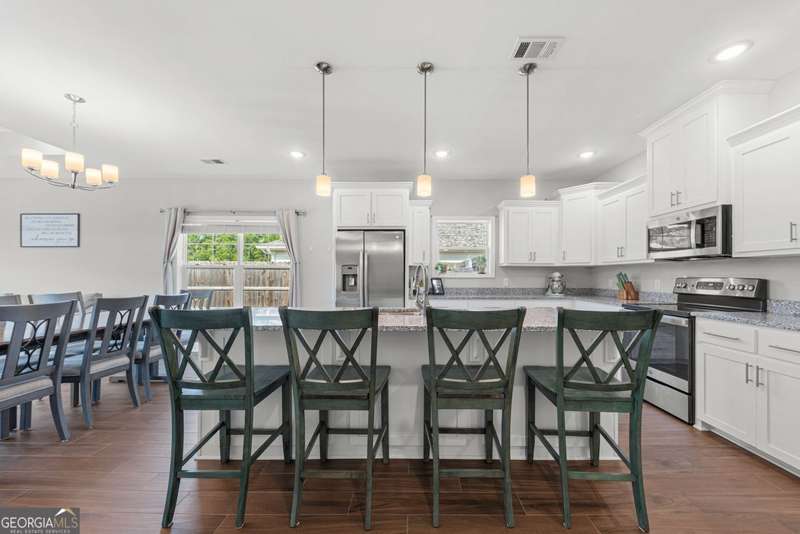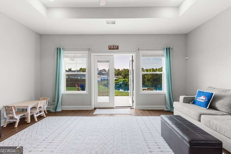 Wake up to peaceful water views every day in this immaculate lakefront home! Overlooking a 2.3-acre pond in St. Marys, this 3 bedroom, 2 bath home offers no HOA, Flood Zone X (no flood insurance required), and a convenient location just minutes from Kings Bay Naval Base, downtown waterfront, shopping, and dining. Inside, the open floor plan features wood-grain plank tile throughout, foyer entry, recessed lighting, smooth ceilings, wide baseboards, and ceiling fans in all bedrooms and the living room. The fully equipped kitchen shines stainless steel appliances, white shaker cabinets with crown molding and soft close hinges, granite countertops and a central island with breakfast bar (lots of counter space). The large laundry room adds convenience with built-in cabinets, a window for natural light, and extra space for shelving or baskets. The primary suite includes a tray ceiling, spacious walk-in closet, linen closet, and a private bath with raised double vanities, granite counters and water closet with a cabinet. Additional recessed lighting in the laundry and guest bath provide a bright, modern feel throughout. Built with 26 exterior walls, concrete composite lap siding, and an architectural shingle roof, this home is designed for durability and easy maintenance. Outdoor living spaces include a welcoming front porch and an open back patio overlooking the lake. A Hydro 5 water system is also included. This home has been lovingly maintained and is move-in ready for its next owner!