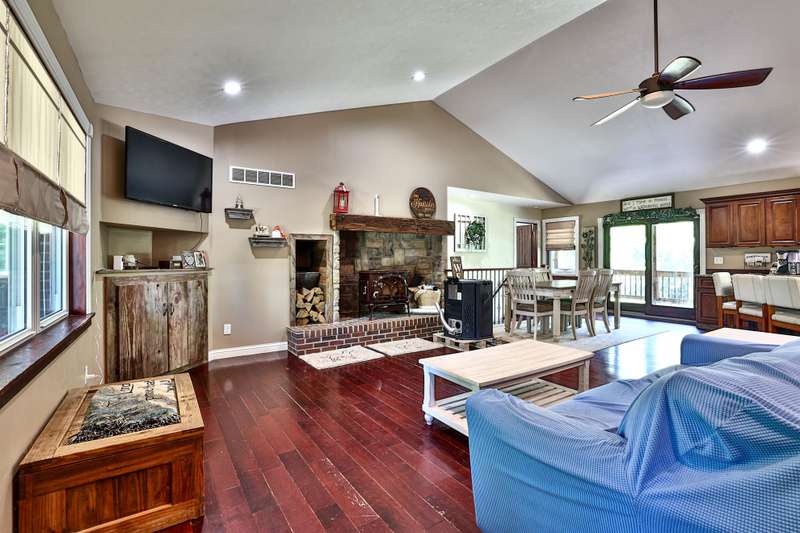 Welcome to this stunning 3 bedroom, 3.5 bath custom-built ranch home nestled on 4.79 private acres. Enjoy the outdoors with a wraparound deck, above-ground swimming pool with attached deck, spacious fenced-in yard, and firepit area perfect for entertaining. Step inside to an open-concept layout featuring hardwood floors throughout, a bright eat-in kitchen with pantry, a large great room, and a dining room with walkout to the covered deck. The owner's suite offers a walk-in closet, adjoining bath, and private walkout access to the deck. A spacious laundry room connects to the attached garage for added convenience. The partially finished basement includes a full bath, ample storage, kitchen area, additional flex room ideal for an office or bedroom, and walkout to the backyard. A 3-car detached garage provides even more space with unfinished office potential and an additional fenced area.