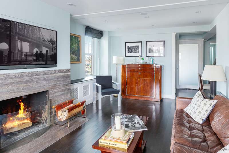 The oversized corner living room boasts dual sun-filled open city views West and North of land marked townhouses, gardens, and the city skyline A wood burning fireplace with custom stone surround - which only occurs above the 10th floor- ensures warmth and ambiance all fall and winter.