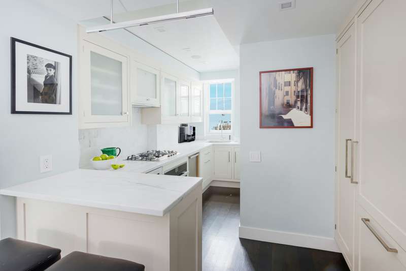 The piece du resistance is the gourmet kitchen with full size Sub-Zero, custom grey lacquered cabinetry, pantry, honed Carrera marble counters, and ample storage and cooking space and offers a dining bar for a deux - the perfect spot for a laptop and coffee.