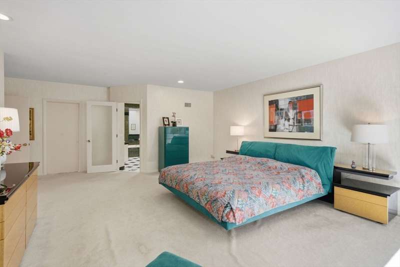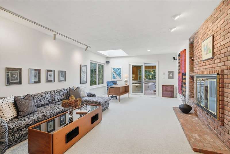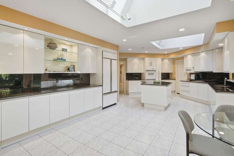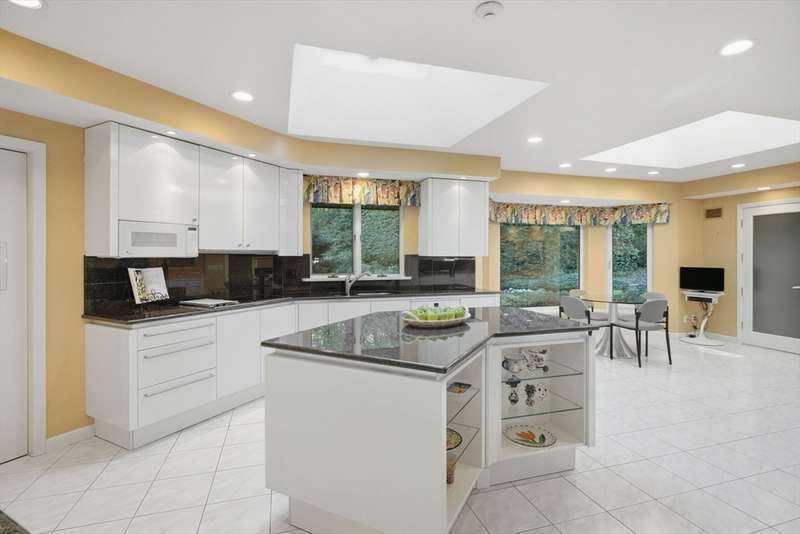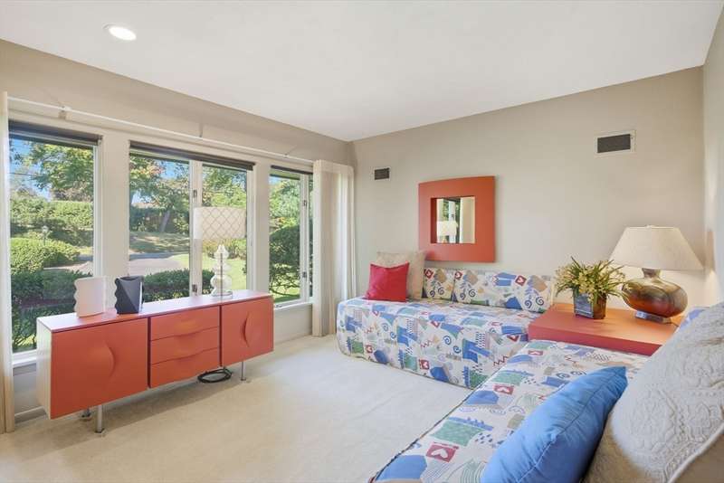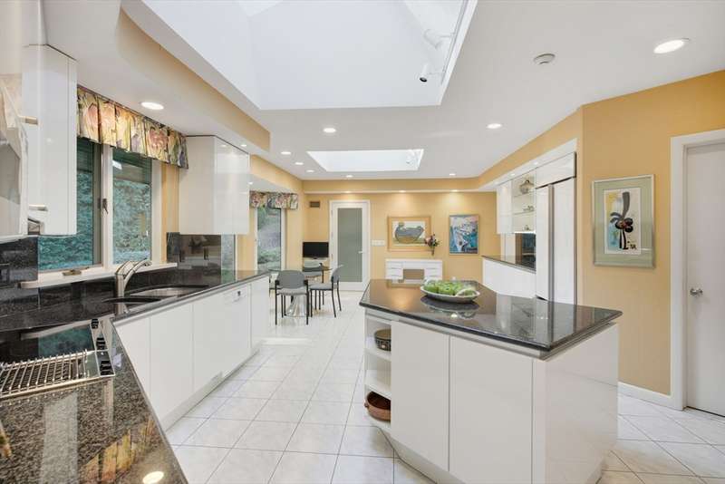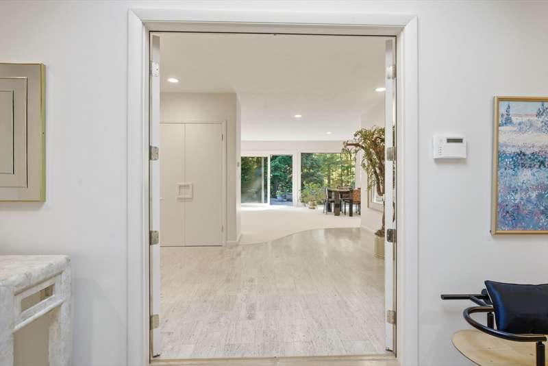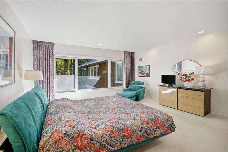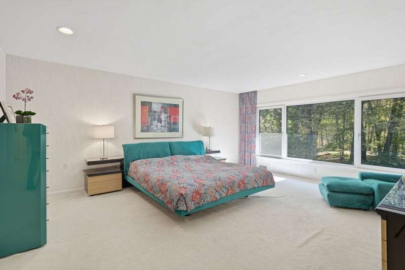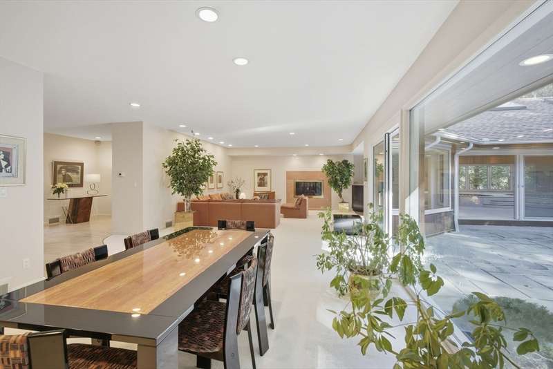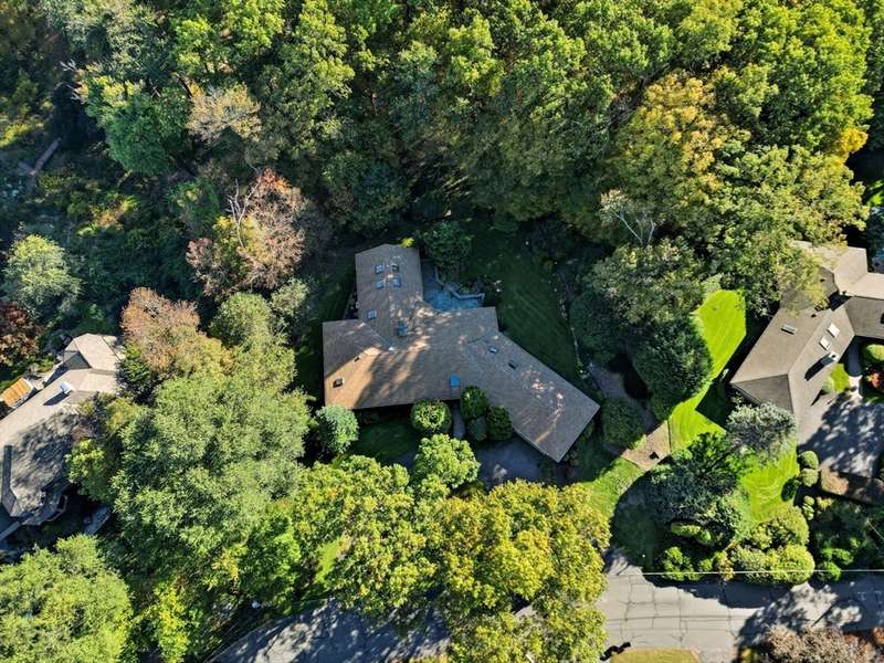 Nestled on private grounds that evoke serenity, this executive ranch offers versatile floorplan & exceptional craftsmanship for a lifestyle of luxury & relaxation. Large windows throughout frame tranquil wooded views & flood interior w/natural light. Gracious front entry welcomes w/sightlines in all directions from the dramatic living & dining room adorned w/double-sided fireplace, custom bar, walls of glass to expansive bluestone patio beyond. Gourmet kitchen features granite tops, sleek white Poggenpohl cabinetry, eating area & adjacent laundry room. Family room, anchored by brick fireplace & entertainment center, leads to sunroom/indoor pool addition w/vaulted ceiling, 3 walls of windows & cedar lined walls. Private bedroom wing showcases large primary suite w/full bath & walk-in closet. Second ensuite bedroom has double closets & stylishly updated full bath ( 17) w/high-end finishes. Inviting interiors & exceptional design, this home blends sophistication & comfort in prime area.