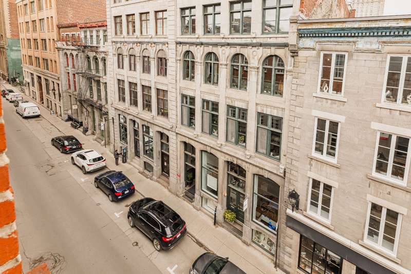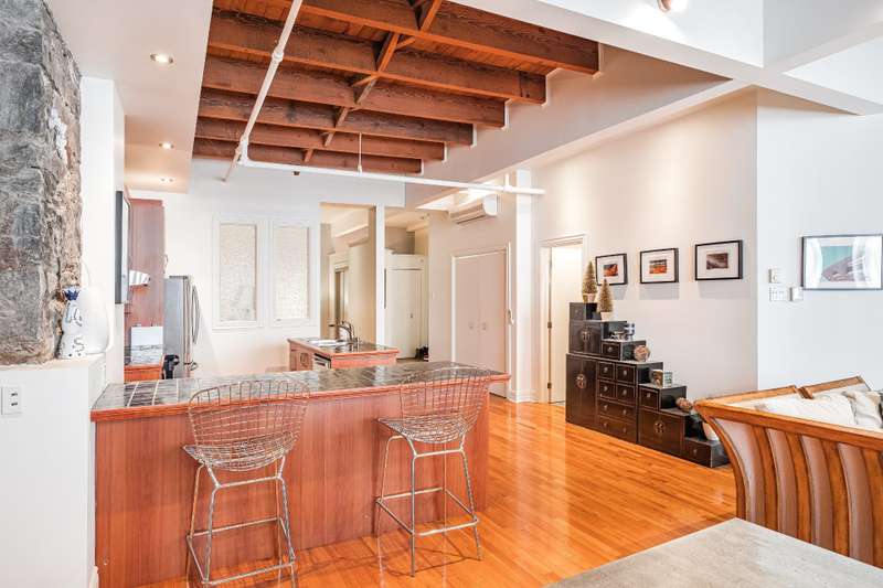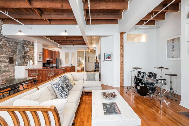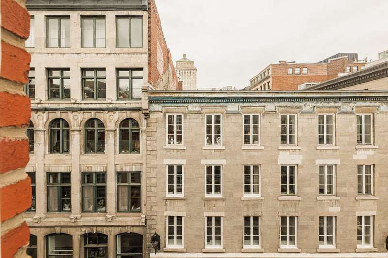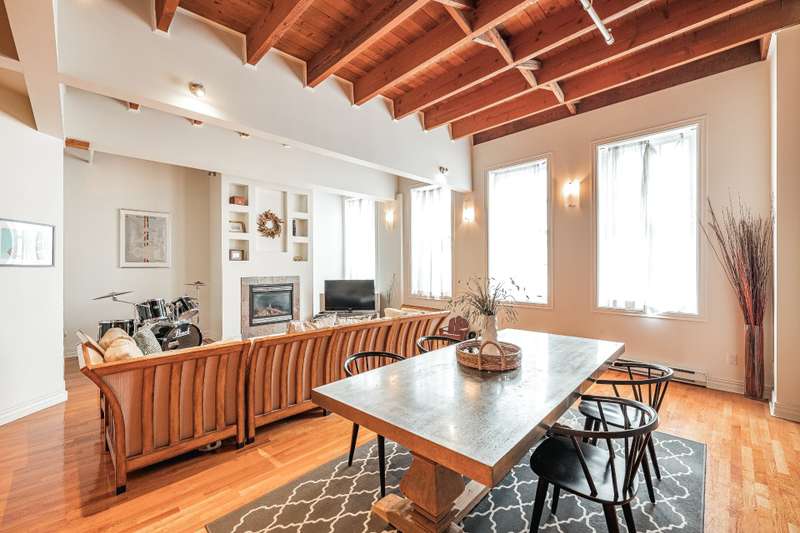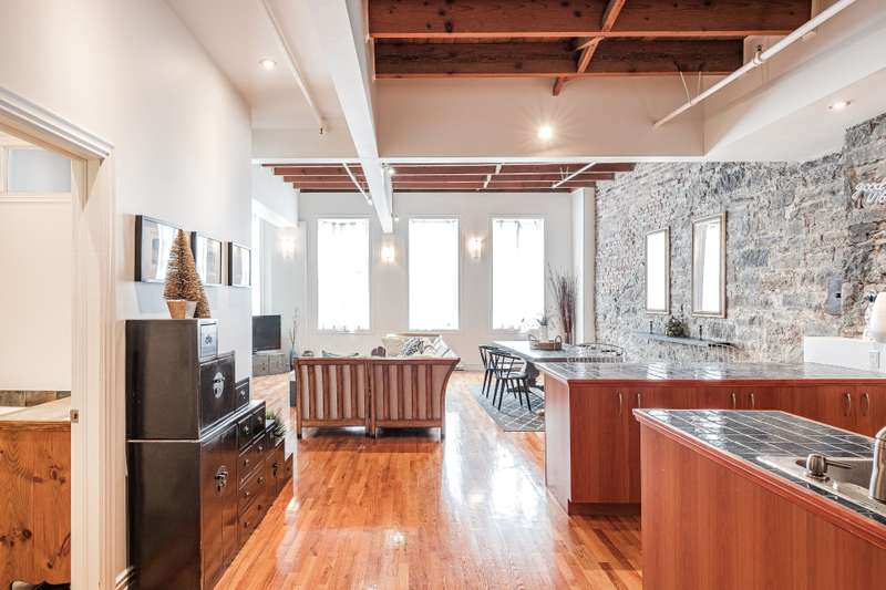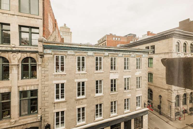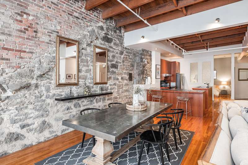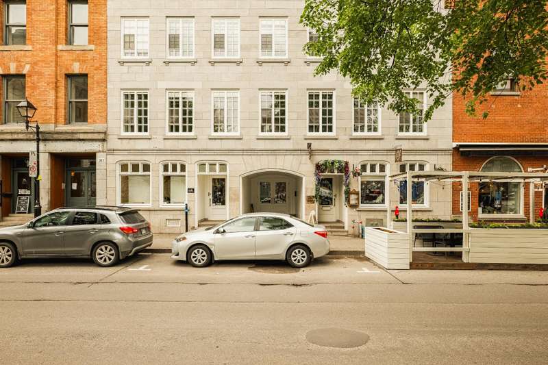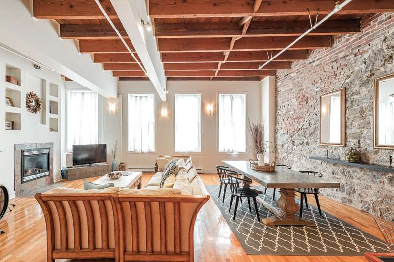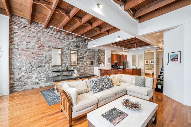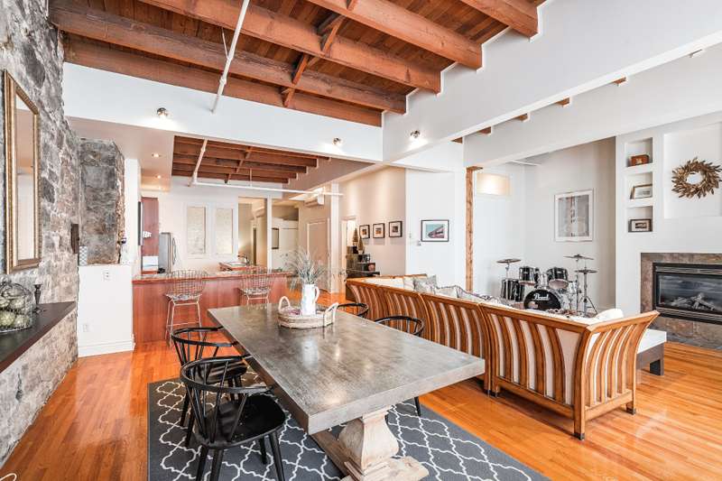 Iconic top-floor loft on Place d'Youville in Old Montreal. Soaring 15' ceilings, exposed beams, hardwood floors, stone wall, and French windows overlooking Olive & Gourmando. Open-concept living with gas fireplace, dining area, and dual-island kitchen. Spacious bathroom with soaker tub and separate shower. Located in a quiet 11-unit historic building with elevator, private locker, and nearby parking. Steps from the Old Port, Notre-Dame Basilica, top restaurants, Square Victoria metro and future REM station. Possibility to build your own private rooftop terrace. A rare opportunity!